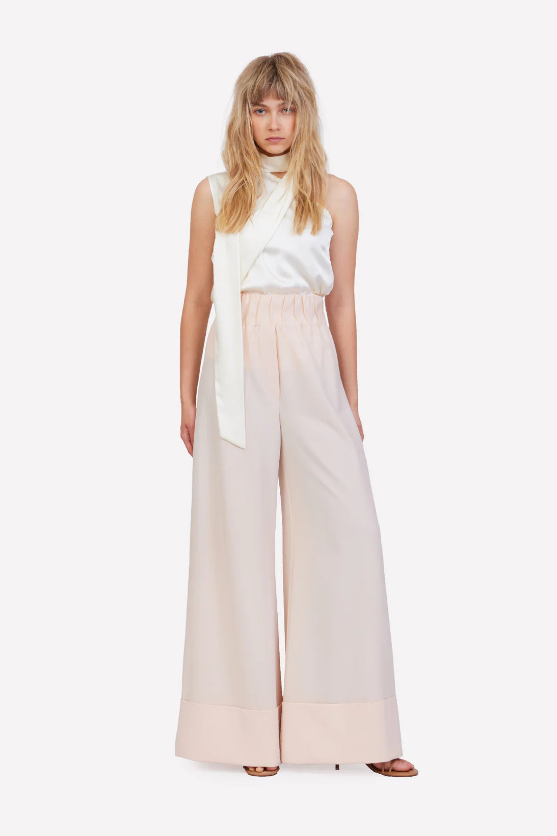 Add elevated ease to your wardrobe with these Peach Nude Flowy Palazzo Pants, crafted from premium soft-touch fabric that drapes beautifully with every step. Designed with a high-rise elastic waistband for comfort and oversized cuffs for architectural structure, these wide-leg trousers bring effortless polish to any look.