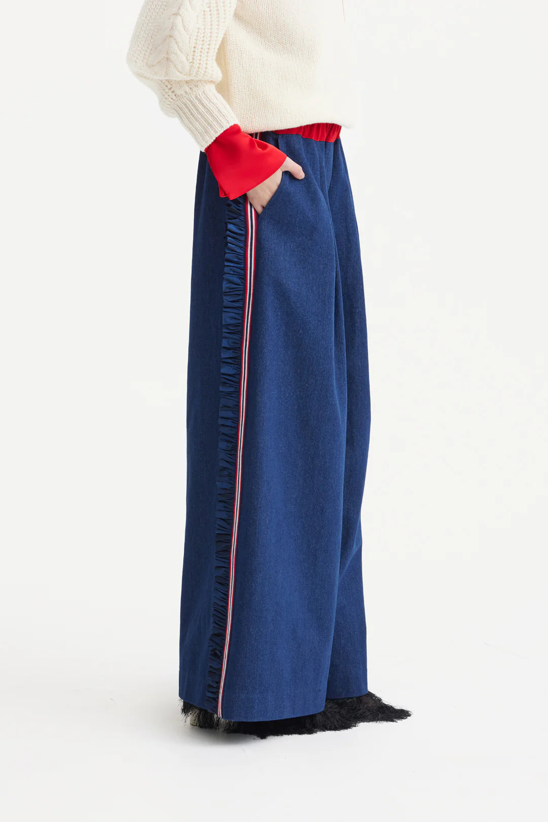Effortless comfort with a bold twist. These wide-leg denim trousers are made from medium-weight navy blue denim with a striking red elastic waistband. Designed for movement and style, they feature front pleats for structure and ruffled side trims accented by sporty red-white-blue stripes. The high-rise waist provides a flattering silhouette, blending relaxed ease with statement energy.