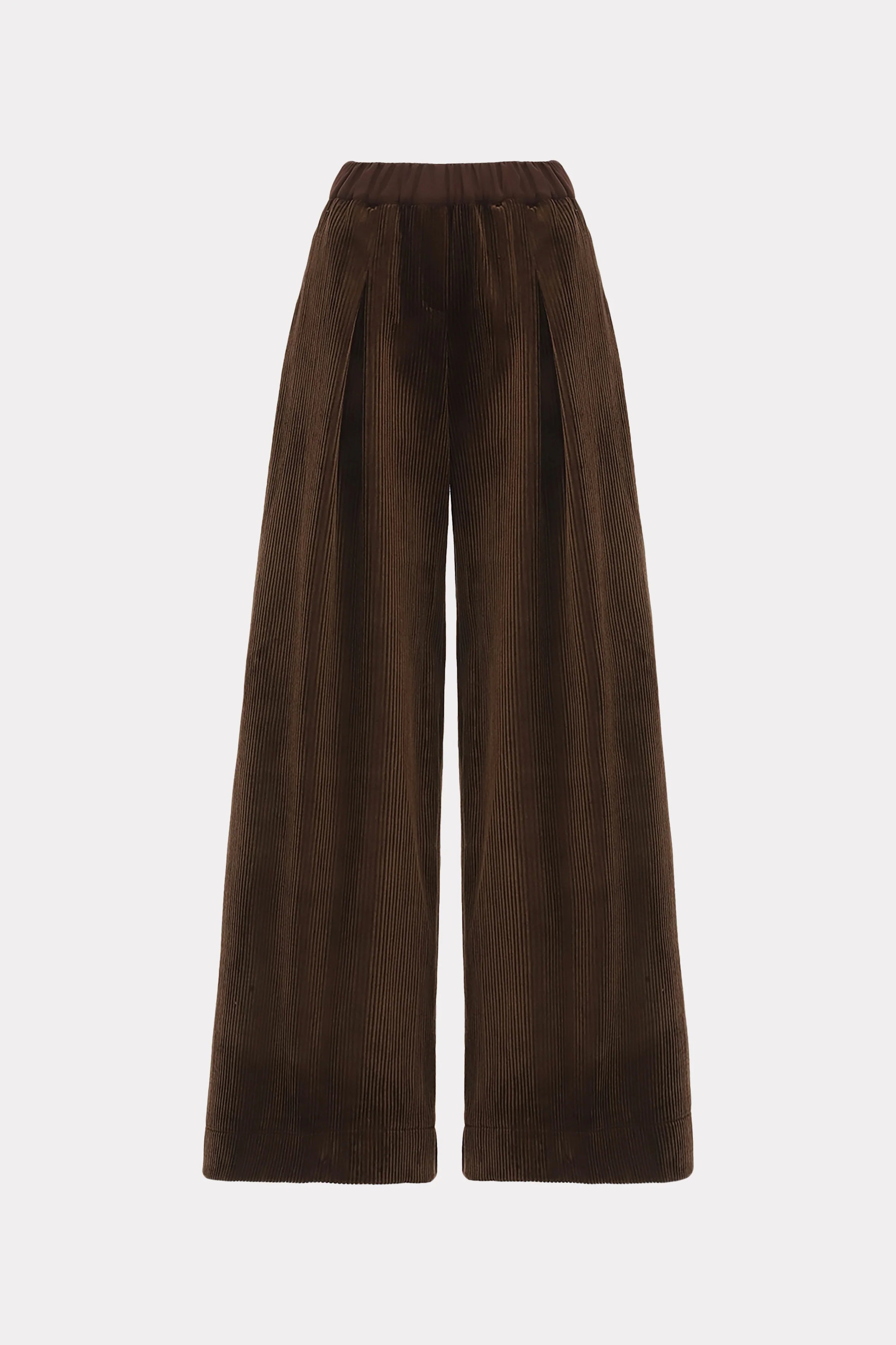 A modern nod to vintage elegance. These wide-leg trousers are crafted from dense, soft corduroy in a deep chocolate brown shade, offering texture, warmth, and movement. The high waist with an elastic band ensures comfort and a tailored fit, while the fluid, gently pleated legs create a relaxed yet elevated silhouette. Perfect for autumn and winter, these trousers transition seamlessly between workwear and casual sophistication. Pair them with silk shirts, knits, or structured blazers for a look that embodies effortless European refinement.