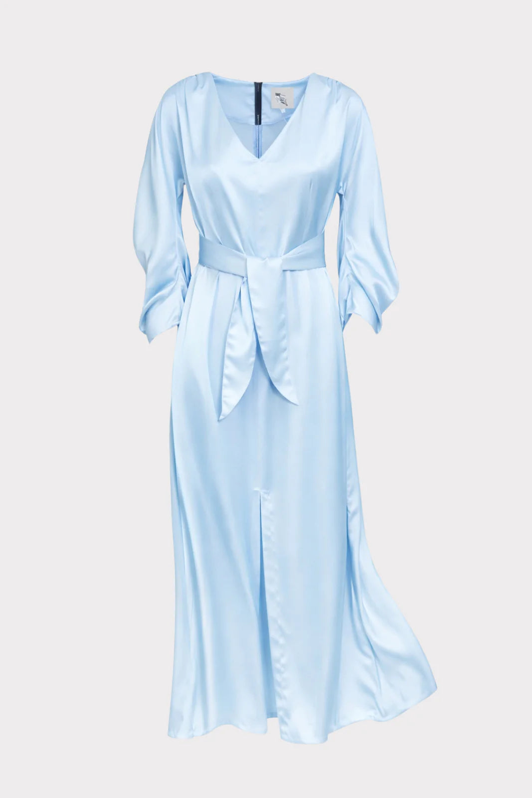 Ankle-length design · Satin fabric · V-neckline · Waist belt · Long gathered sleeves · Front slit detail · Back zip closure · Light blue tone