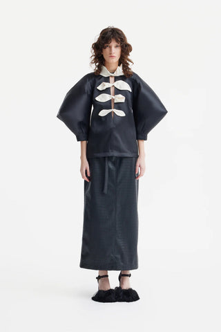 Designer Satin Blouse With Bishop Sleeves And Stand Collar – Print