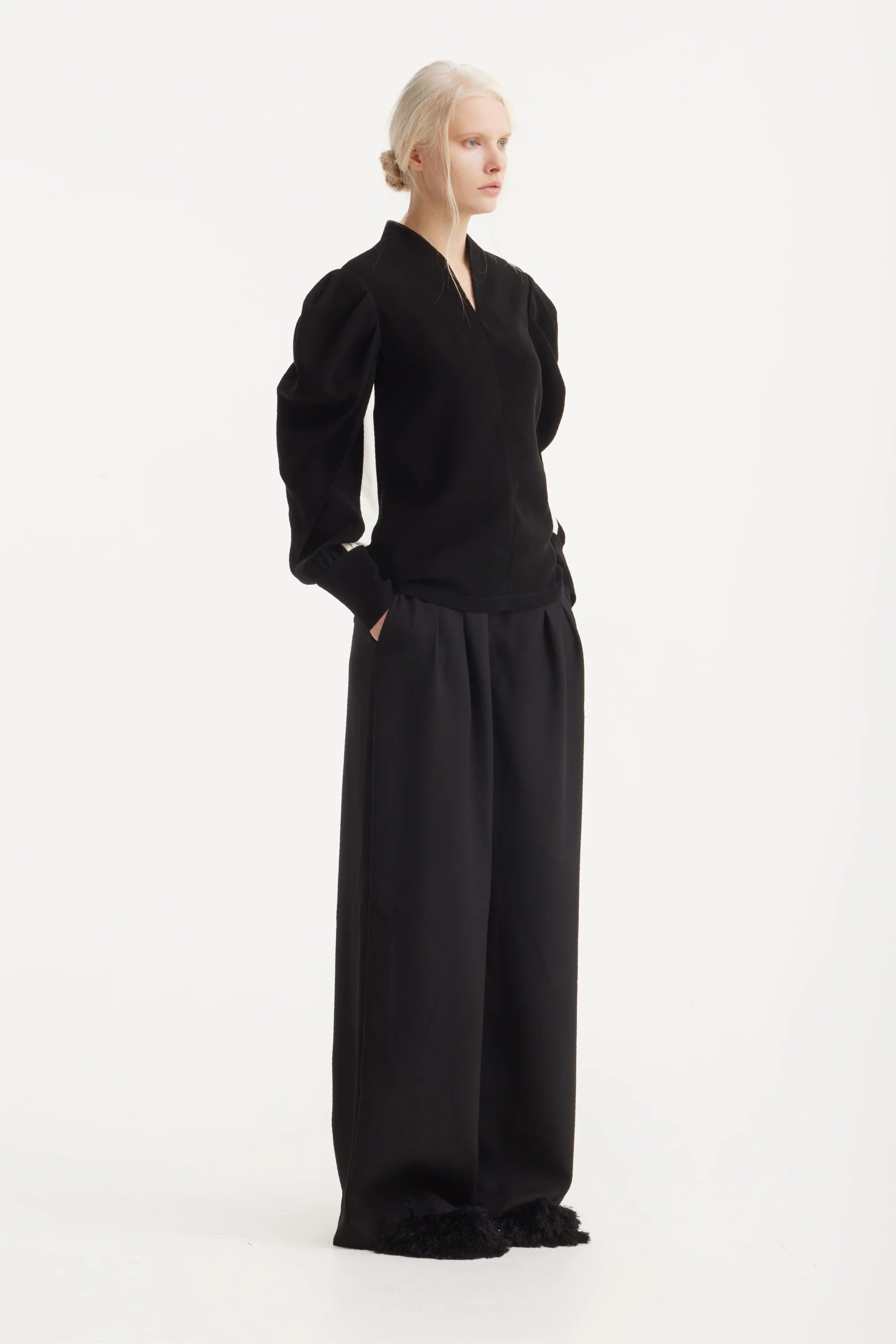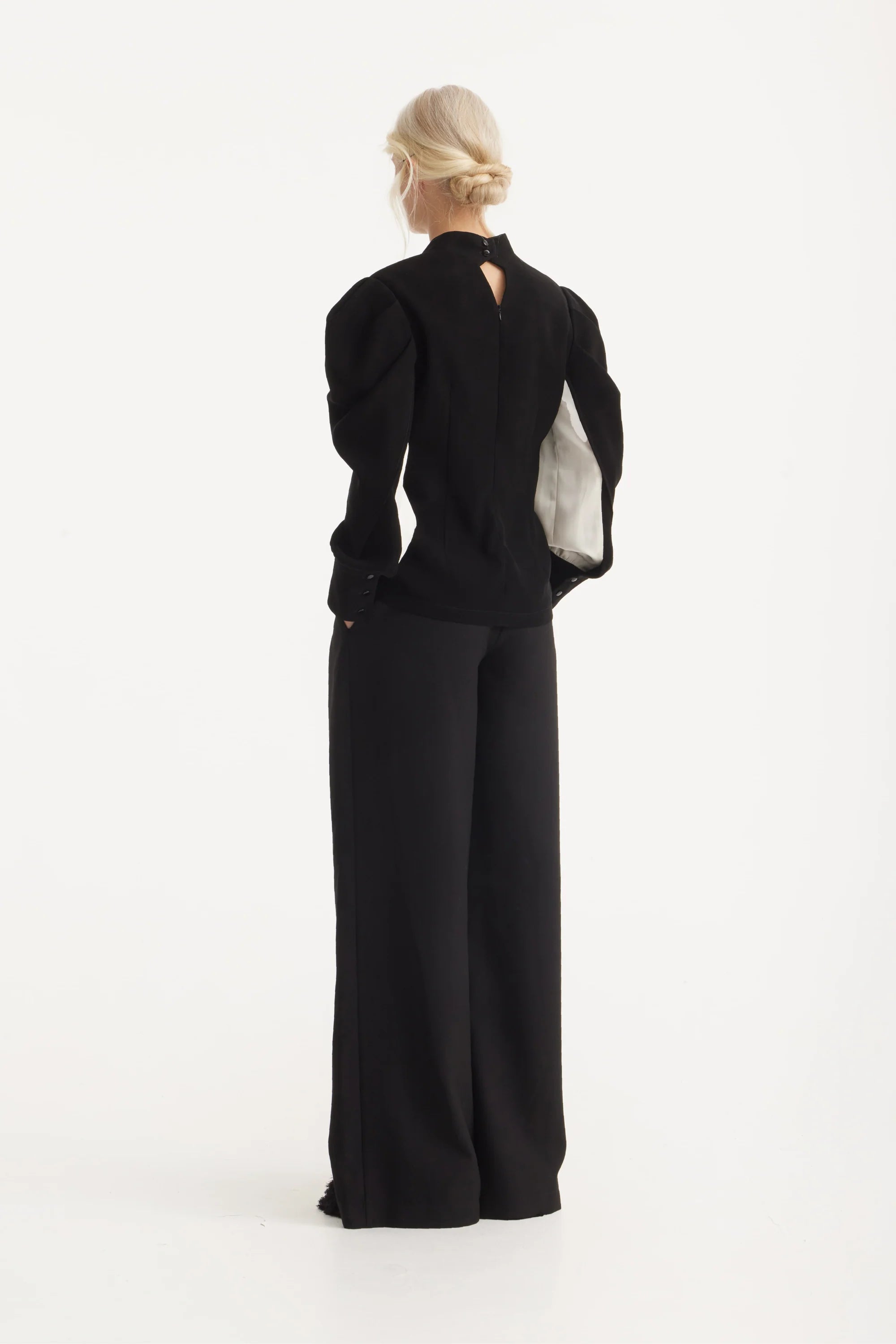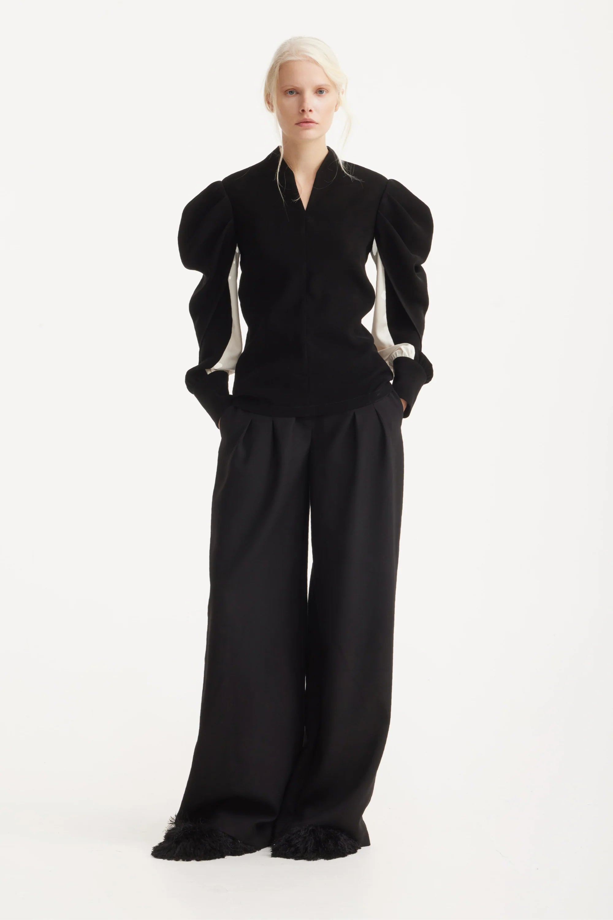 A structured black blouse defined by sculpted, architectural sleeves that reveal soft ivory inserts for a subtle contrast. The clean neckline with a geometric slit adds a refined edge, while the long gathered sleeves create a fluid interplay of volume and precision. Crafted for a confident silhouette, this piece brings harmony between strength and delicacy, making it a standout choice for both understated and statement looks.
