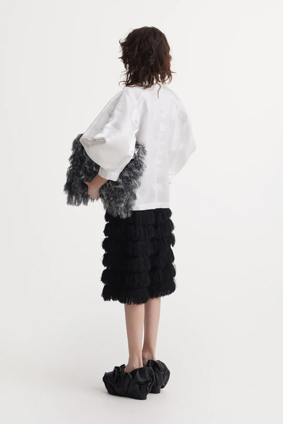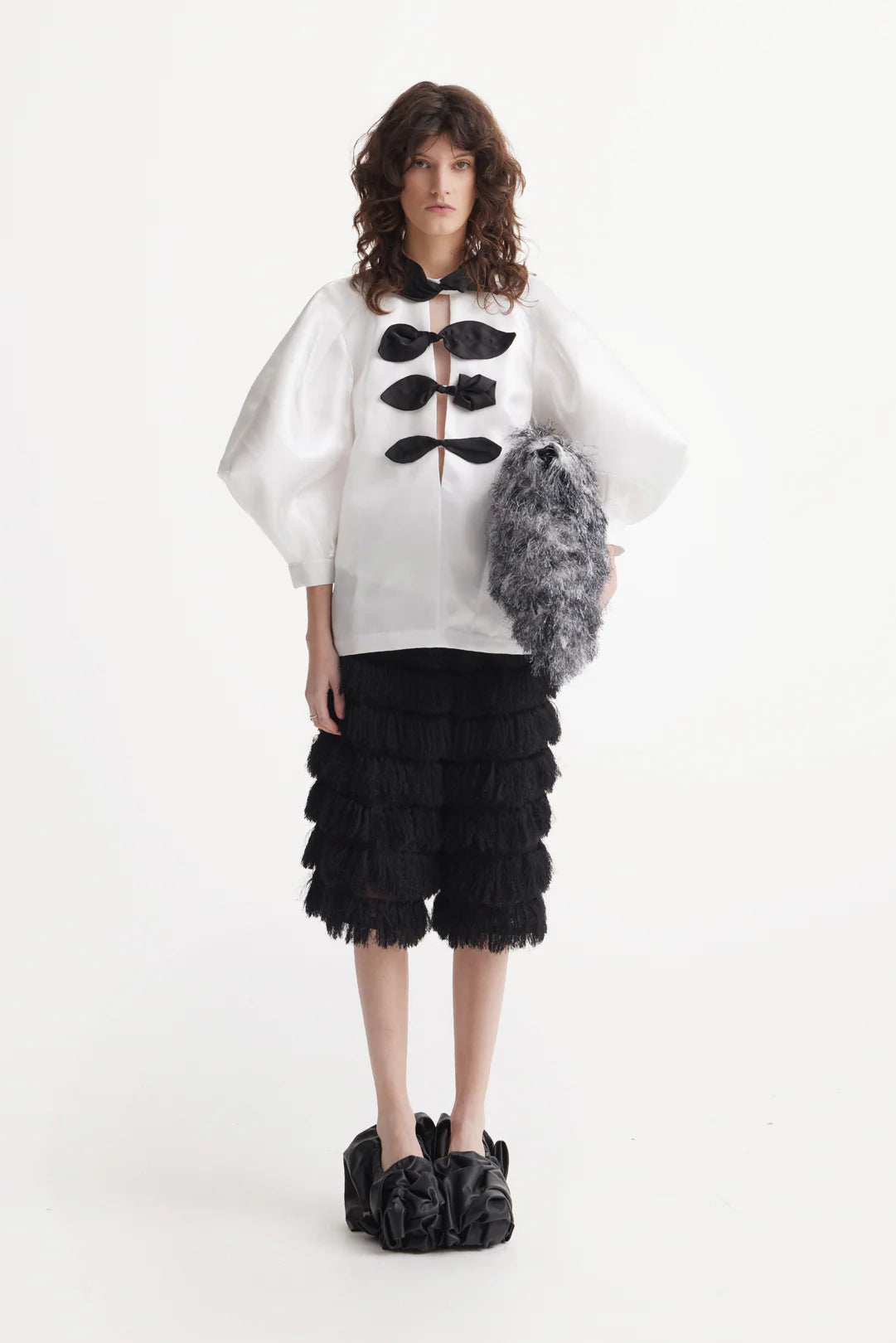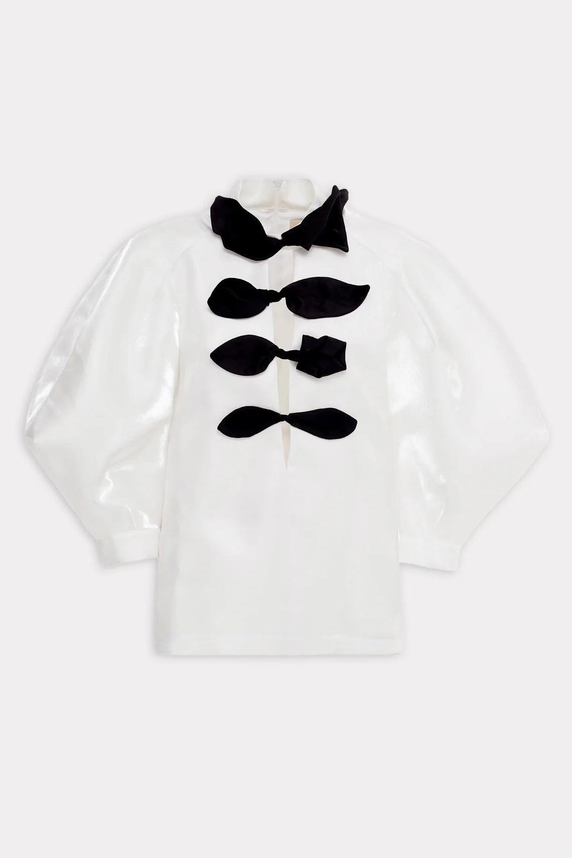 Along the deep V-neckline, four hand-formed black satin floral accents, designed as stylized leaves, serve as both fastening and ornamentation, transforming the blouse into a wearable piece of modern couture. The contrasting details emphasize shape, movement, and intention, adding depth to the crisp white base.