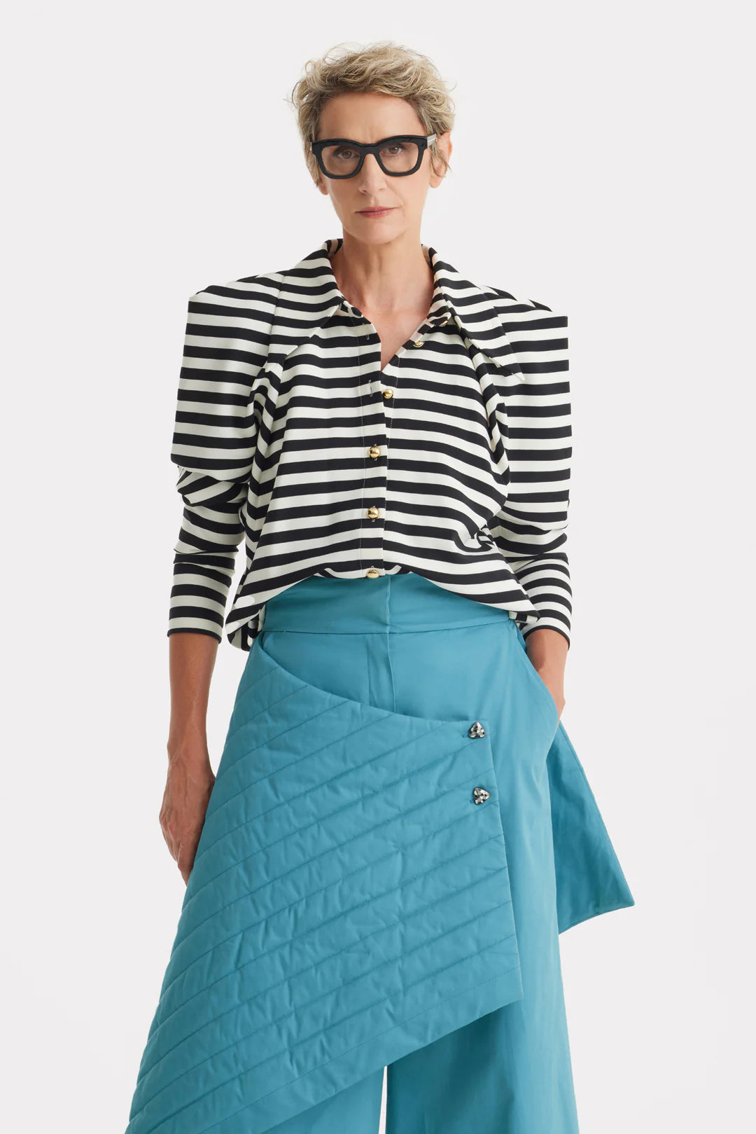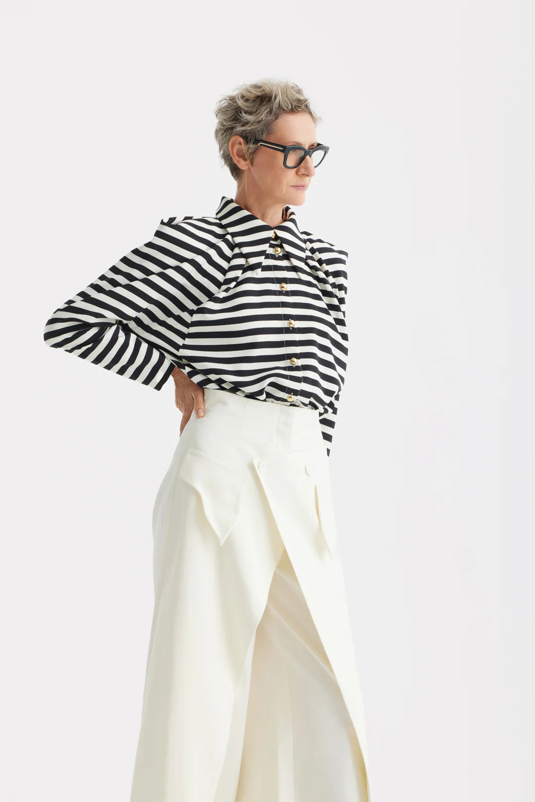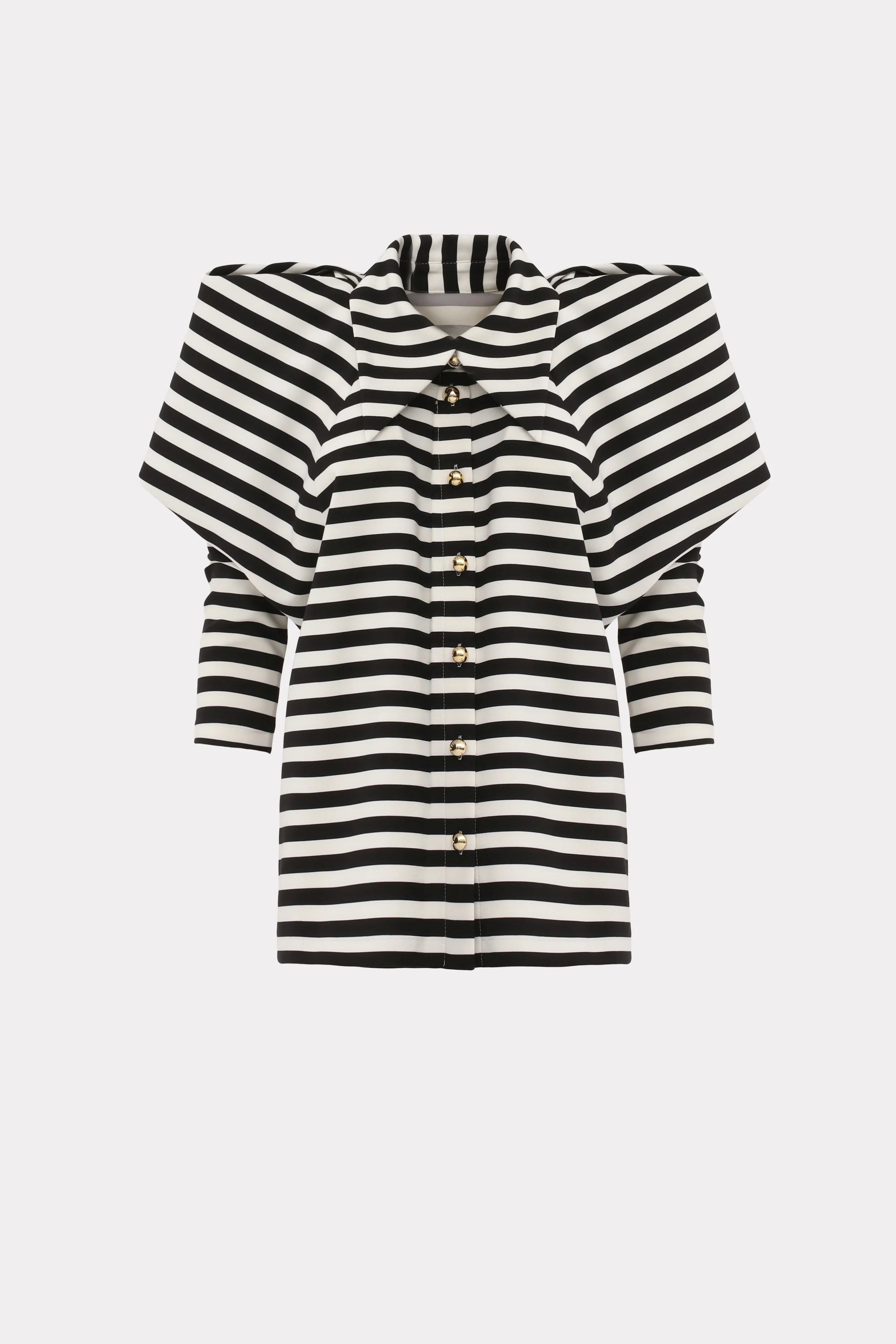This black-and-white striped blouse channels quiet authority through a sharp, architectural silhouette. Designed with structured shoulders and a defined collar, it brings a bold elegance to both office and after-hours looks. The midweight viscose blend ensures comfort and a polished drape, while the golden button detail at the neckline adds a refined accent. A modern take on power dressing — confident, minimal, and undeniably chic.