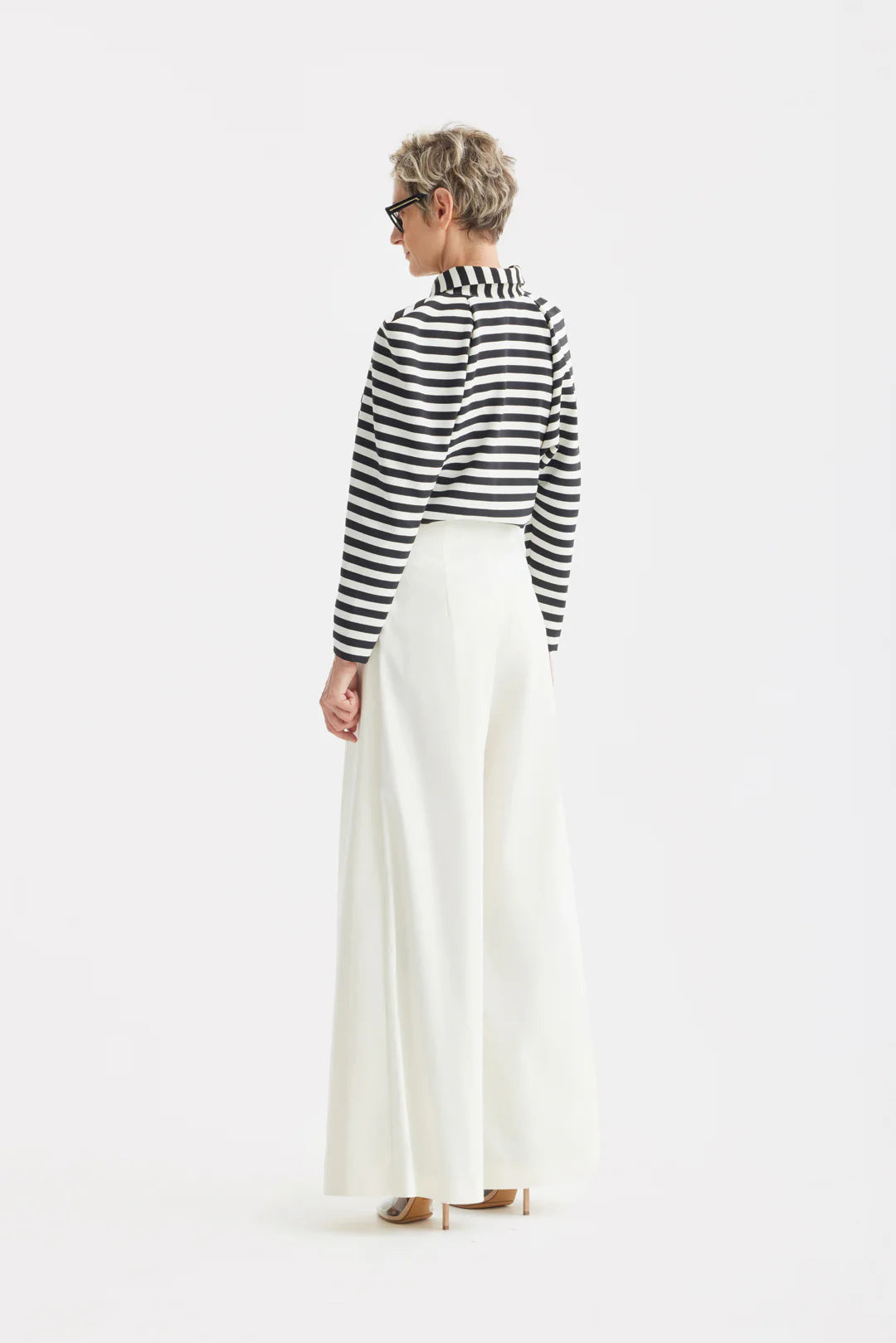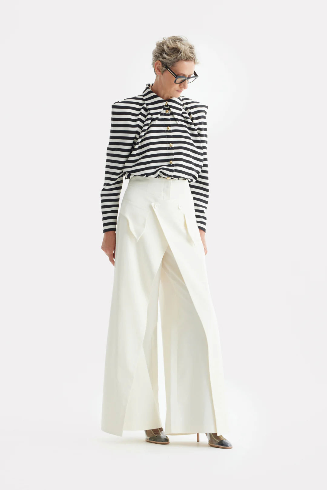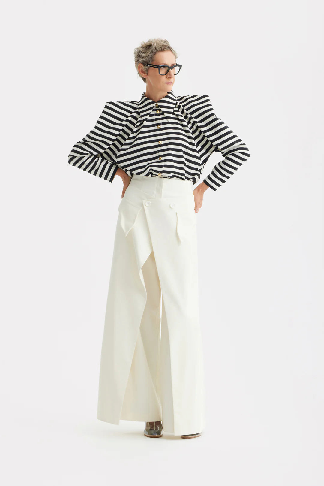 This black-and-white striped blouse channels quiet authority through a sharp, architectural silhouette. Designed with structured shoulders and a defined collar, it brings a bold elegance to both office and after-hours looks. The midweight viscose blend ensures comfort and a polished drape, while the golden button detail at the neckline adds a refined accent. A modern take on power dressing — confident, minimal, and undeniably chic.