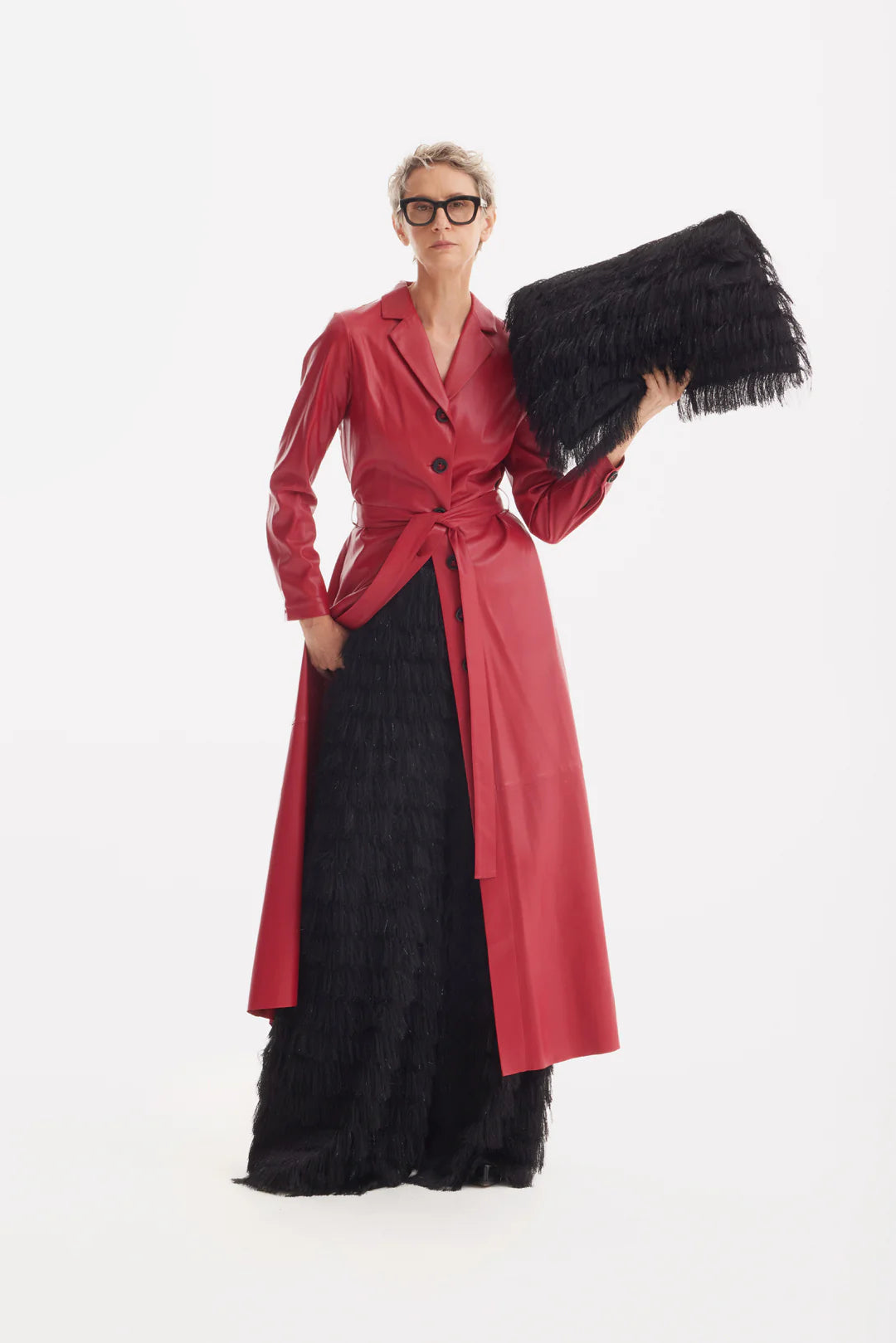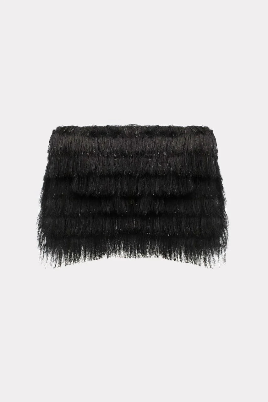 This black fringe clutch is a bold evening accessory that blends texture, shimmer, and movement. Designed with layered fringe detailing infused with subtle metallic threads, it catches the light with every gesture. The compact rectangular silhouette makes it both practical and striking, perfect for carrying essentials while completing any statement look. A versatile piece that transitions seamlessly from cocktail parties to gallery nights, offering avant-garde charm with timeless elegance.
