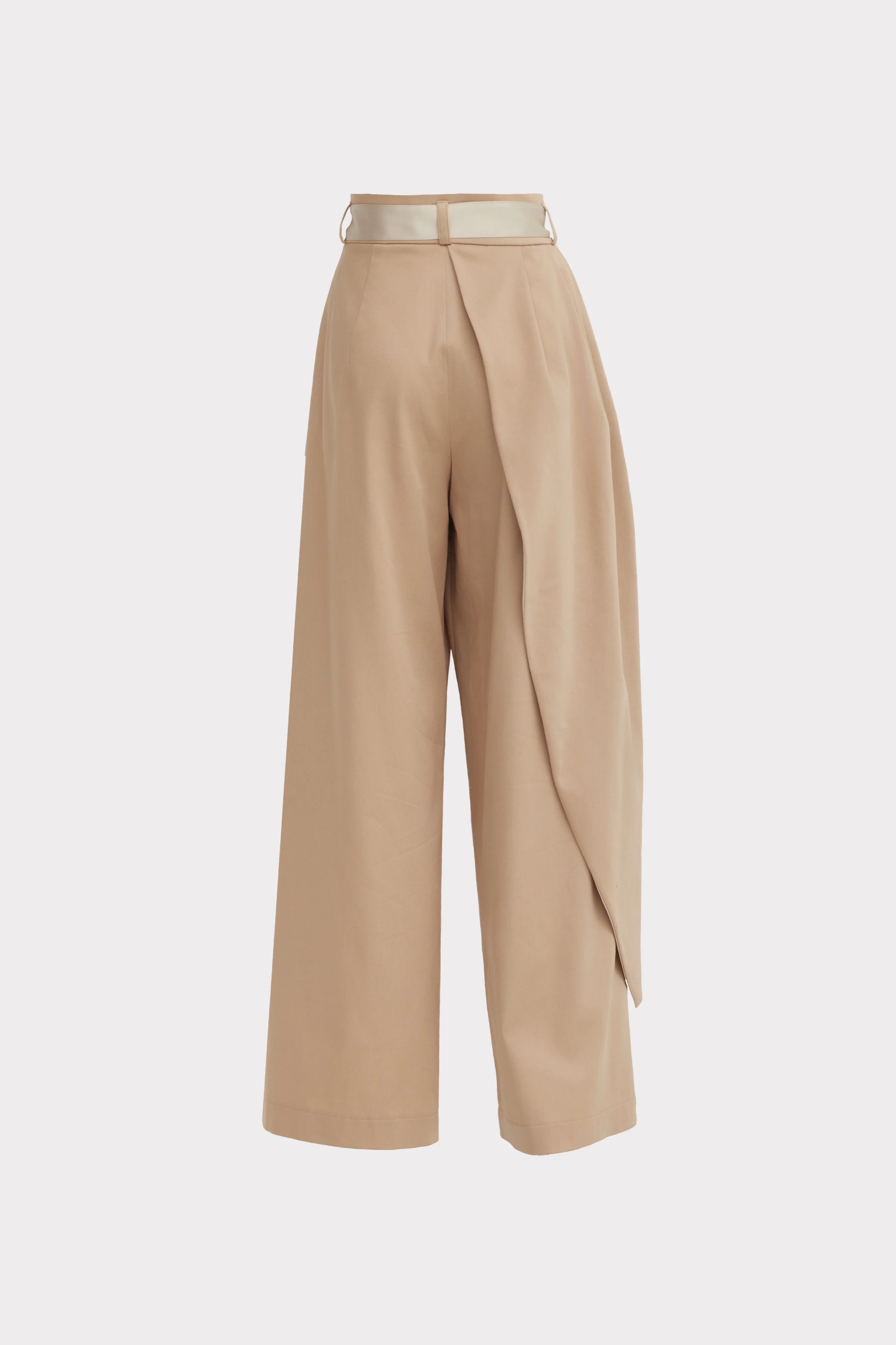 A contrast belt detail accentuates the waist and introduces a subtle graphic note, balancing softness with structure. The wide, straight leg ensures comfort and elegance, making the silhouette timeless yet distinctive. The beige tone keeps the design refined and versatile, ideal for both composed daytime looks and elevated evening styling.