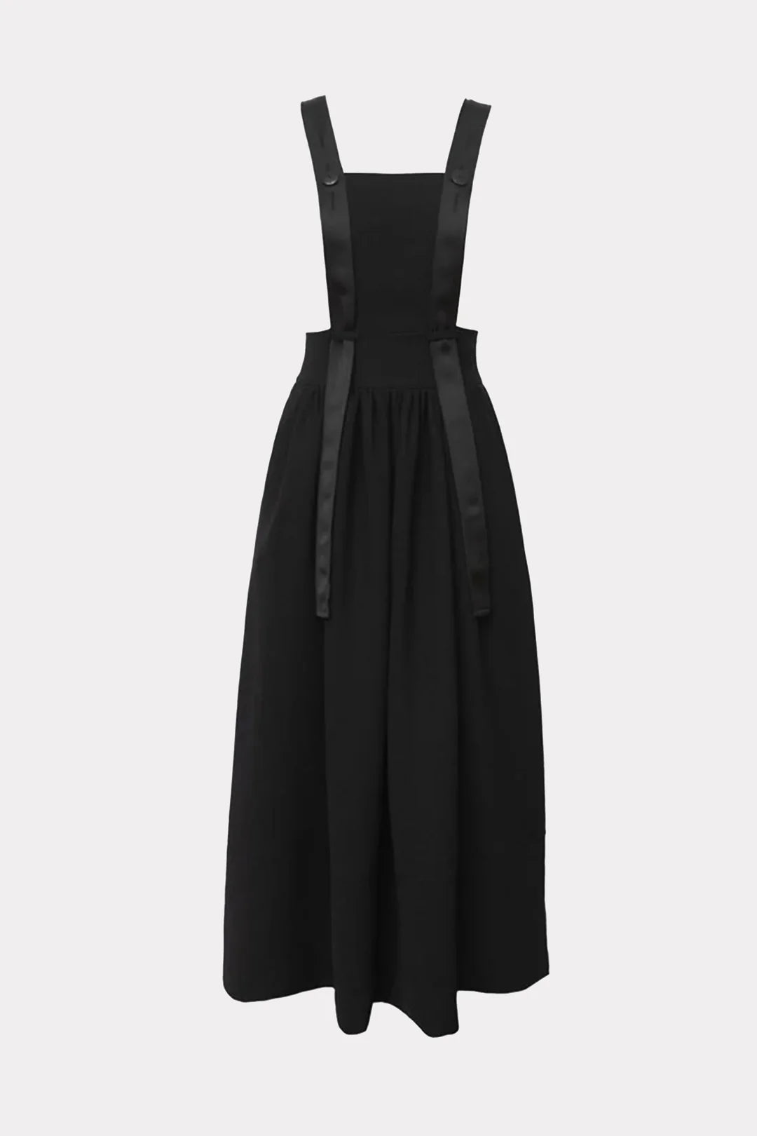 This below-the-knee dress, crafted from soft viscose, features adjustable straps for a comfortable fit, with the length easily altered by buttons. The design showcases a snug bodice and a voluminous skirt in black, making it a versatile piece that pairs seamlessly with crop tops and T-shirts for summer or can be styled with a shirt or long-sleeve top for other seasons.