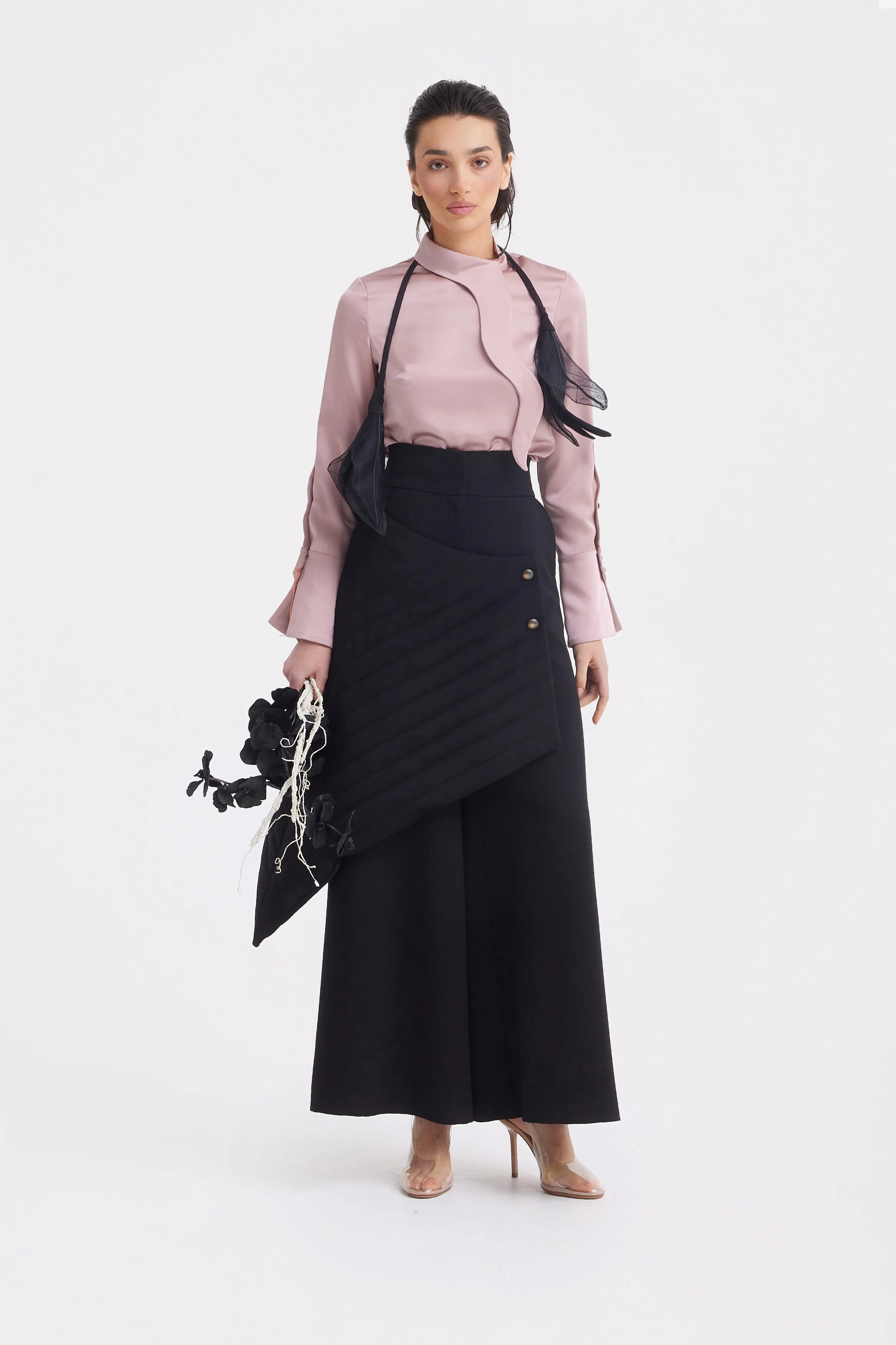 Elevate your style with this luxurious blush blouse, crafted from double-faced satin that offers a soft, silk-like feel. Featuring an elegant high neckline and sculpted front detail, this blouse combines sophistication with comfort. The smooth satin fabric drapes beautifully, making it perfect for transitioning from day to night. Full-length sleeves with buttoned cuffs add versatility, while the refined design pairs effortlessly with tailored trousers or skirts, making it a timeless addition to your wardrobe.