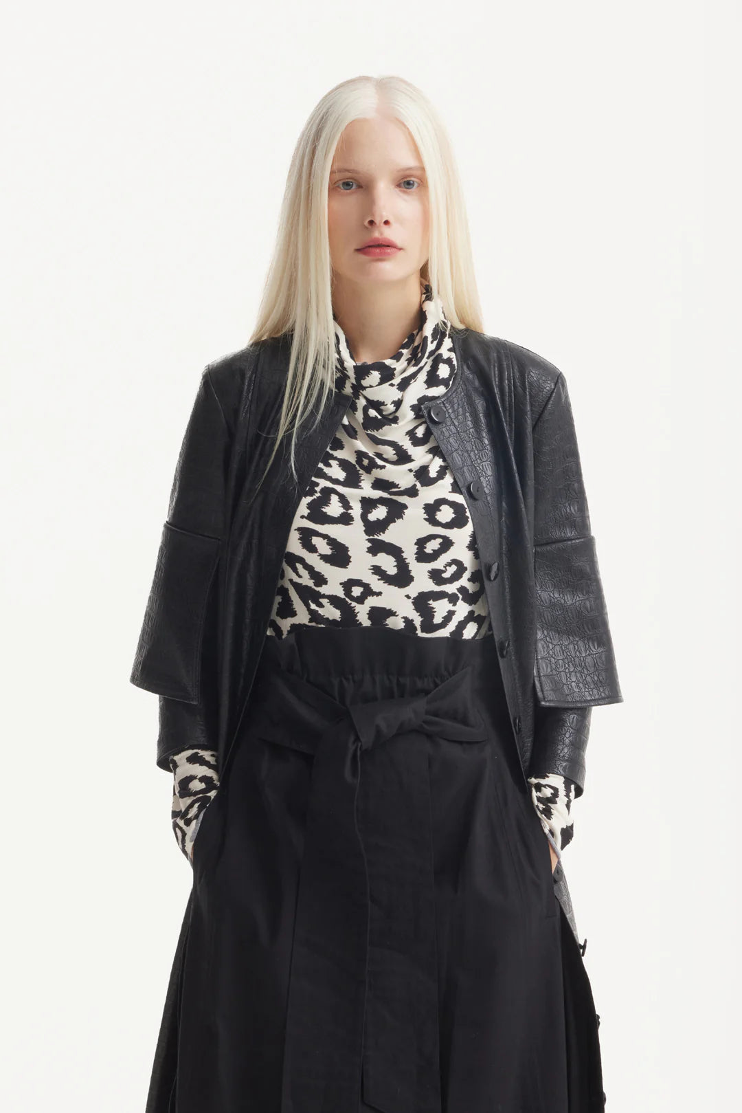 Elevate your wardrobe with this chic long-sleeve leopard print top, crafted from lightweight knit fabric. Perfect for adding a touch of wild sophistication to your everyday style, this top features a classic high neckline that provides a sleek and polished look.