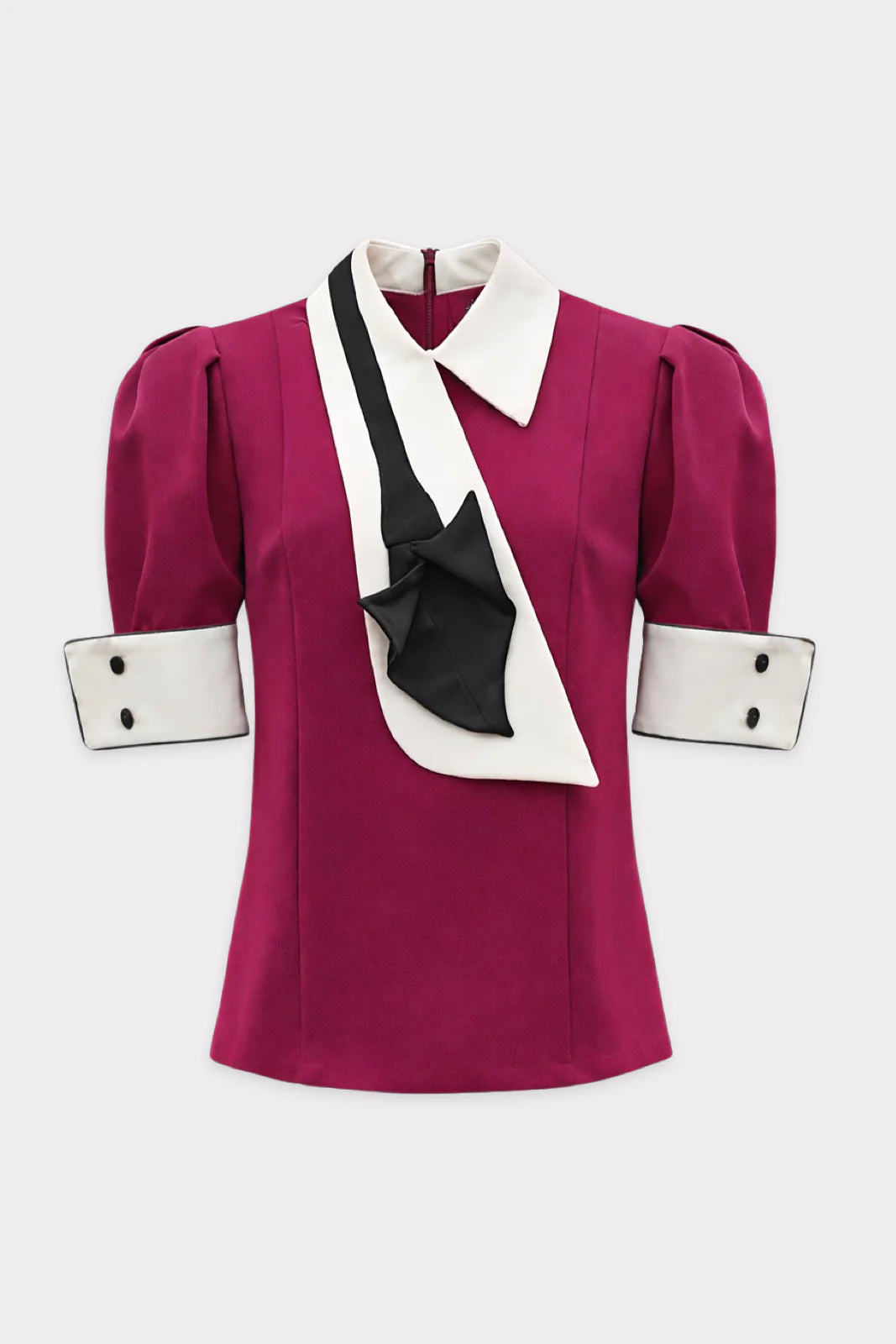 Fitted silhouette · Puff sleeves · Contrast collar and cuffs · Sculptural front detail · Back zip closure · Fuchsia with white and black accents