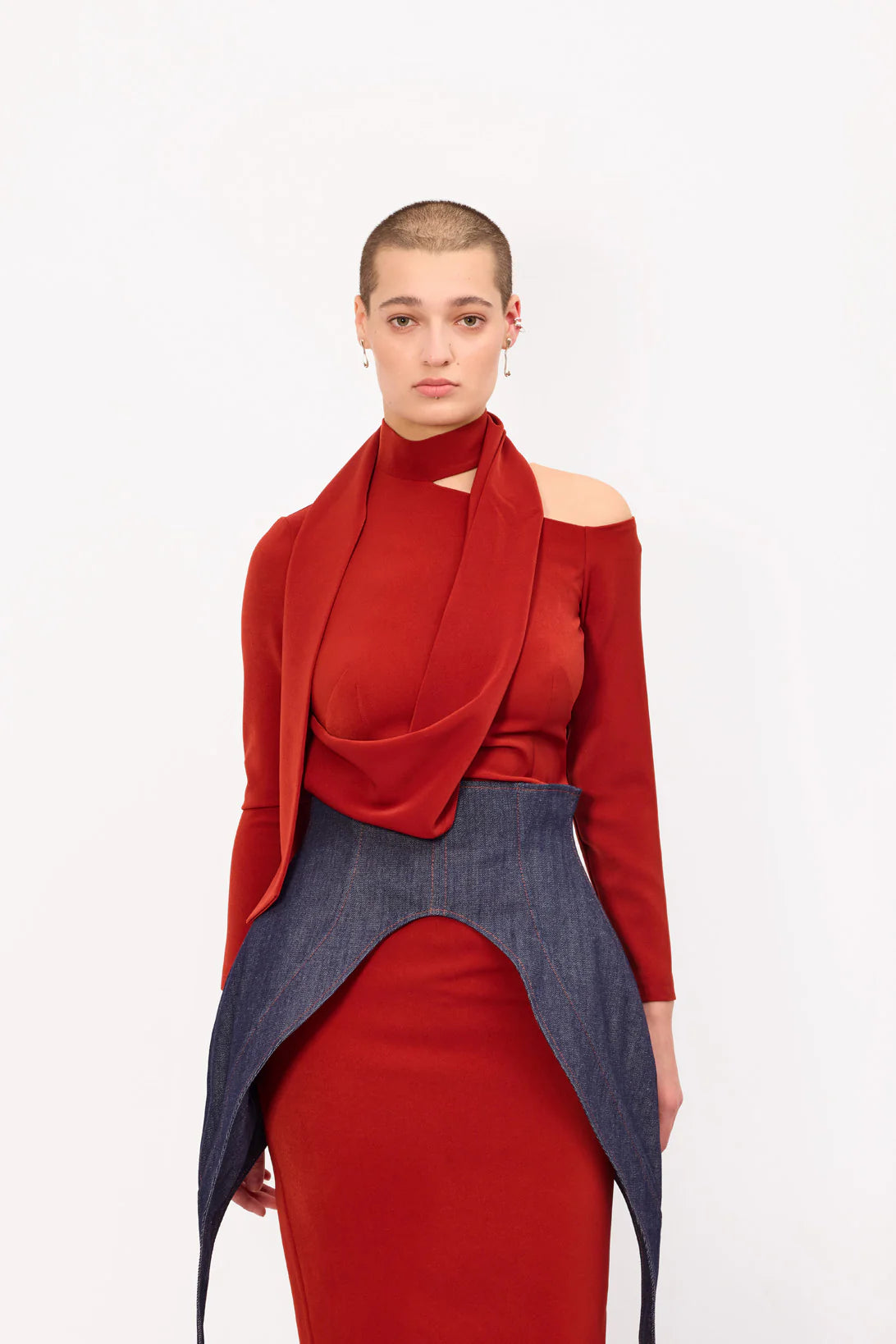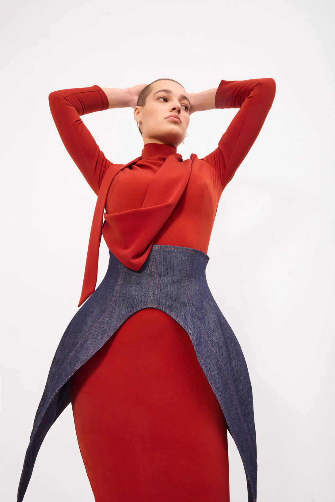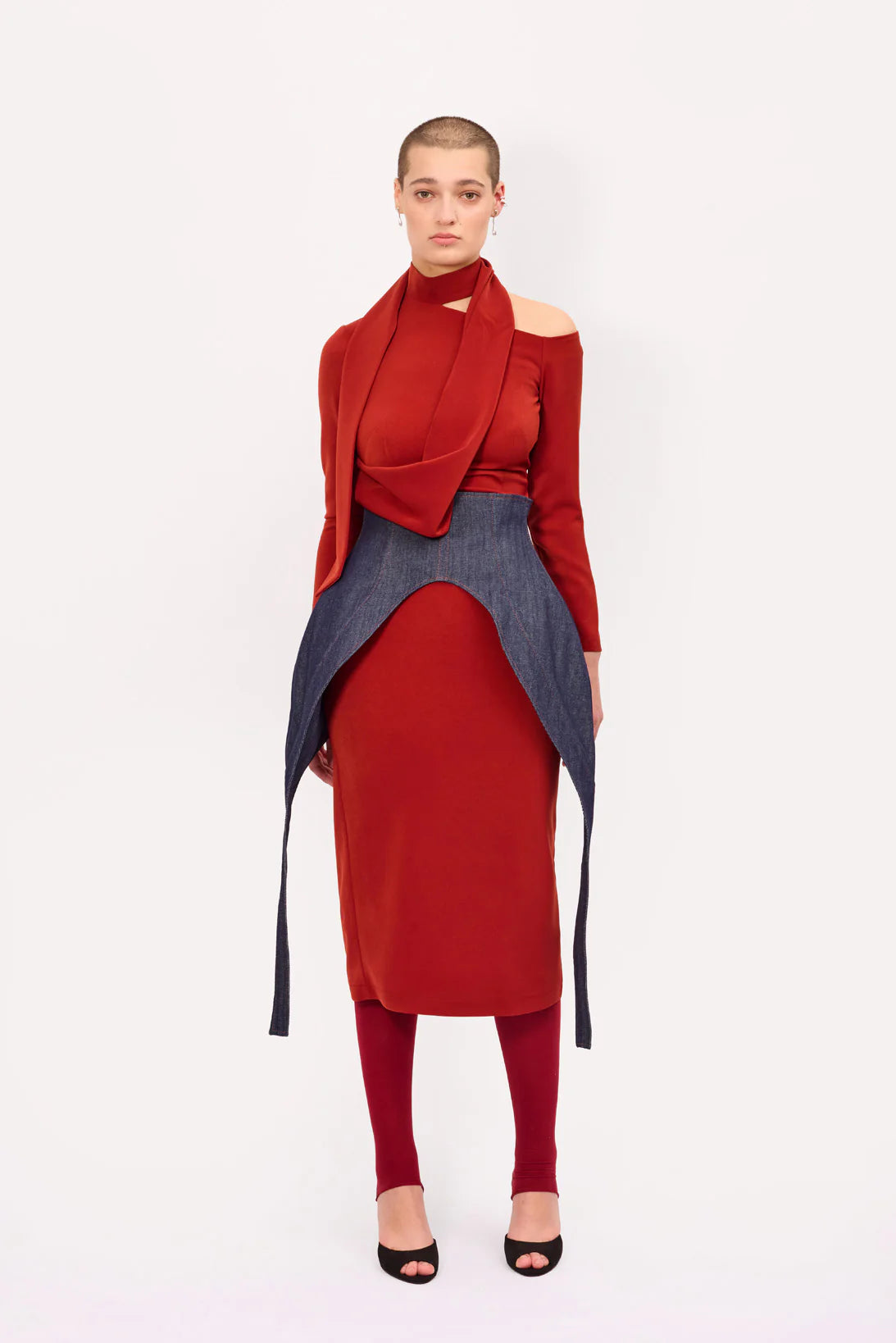 The fitted waistband cinches the waist for a sculpted effect, while contrasting stitching adds a modern, edgy touch. Designed to be worn over dresses, skirts, or trousers, this waist corset redefines layering with a contemporary aesthetic. Whether styled for casual or high-fashion looks, it’s the perfect accessory for those who love structured yet wearable designs.