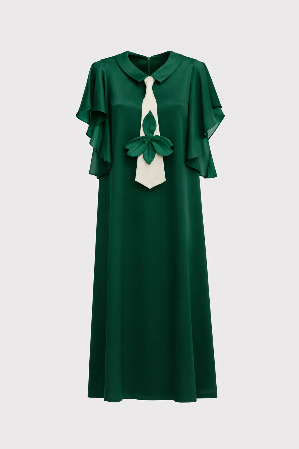 Satin cu două straturi · Lungime midi · Detaliu sculptural alb-ivoar la decolteu · Accent floral · Mâneci stratificate și fluide · Închidere ascunsă la spate · Verde smarald
