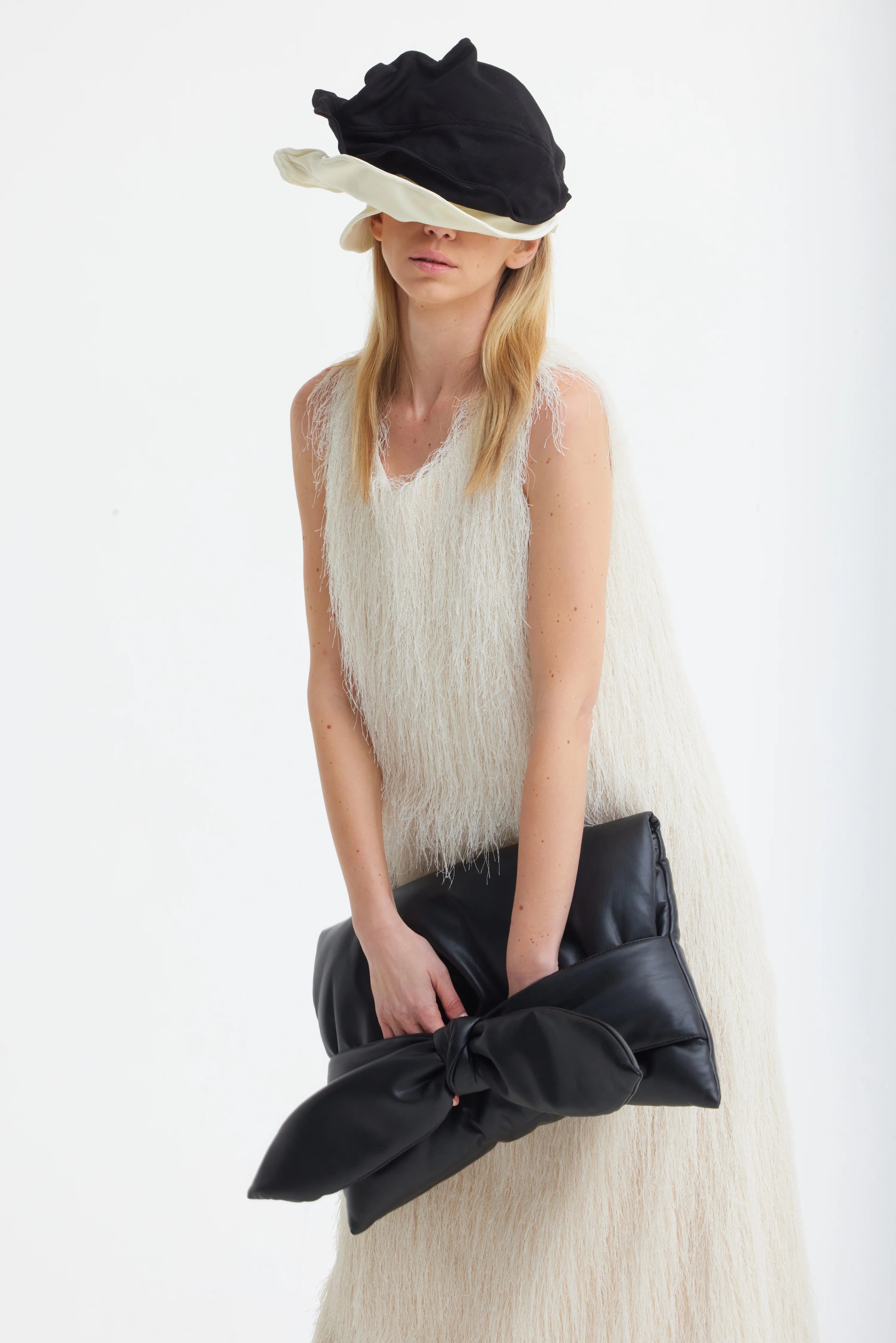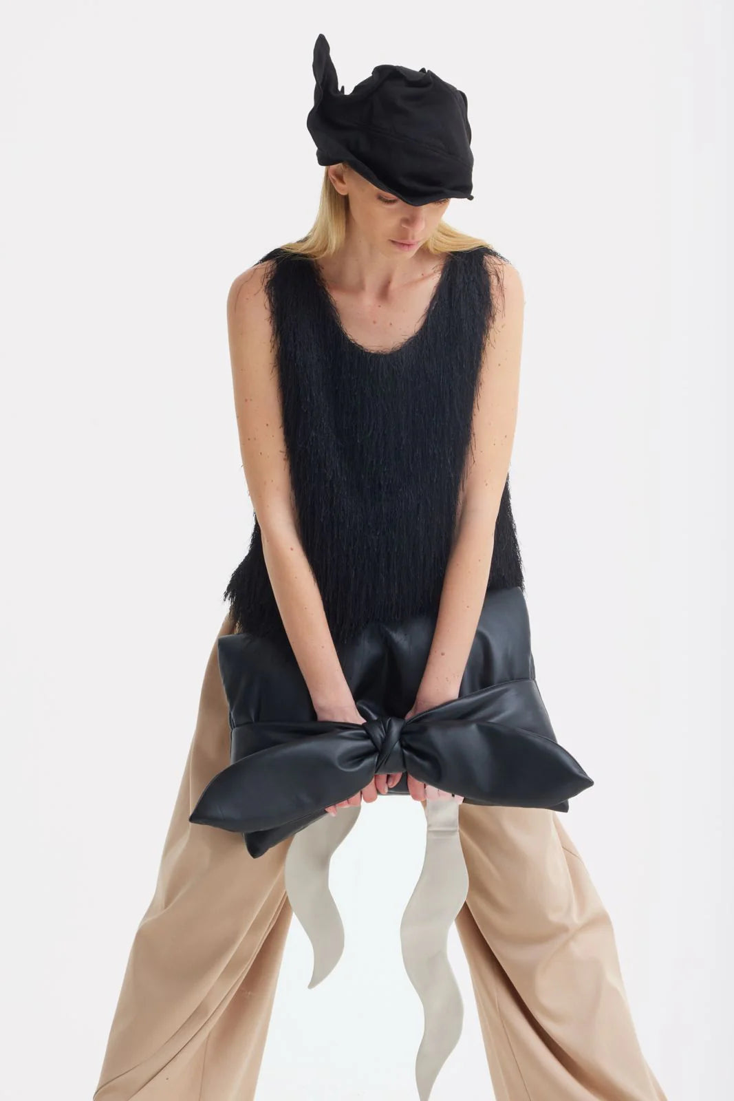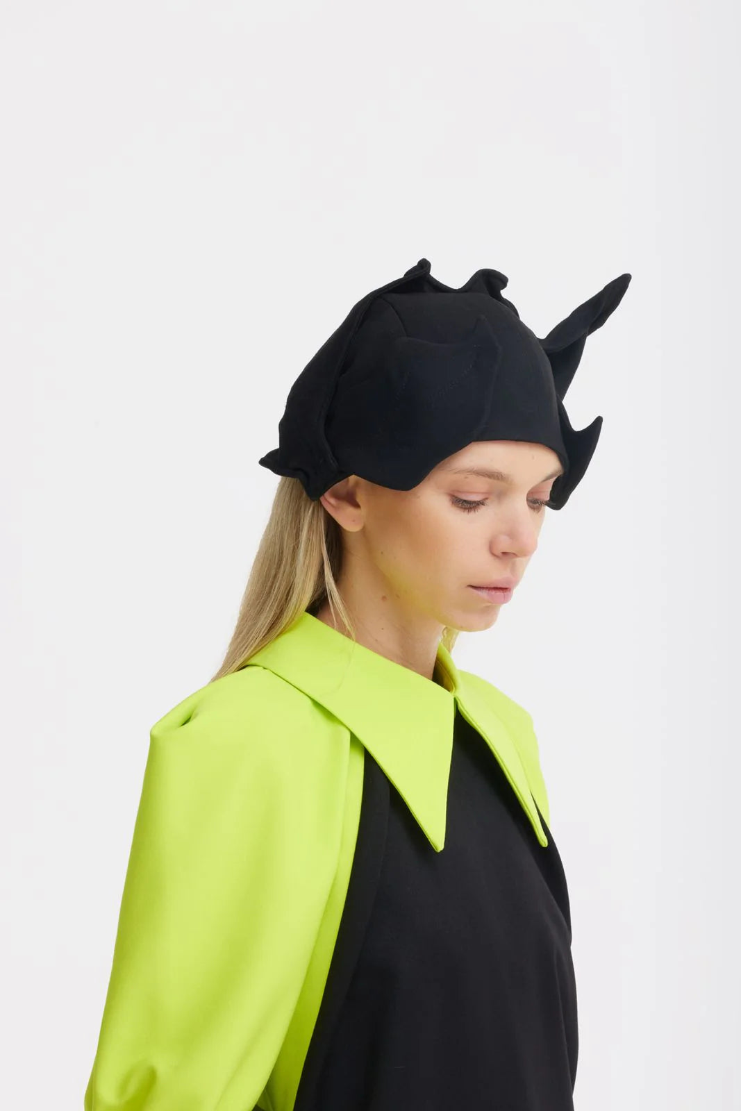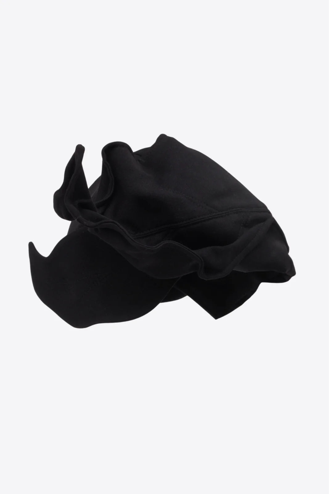 Un accesoriu avangardist conceput ca un accent sculptural. Această mini pălărie de seară este realizată din material structurat, modelat în forme fluide, ondulate, care încadrează capul printr-o siluetă arhitecturală. Finisajul negru mat îi amplifică prezența grafică, lăsând forma și volumul în prim-plan.