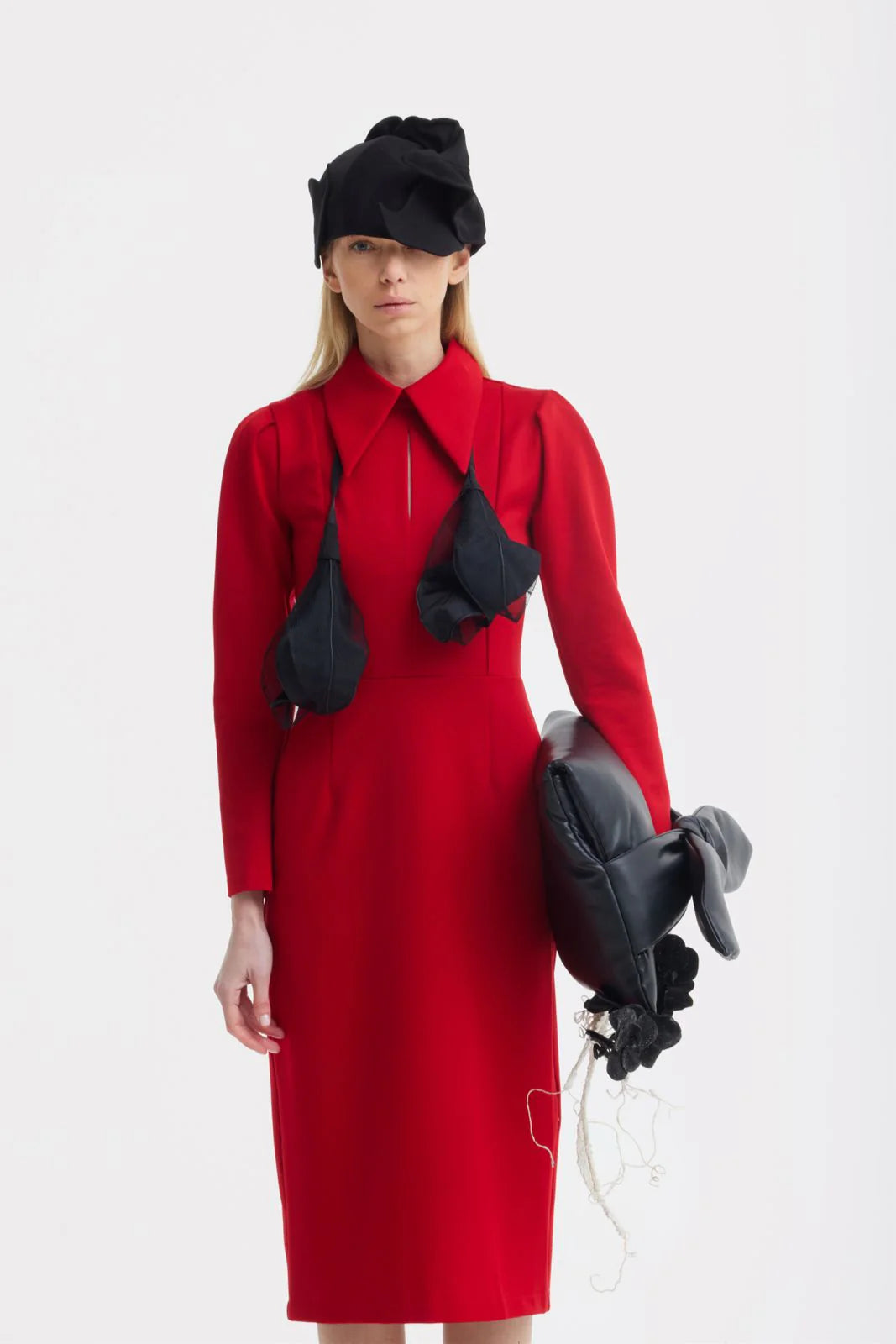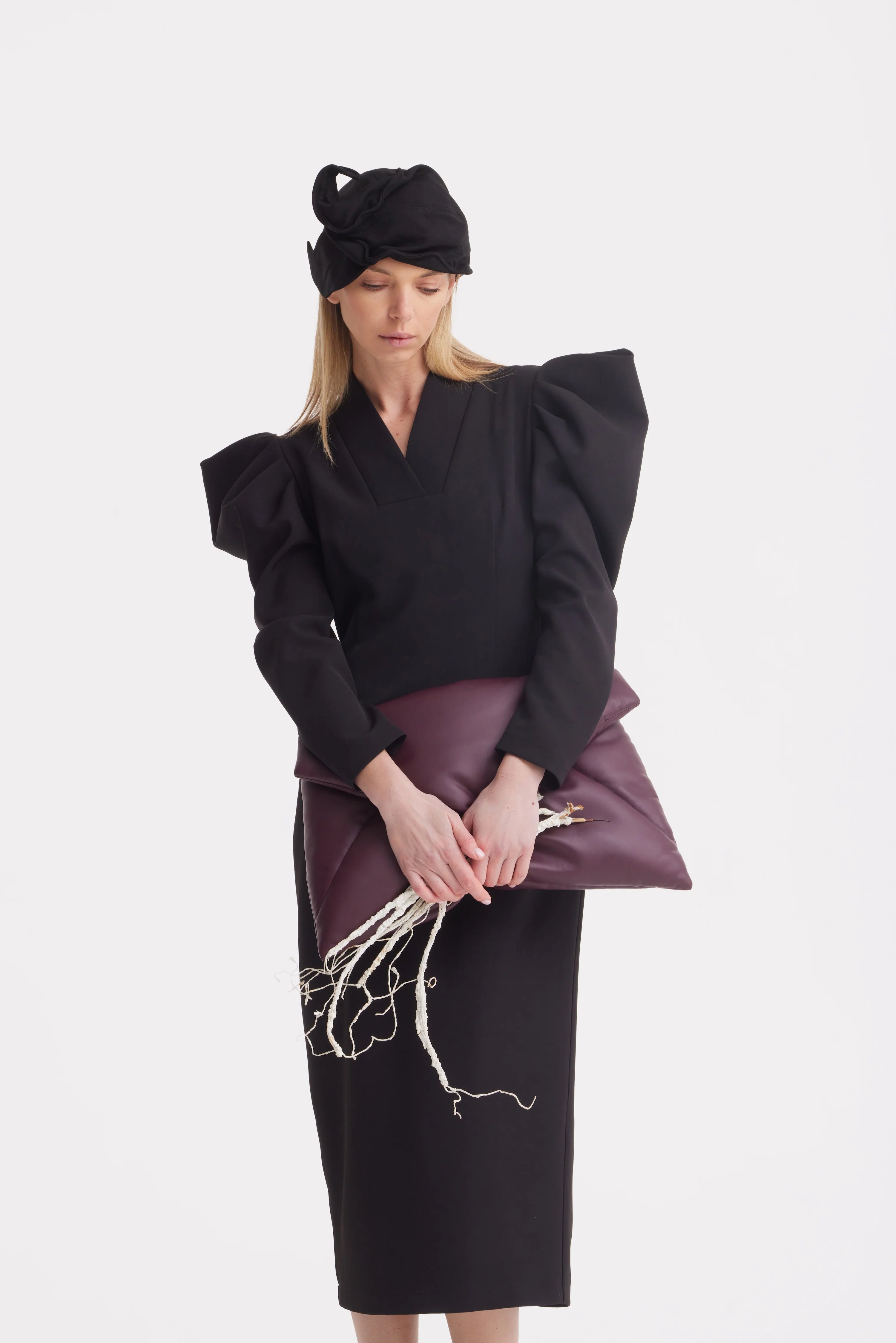 Accesoriu sculptural · Material structurat · Ușor · Siluetă arhitecturală · Accesoriu de seară · Negru