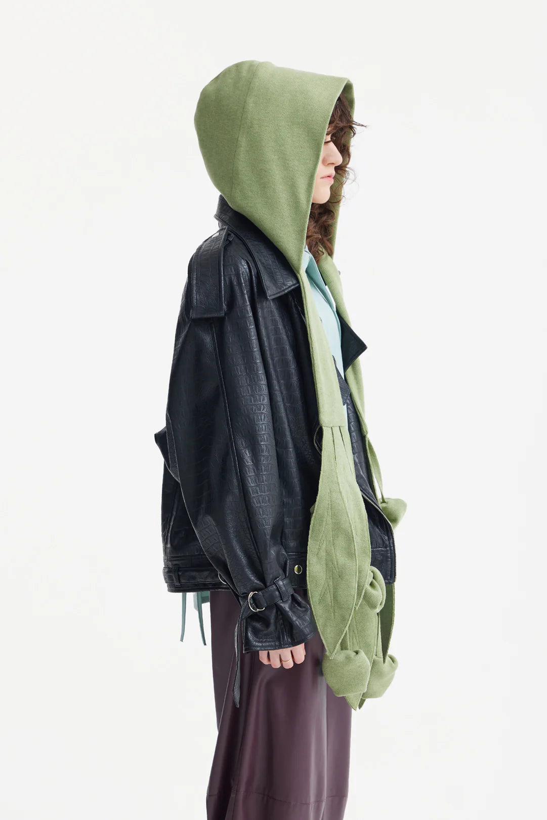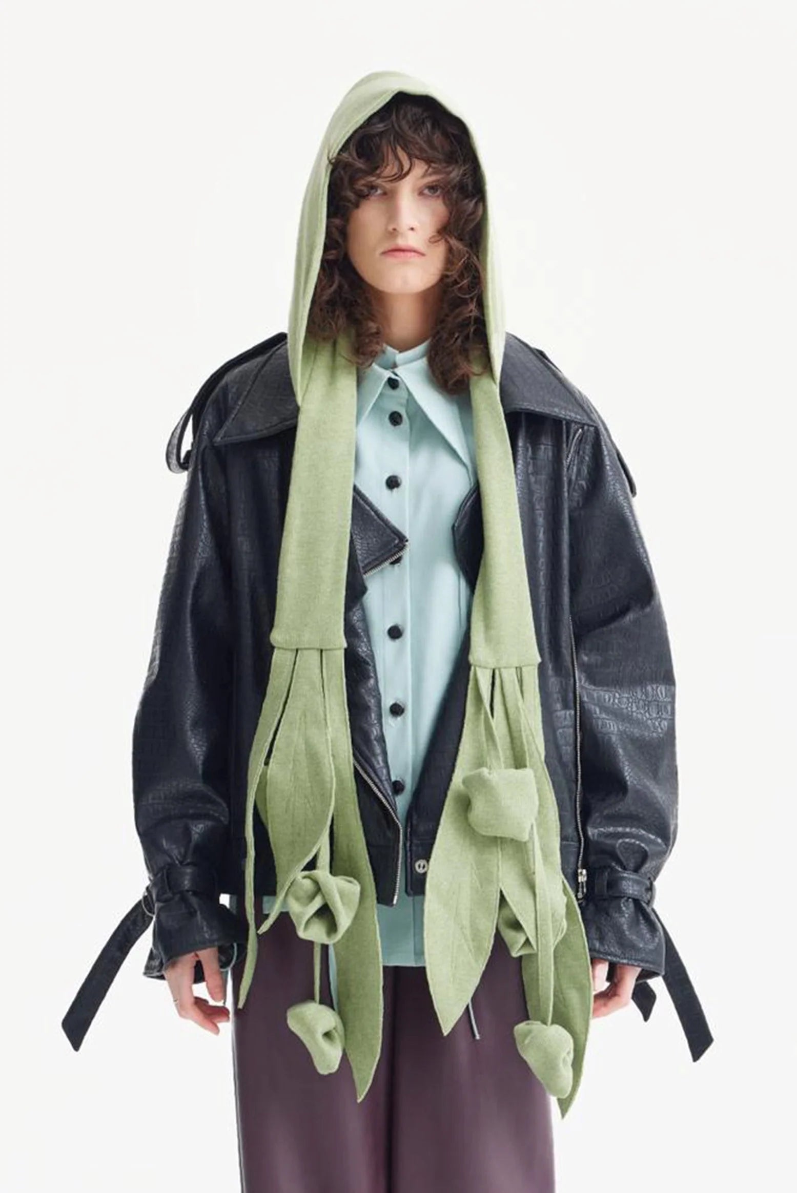 Un accesoriu de iarnă cu design sculptural, creat pentru versatilitate și confort. Realizată din jerseu de lână dublat, această eșarfă-căciulă verde măsliniu semnată Julia Allert poate fi legată, înfășurată sau drapată în nenumărate moduri. Țesătura moale din amestec de lână oferă căldură, iar curelele alungite permit libertate de formă și expresie. O piesă care se transformă cu ușurință din căciulă în șal sau eșarfă, reflectând spiritul minimalist, dar expresiv al brandului. Produsă etic în Europa, acest accesoriu unește funcționalitatea, arta și rafinamentul atemporal.