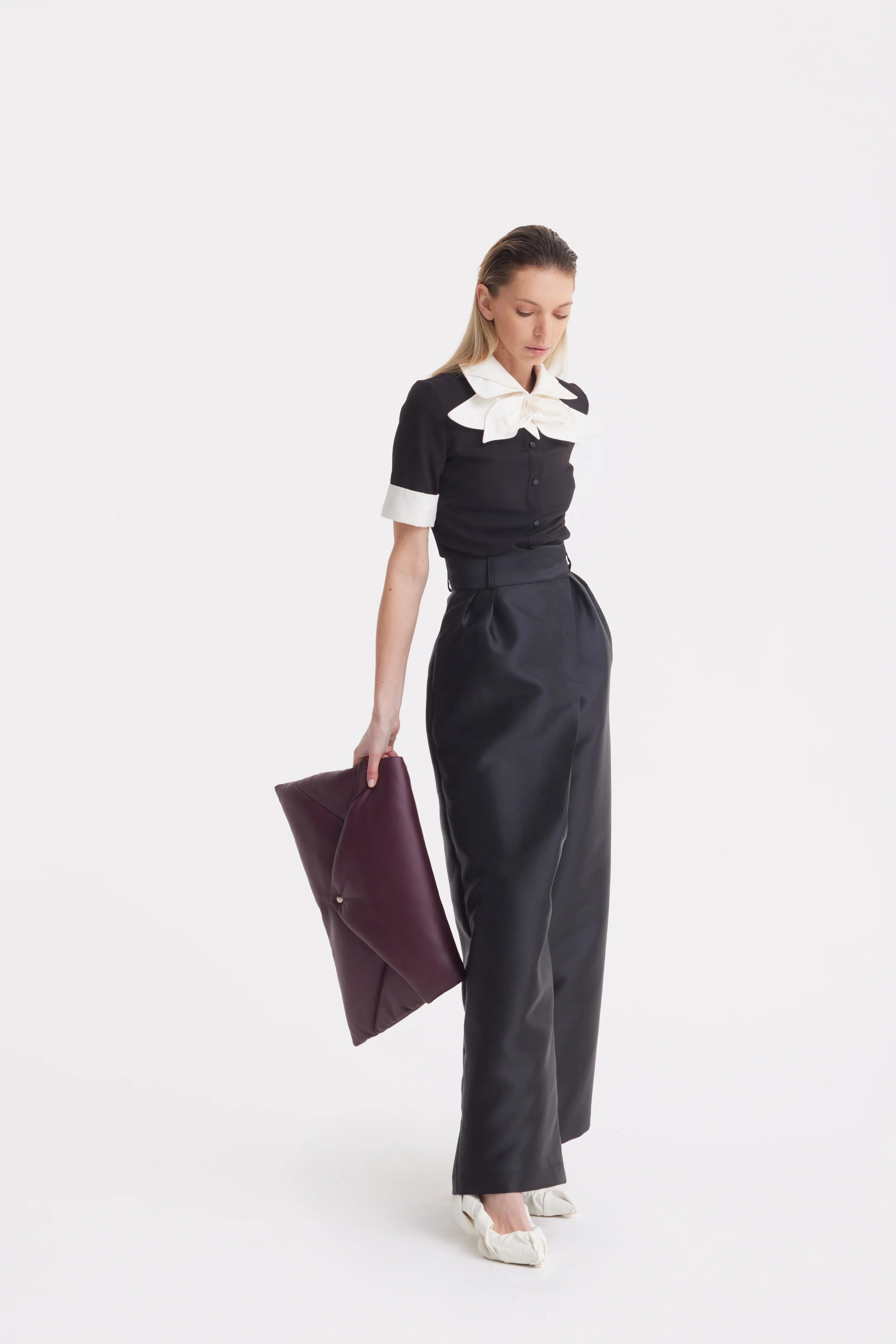 Croiala precisă se întâlnește cu simplitatea sculpturală. Acești pantaloni palazzo cu talie înaltă sunt confecționați dintr-un amestec de bumbac și viscoză cu finisaj satinat, având un panou frontal suprapus care creează un flux asimetric, arhitectural. Croiul cu picioare largi oferă o linie dramatică, dar elegantă, iar talia structurată avantajează silueta. Asortează-i cu pulovere mulate sau bluze din mătase pentru un look sofisticat care trece cu ușurință de la zi la seară.