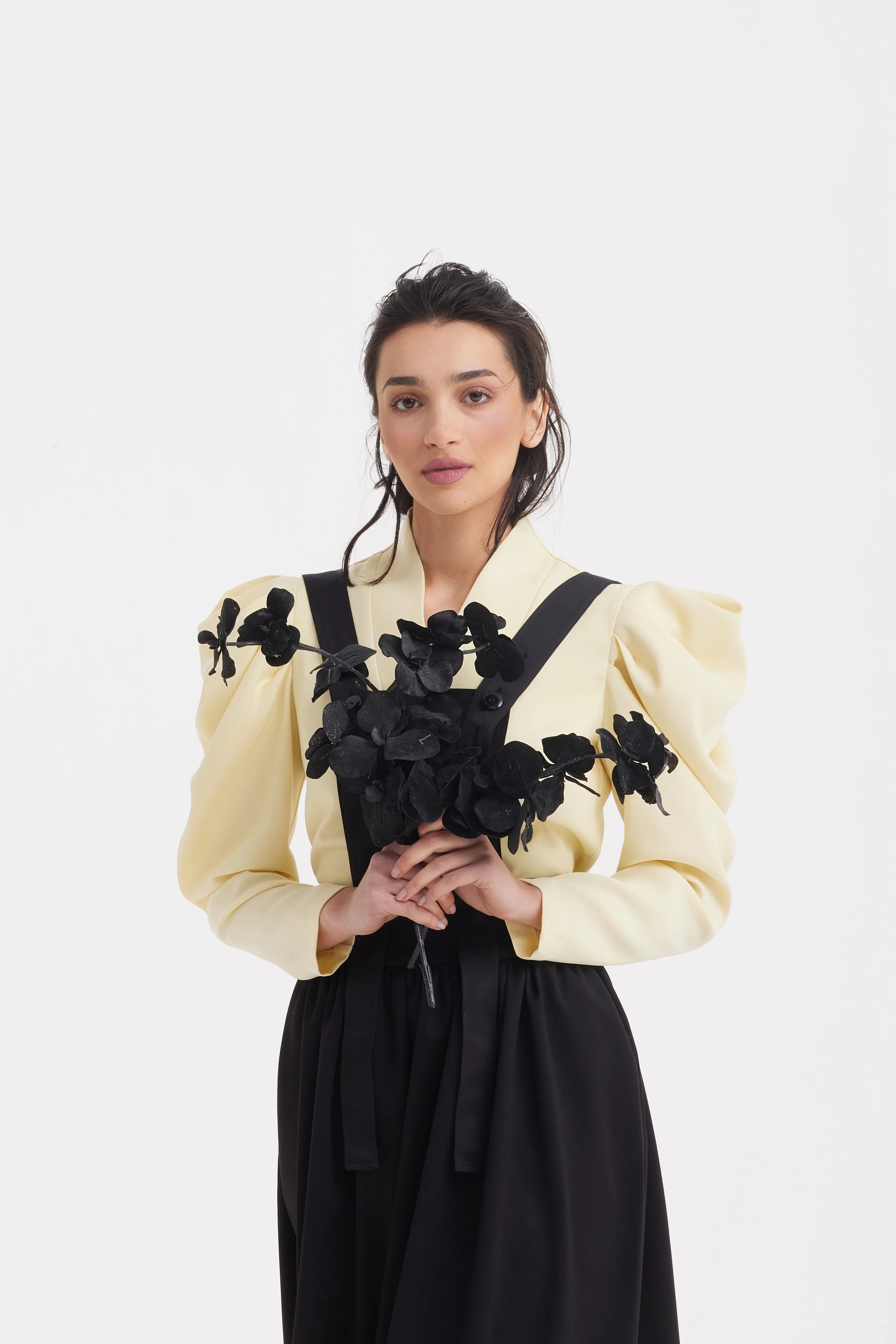 Această rochie sub genunchi, confecționată din vâscoză moale, are bretele reglabile pentru un confort sporit, iar lungimea poate fi ajustată cu ușurință prin nasturi. Designul prezintă un corsaj mulat și o fustă voluminoasă în negru, făcând-o o piesă versatilă. Se potrivește perfect cu topuri scurte și tricouri vara sau poate fi stilizată cu o cămașă sau un top cu mânecă lungă în celelalte anotimpuri.