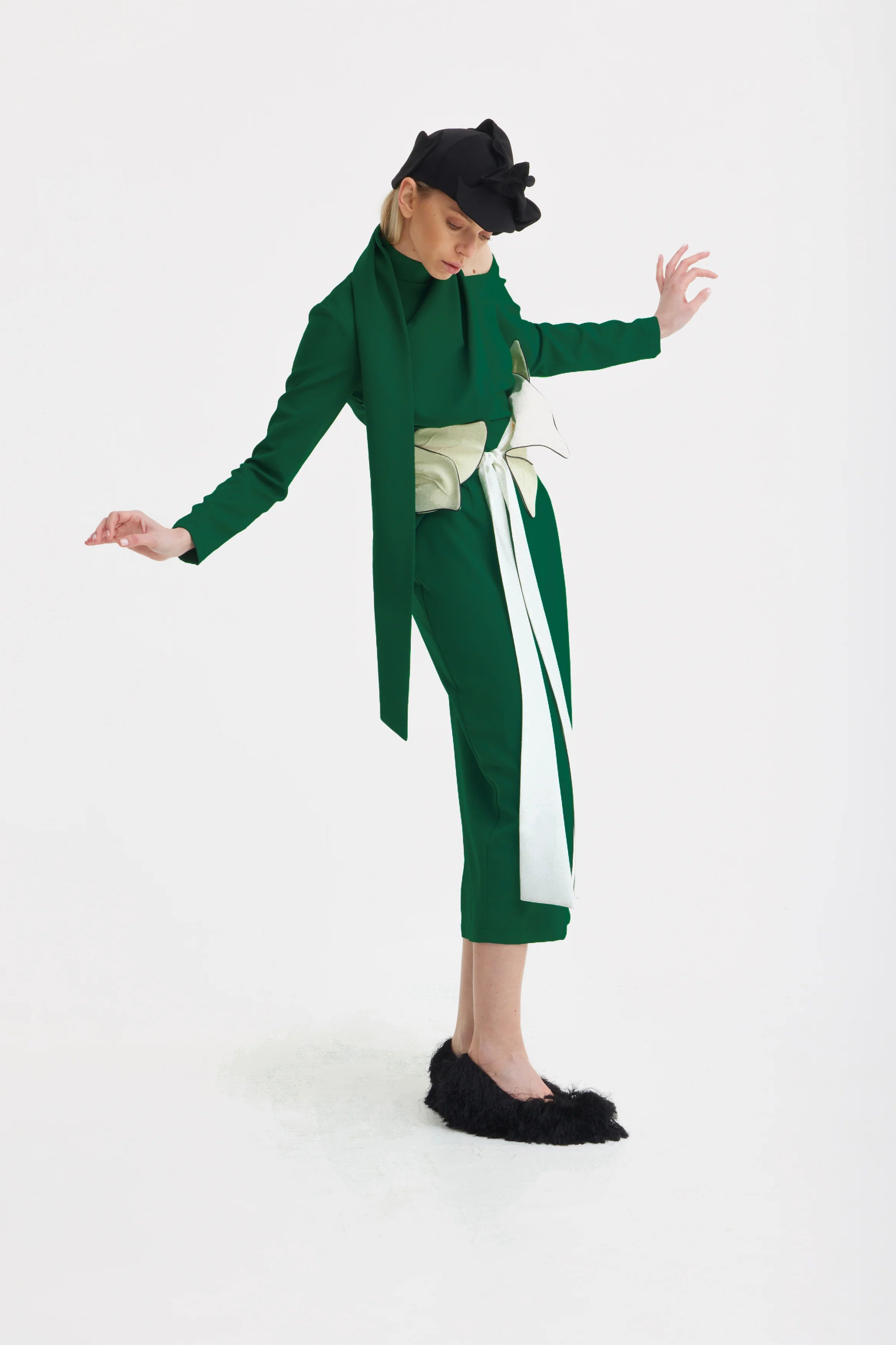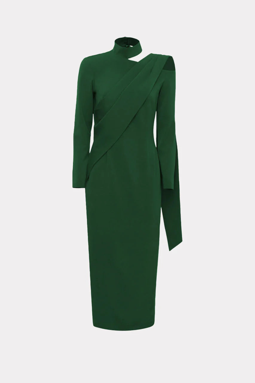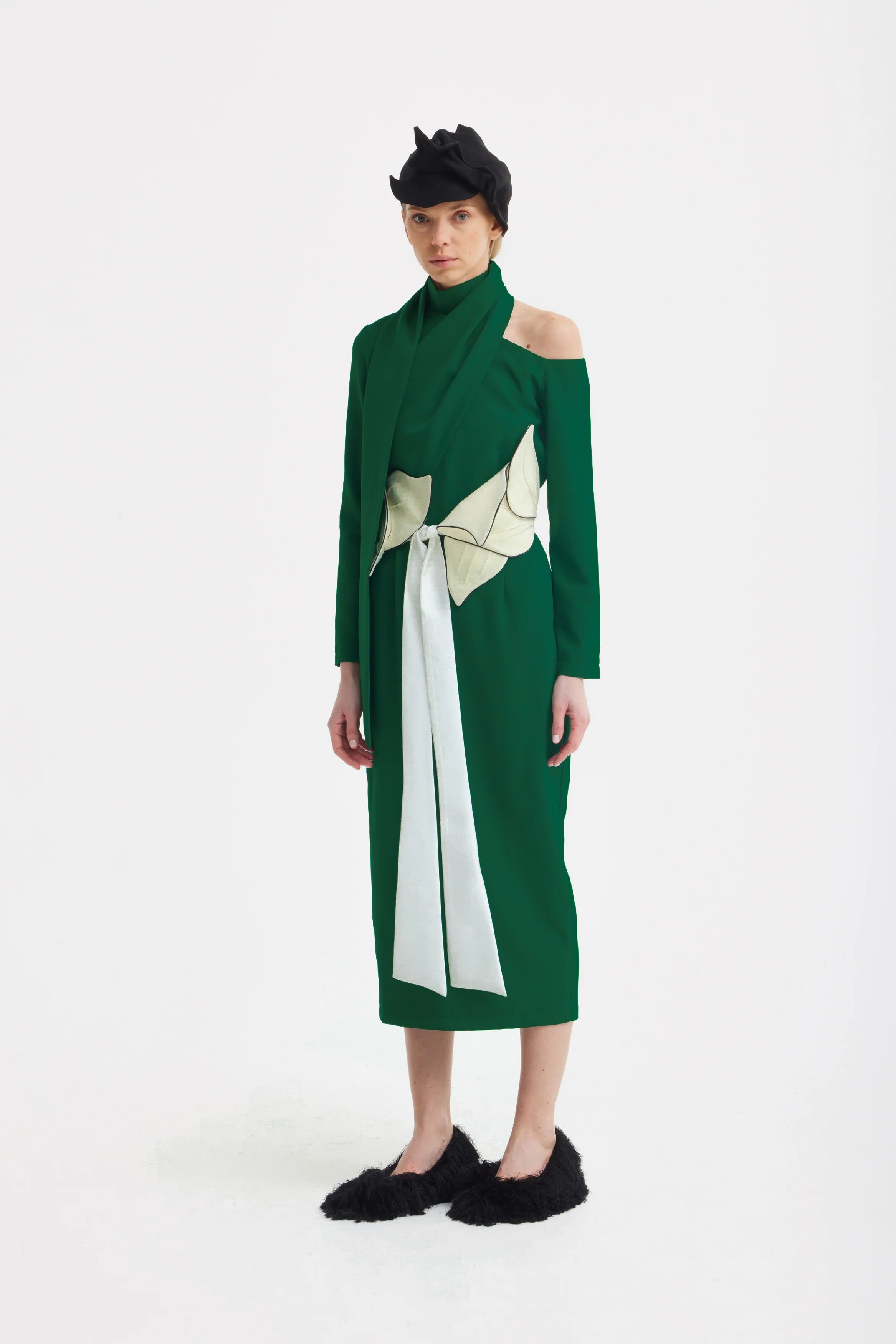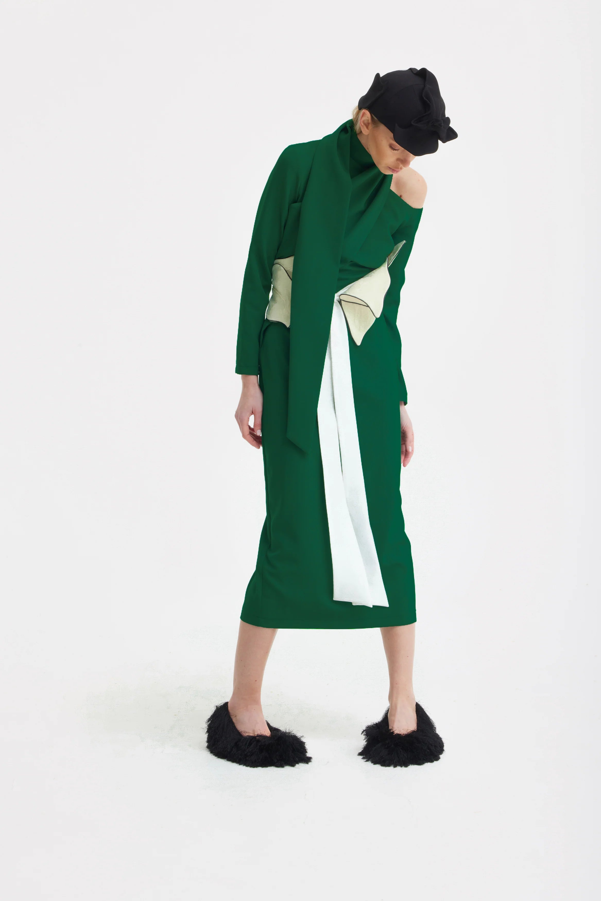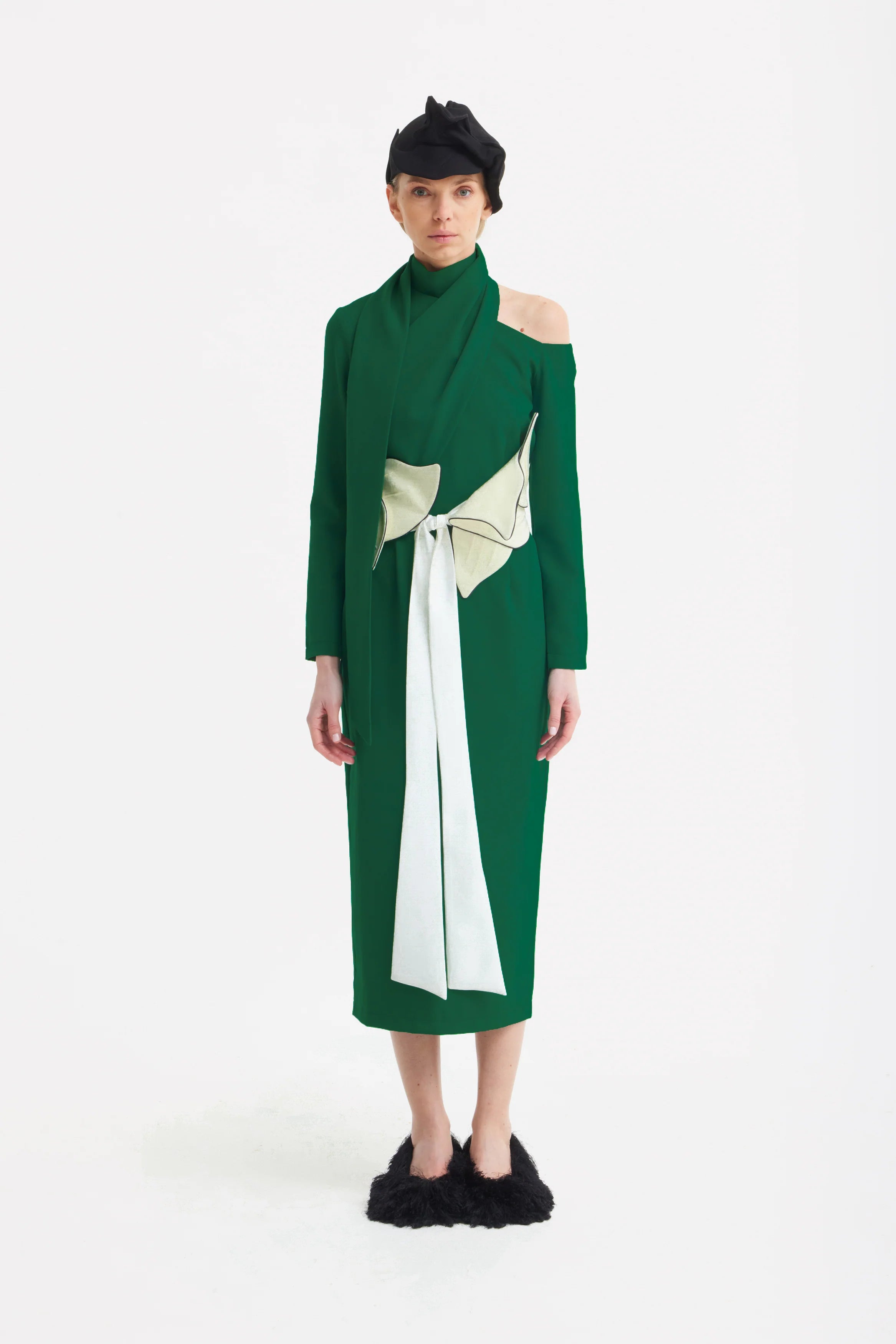 O declarație de eleganță modernă, această rochie midi verde se remarcă prin decolteul asimetric cu drapaj diagonal îndrăzneț, care lasă un umăr descoperit pentru un efect rafinat și memorabil. Realizată dintr-un material premium cu textură moale, ușor puf și o strălucire subtilă, îmbină luxul cu confortul.
