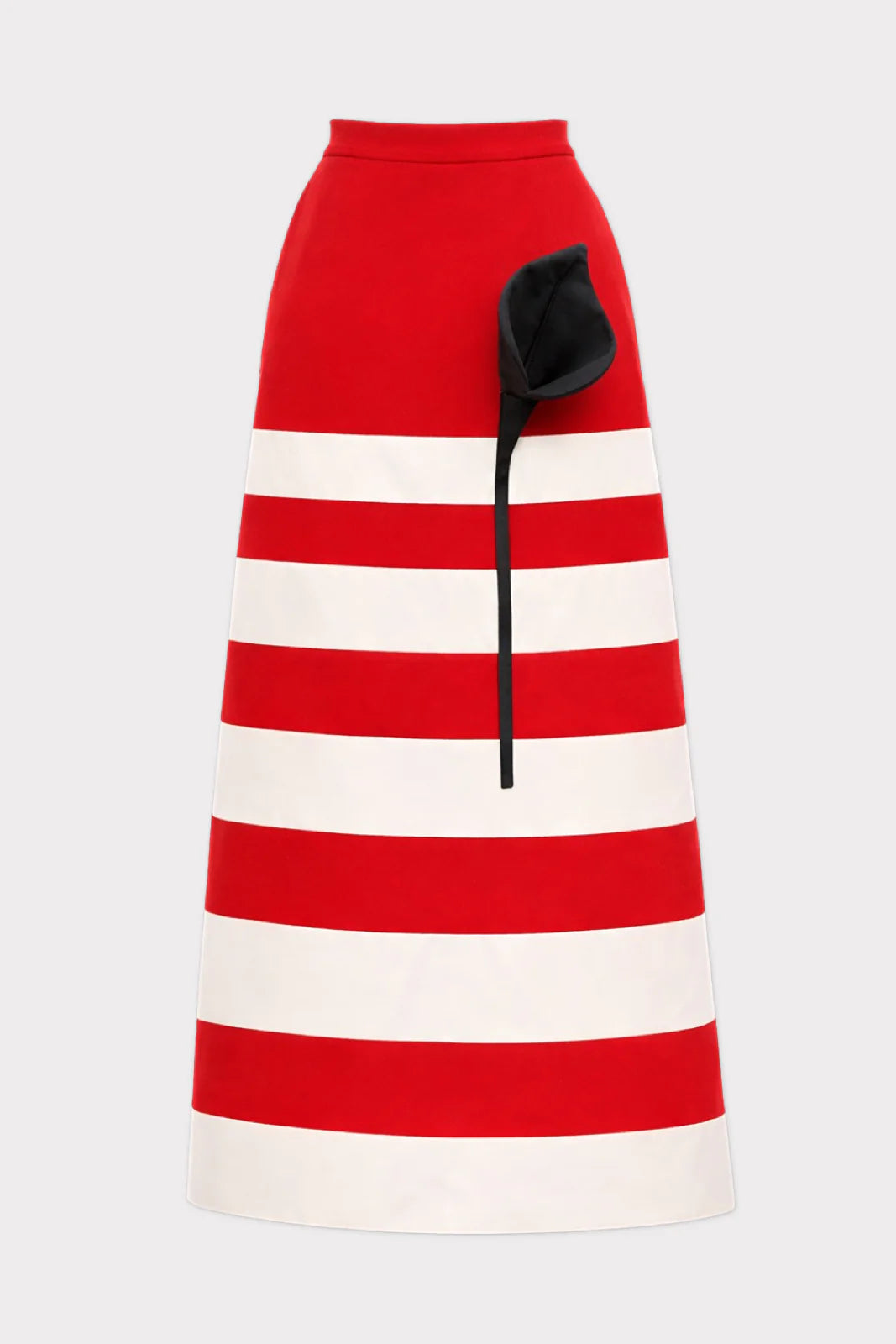 Această fustă în linie A îmbină blocurile cromatice îndrăznețe cu un detaliu artistic distinctiv. Baza roșu vibrant este structurată de dungi orizontale late ivoire, creând un ritm vizual puternic și evidențiind silueta alungită.