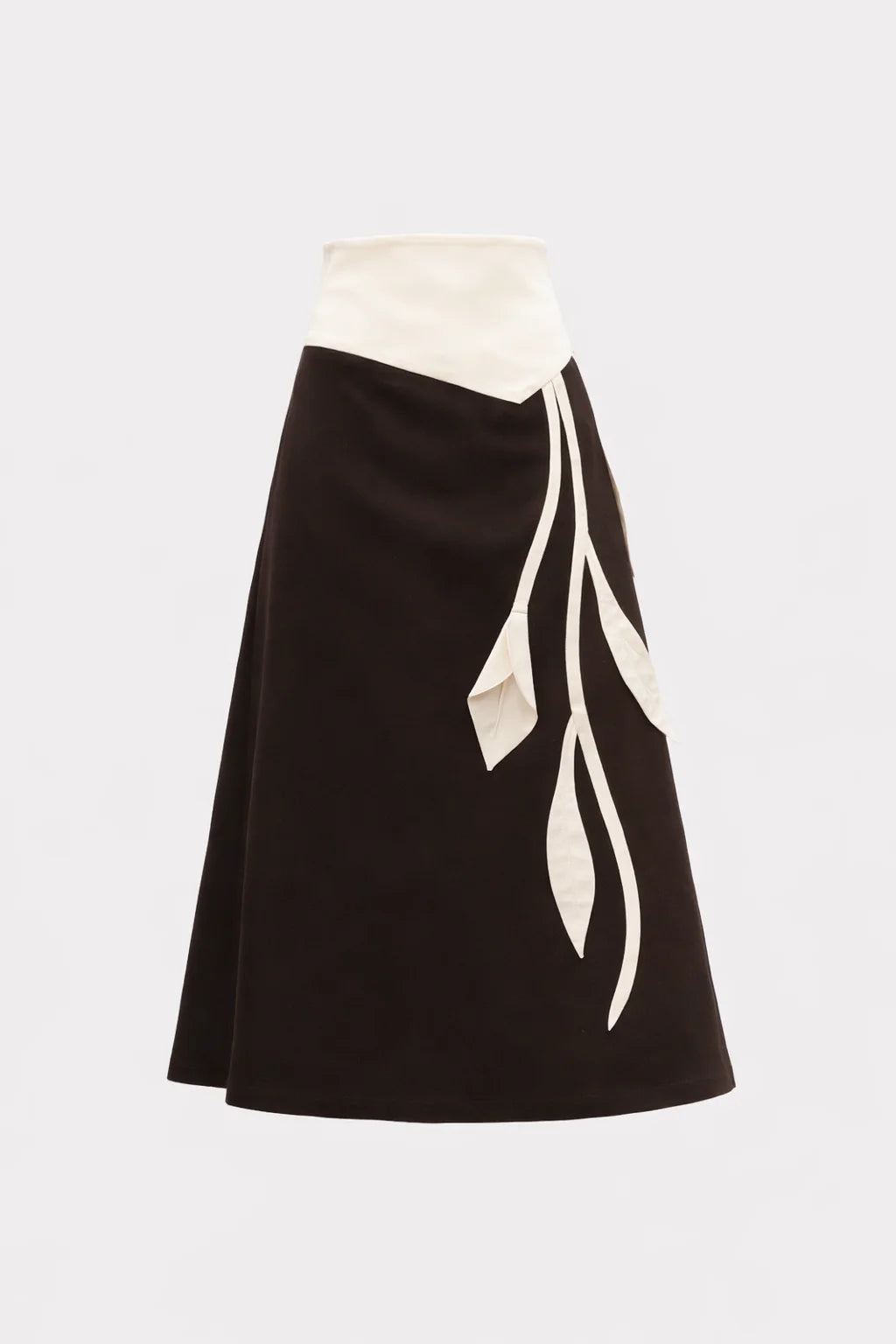 Această fustă midi evazată îmbină o siluetă curată și fluidă cu un detaliu sculptural ce aduce o notă subtil artistică eleganței de zi cu zi. Baza maro intens oferă profunzime și căldură, iar talia înaltă ivoire introduce contrast și structură.