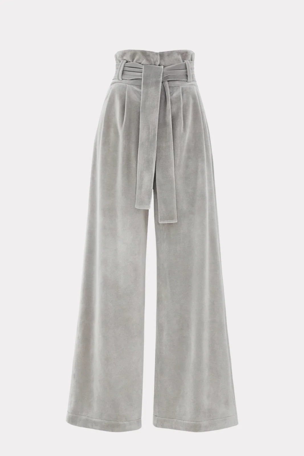 Atemporali și rafinați, acești pantaloni din catifea gri deschis redefiniesc croitoria contemporană prin echilibrul dintre delicatețe și forță. Realizați din catifea pe bază de vâscoză, au un luciu subtil ce evidențiază silueta sculpturală. Talie înaltă și croiala wide-leg alungesc vizual silueta, în timp ce pliurile structurate și betelia tip corset, completată de o curea subțire, adaugă un plus de rafinament.