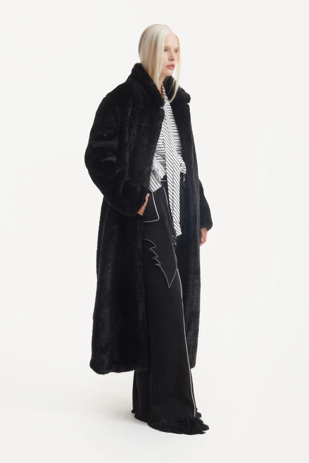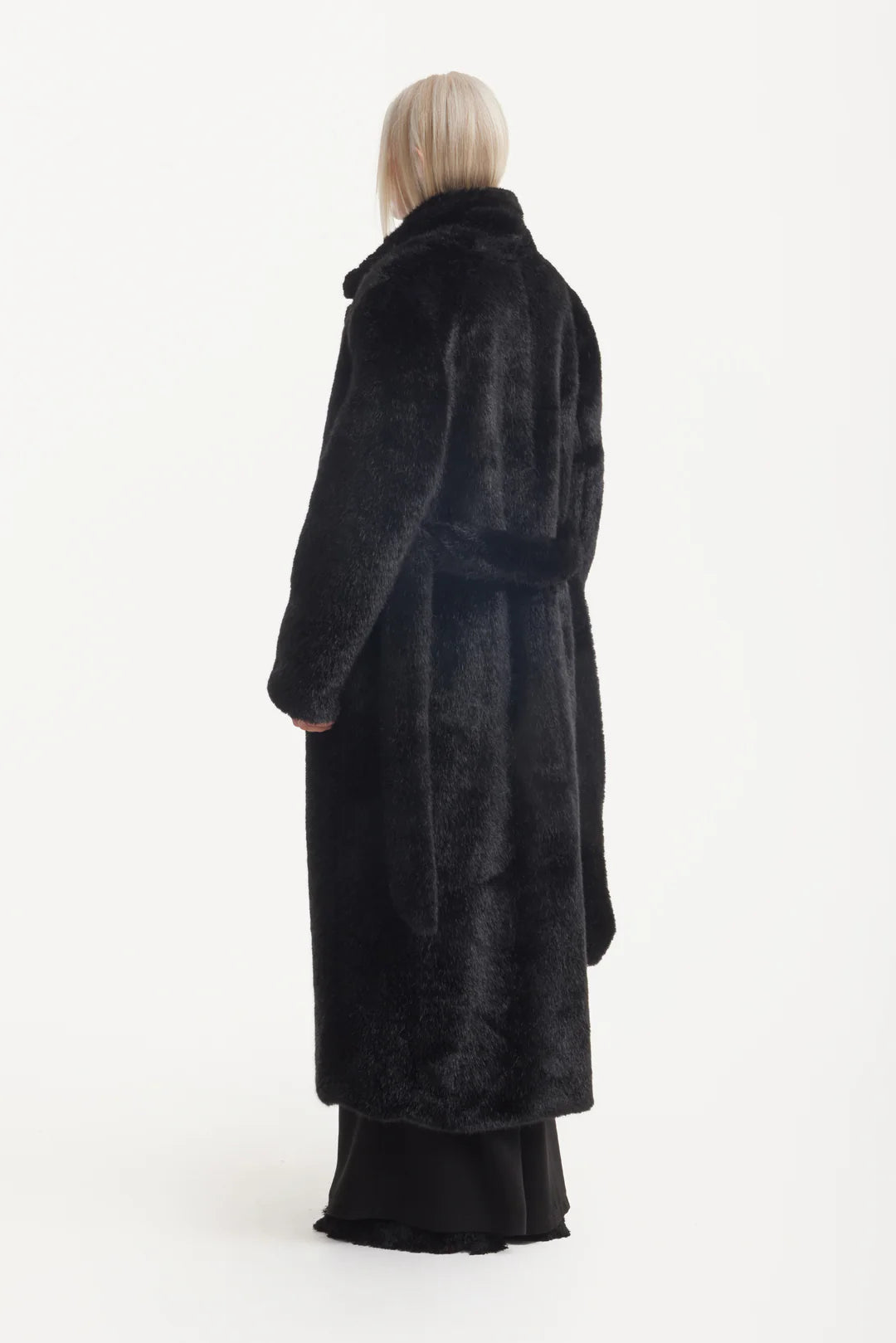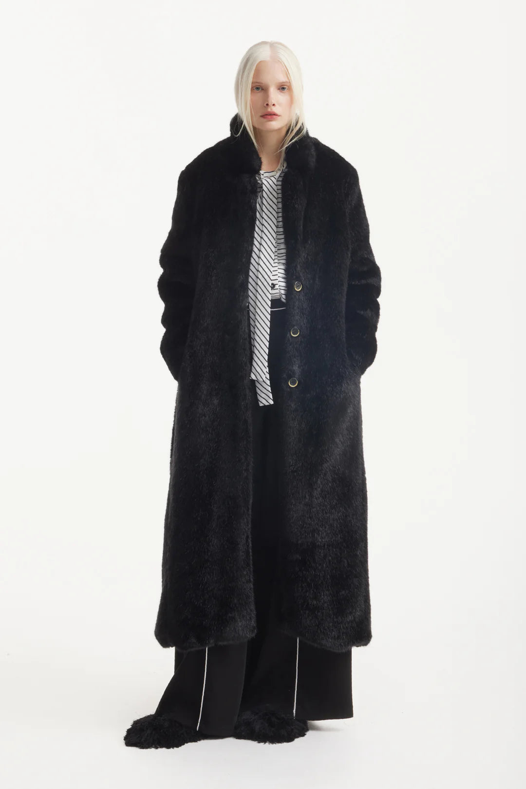 Descoperiți rafinamentul fără efort cu acest palton luxos din blană artificială neagră. Textura sa moale și pufoasă imită căldura și eleganța blănii naturale, oferind un look clasic cu un plus de etică. Cureaua accentuează talia pentru o siluetă feminină, iar lungimea până la genunchi permite multiple opțiuni de stilizare.