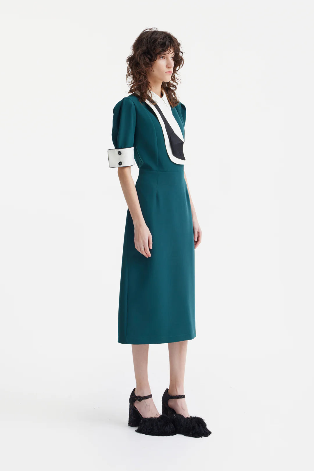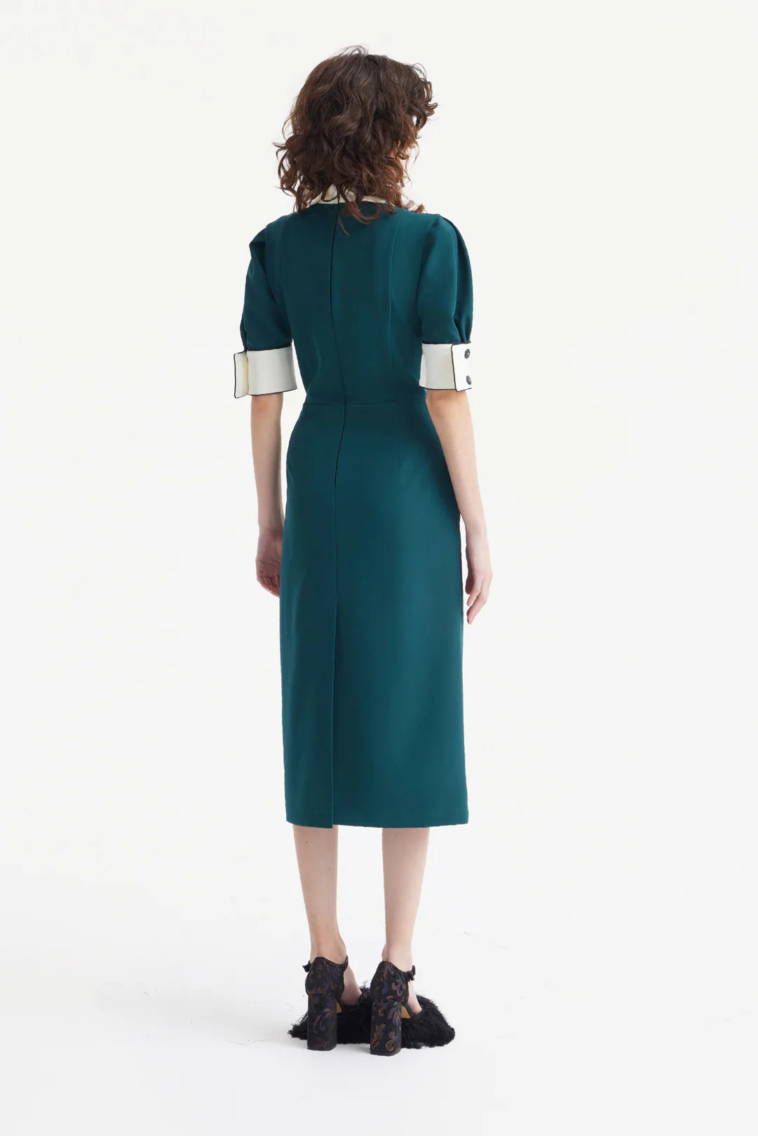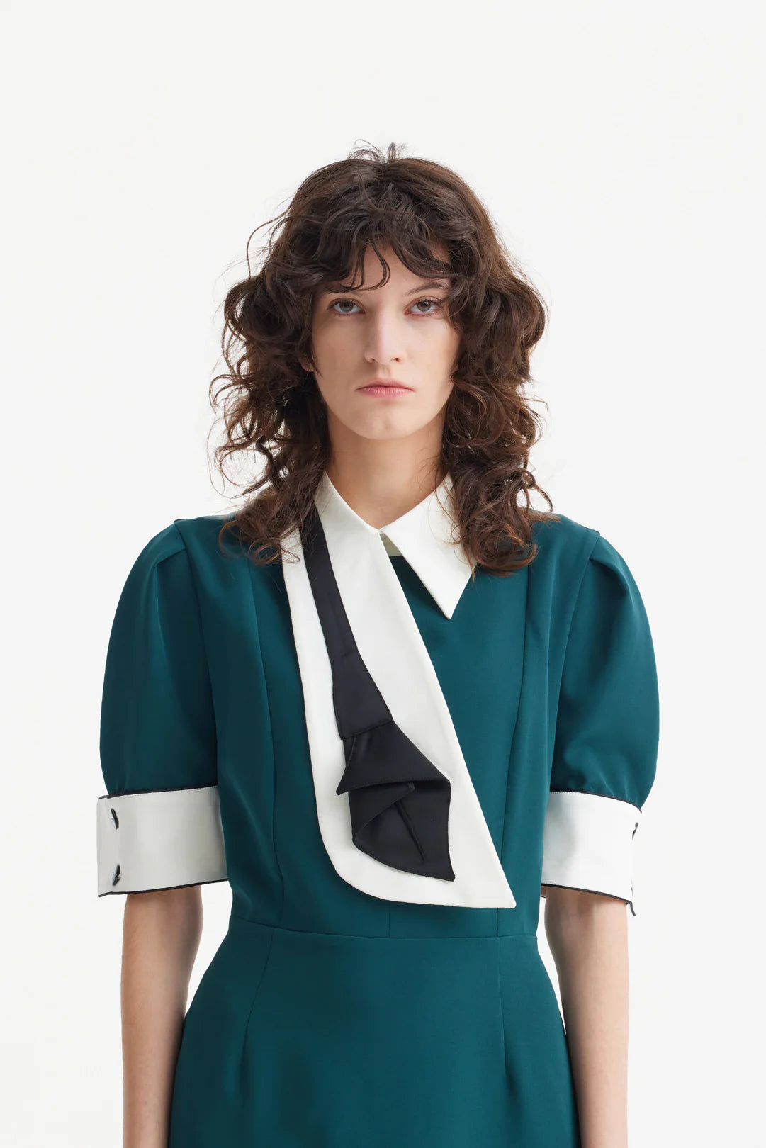 Această rochie midi verde îmbină croiala clasică cu un contrast îndrăzneț. Confecționată dintr-un amestec de vâscoză de înaltă calitate, oferă structură și, în același timp, o textură moale pentru confort pe tot parcursul zilei. Gulerul alb impecabil și detaliul frontal stratificat adaugă precizie grafică, iar mânecile scurte cu manșete albe late și accente cu nasturi completează finisajul rafinat.