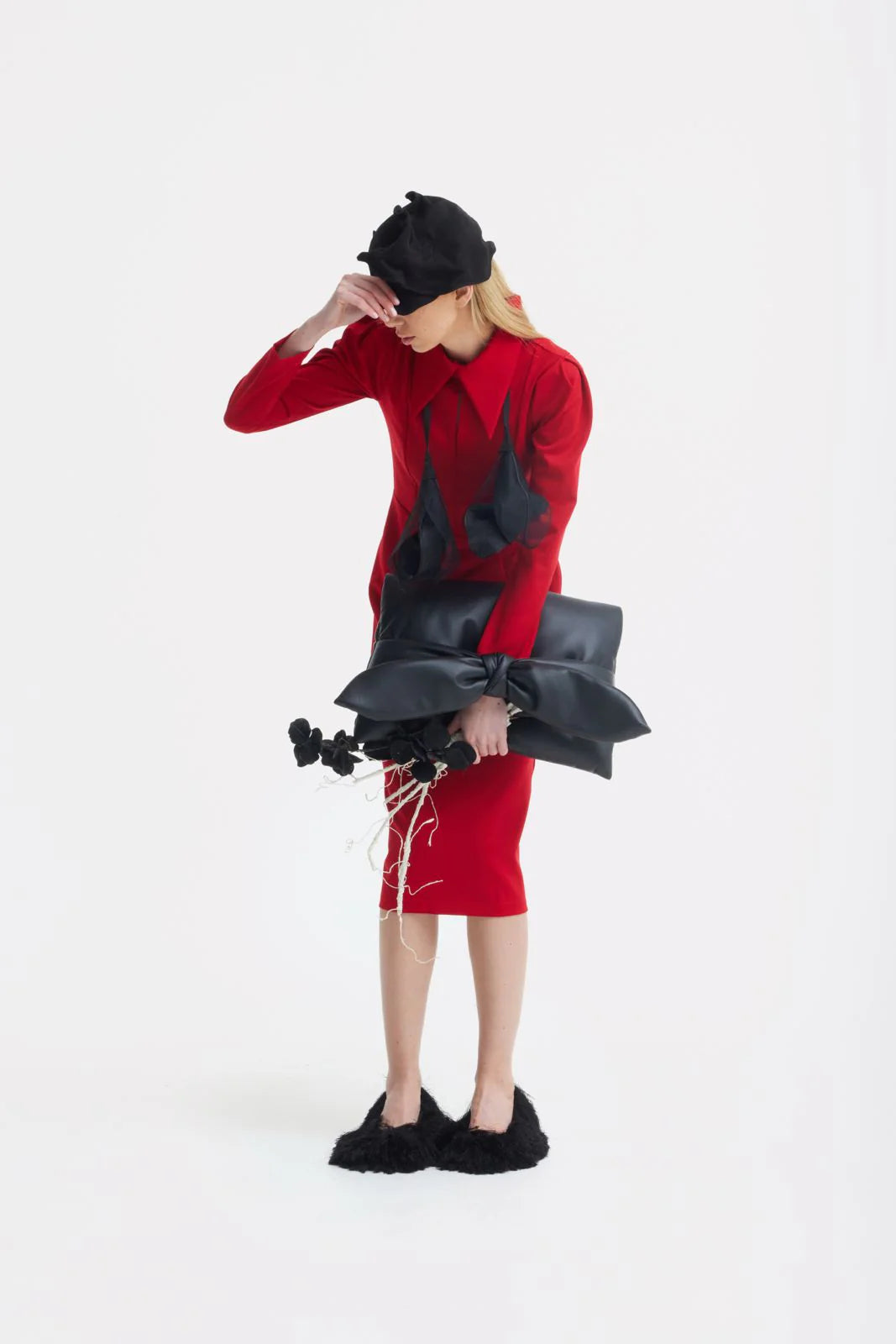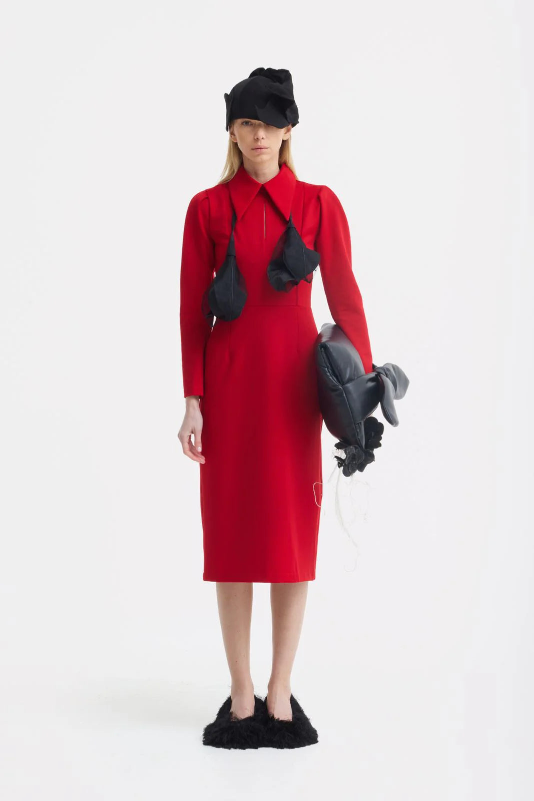 O rochie midi roșie rafinată, ce întruchipează încrederea, claritatea designului și feminitatea inteligentă. Realizată din viscoză moale, de greutate medie, aceasta cade lin pe corp, păstrând o siluetă elegantă și bine structurată. Gulerul ascuțit și decupajul subtil în zona pieptului introduc un accent arhitectural modern, echilibrând eleganța cu o atitudine contemporană.