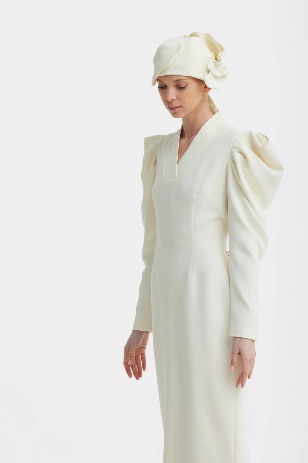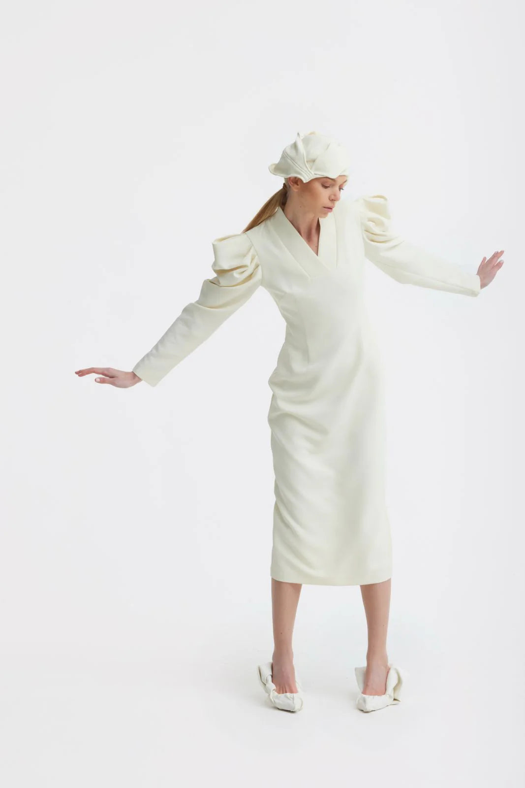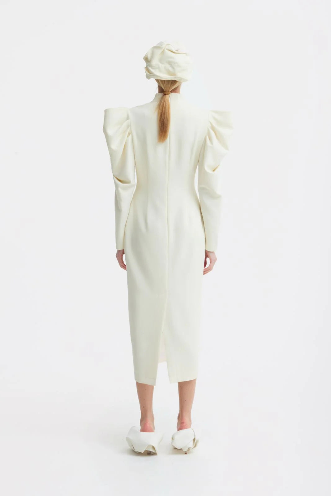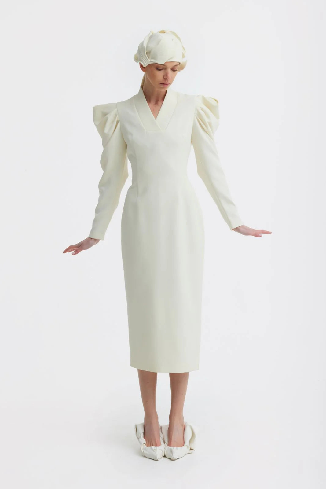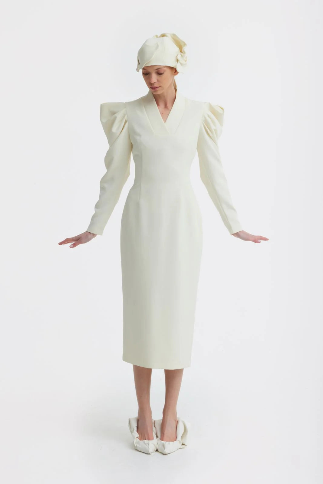 Silueta cambrată este echilibrată de mânecile bufante sculpturale, care adaugă volum și contrast arhitectural, în timp ce decolteul în V bine definit alungește partea superioară a corpului cu o eleganță discretă. Talia marcată conturează silueta și se continuă într-o fustă dreaptă midi, finisată cu o deschidere discretă la spate pentru libertate de mișcare.