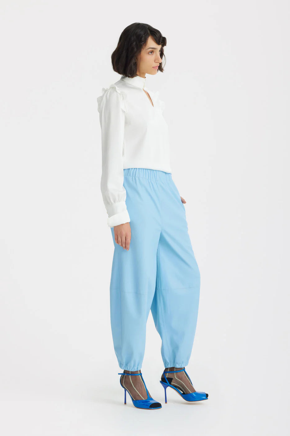 Structură delicată și dramatism subtil. Această bluză din satin ivory se remarcă prin mâneci lungi tip bishop, guler înalt cu închidere tip „lacrimă” și volănașe fine pe umeri. Creată să avantajeze fără exces, combină detaliile romantice cu o croială minimalistă. Confectionată în Europa din țesătură premium, este o piesă versatilă — potrivită atât pentru ținute rafinate de zi, cât și pentru apariții de seară discrete. O adiție atemporală pentru o garderobă conștientă.