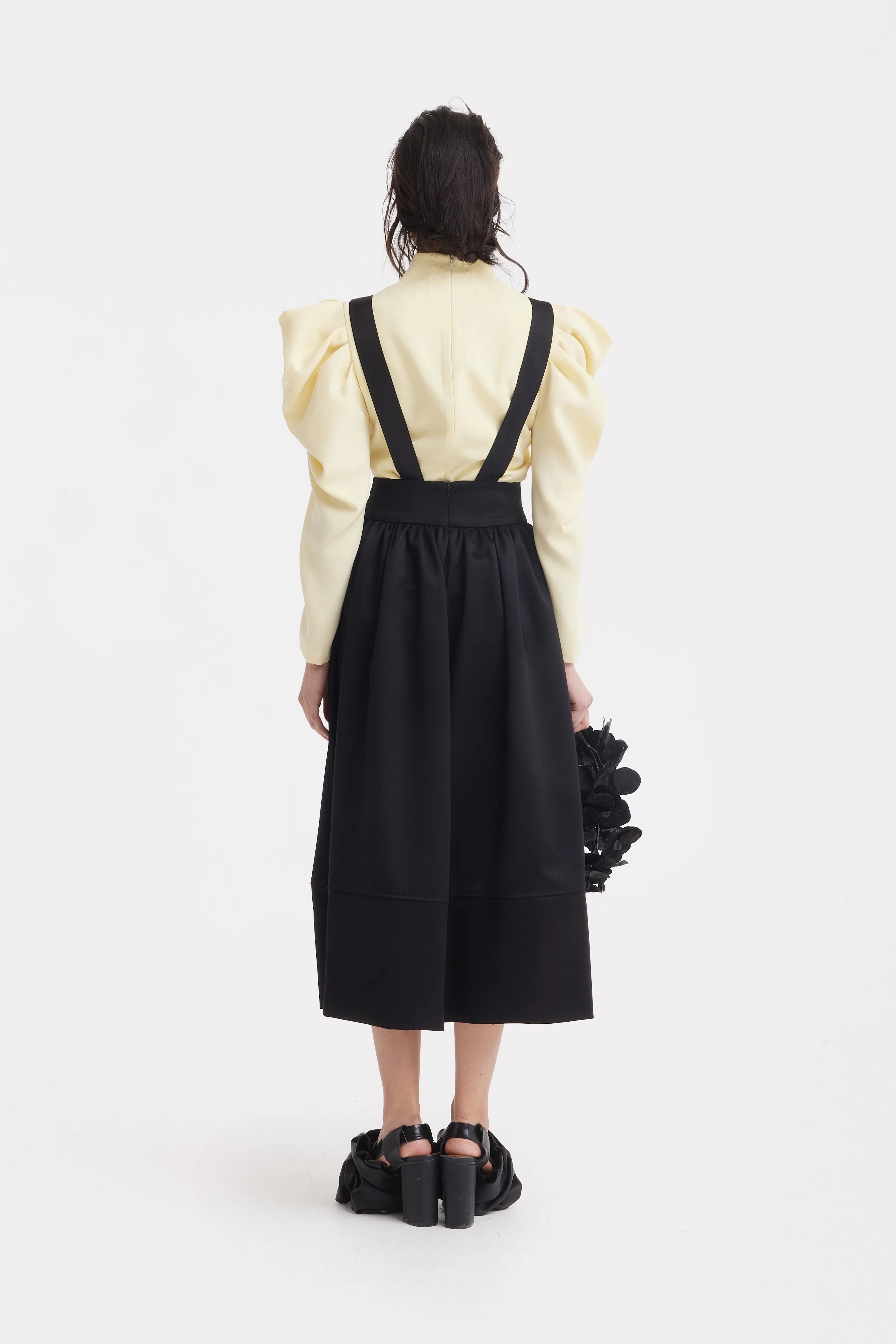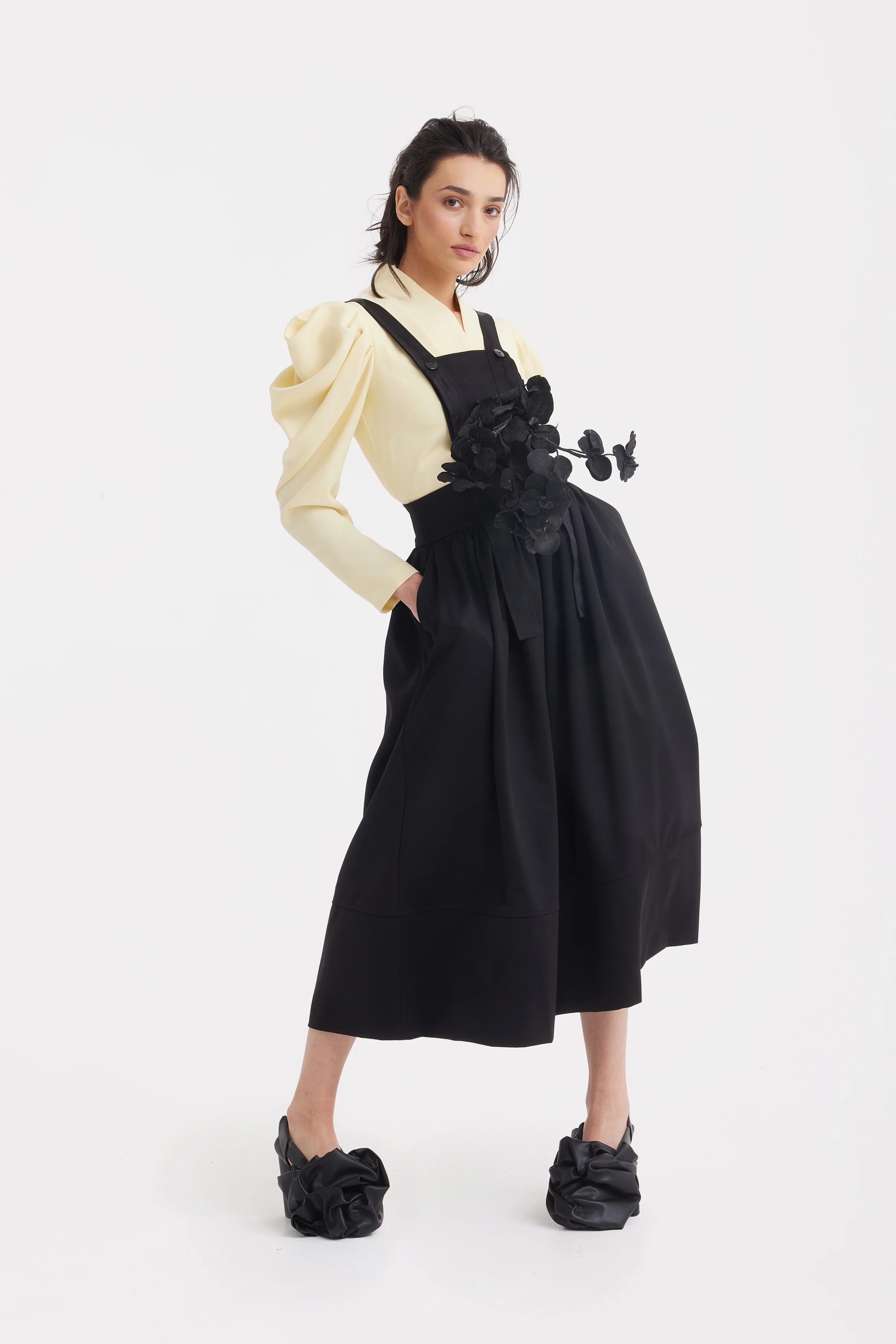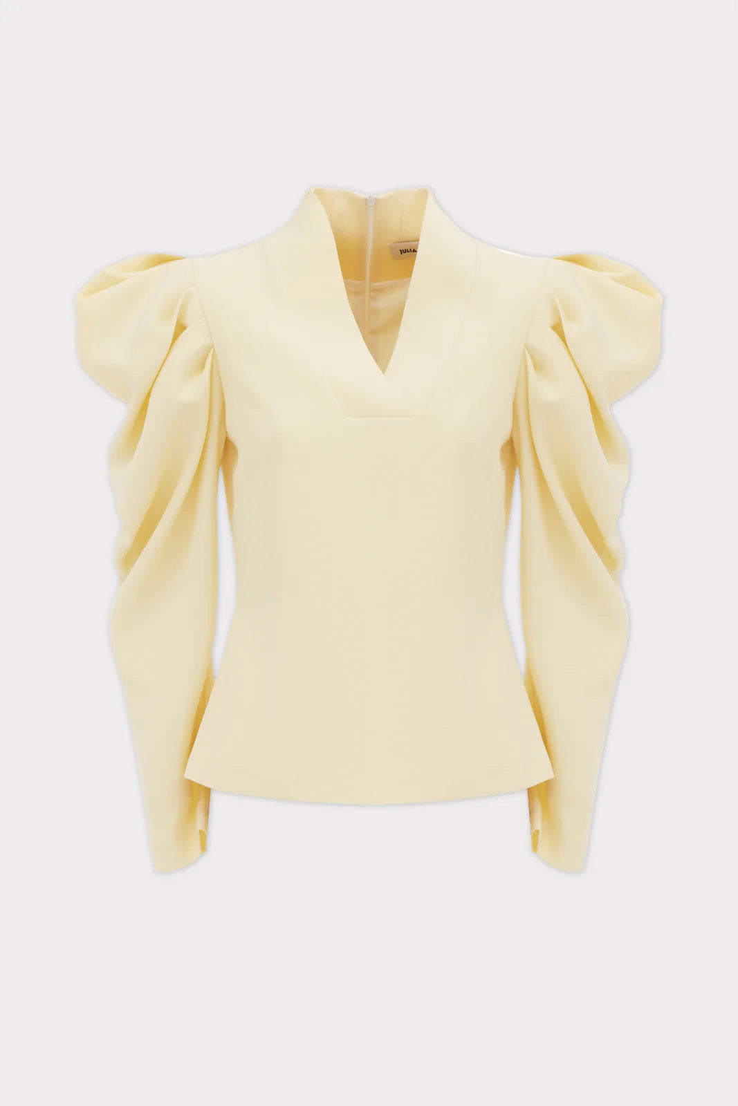 Această bluză sculpturală într-o nuanță delicată de galben pal îmbină o siluetă curată, conturată, cu un volum arhitectural îndrăzneț. Decolteul în V bine definit evidențiază linia claviculei și alungește vizual partea superioară a corpului, iar talia cambrată creează o formă feminină rafinată.