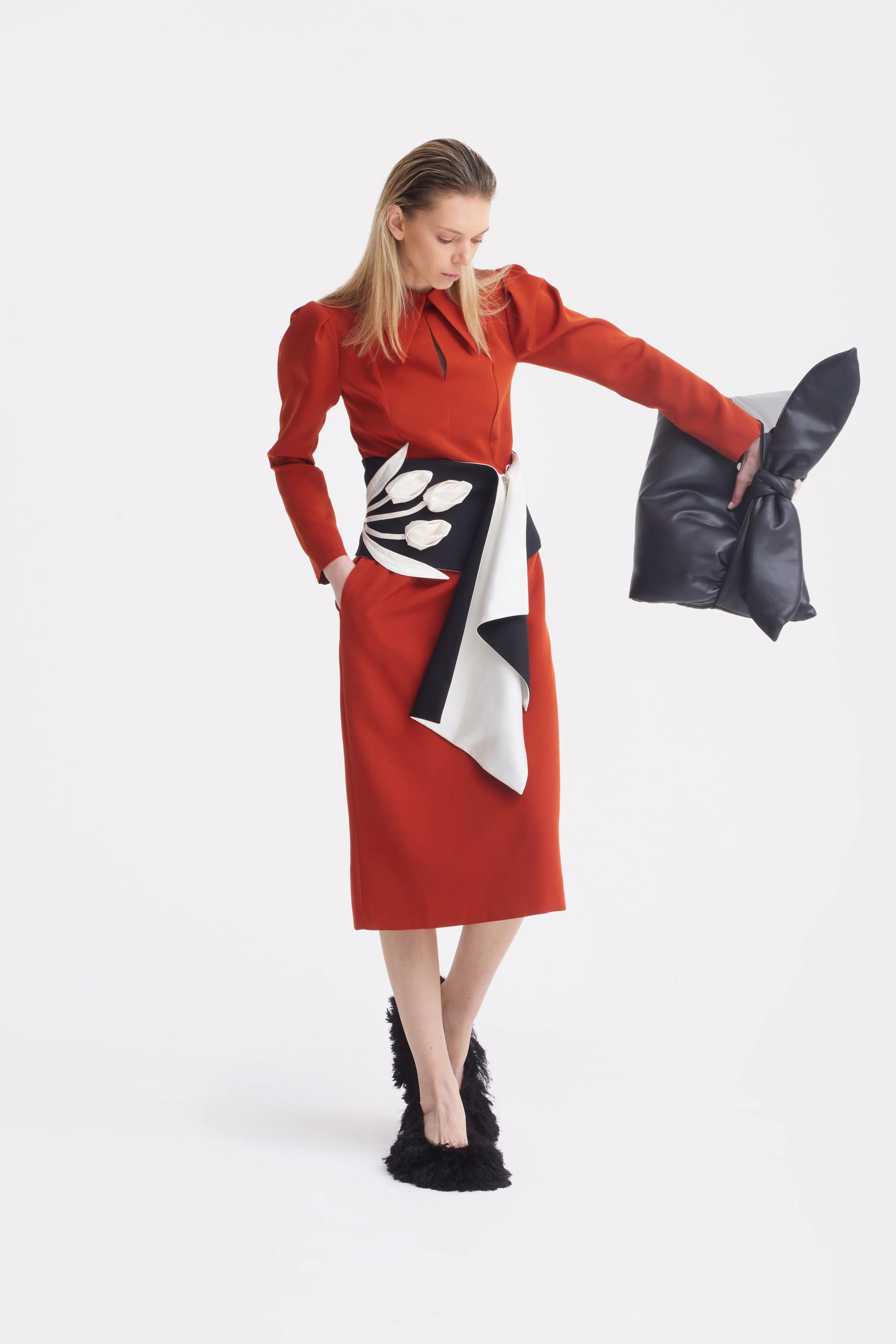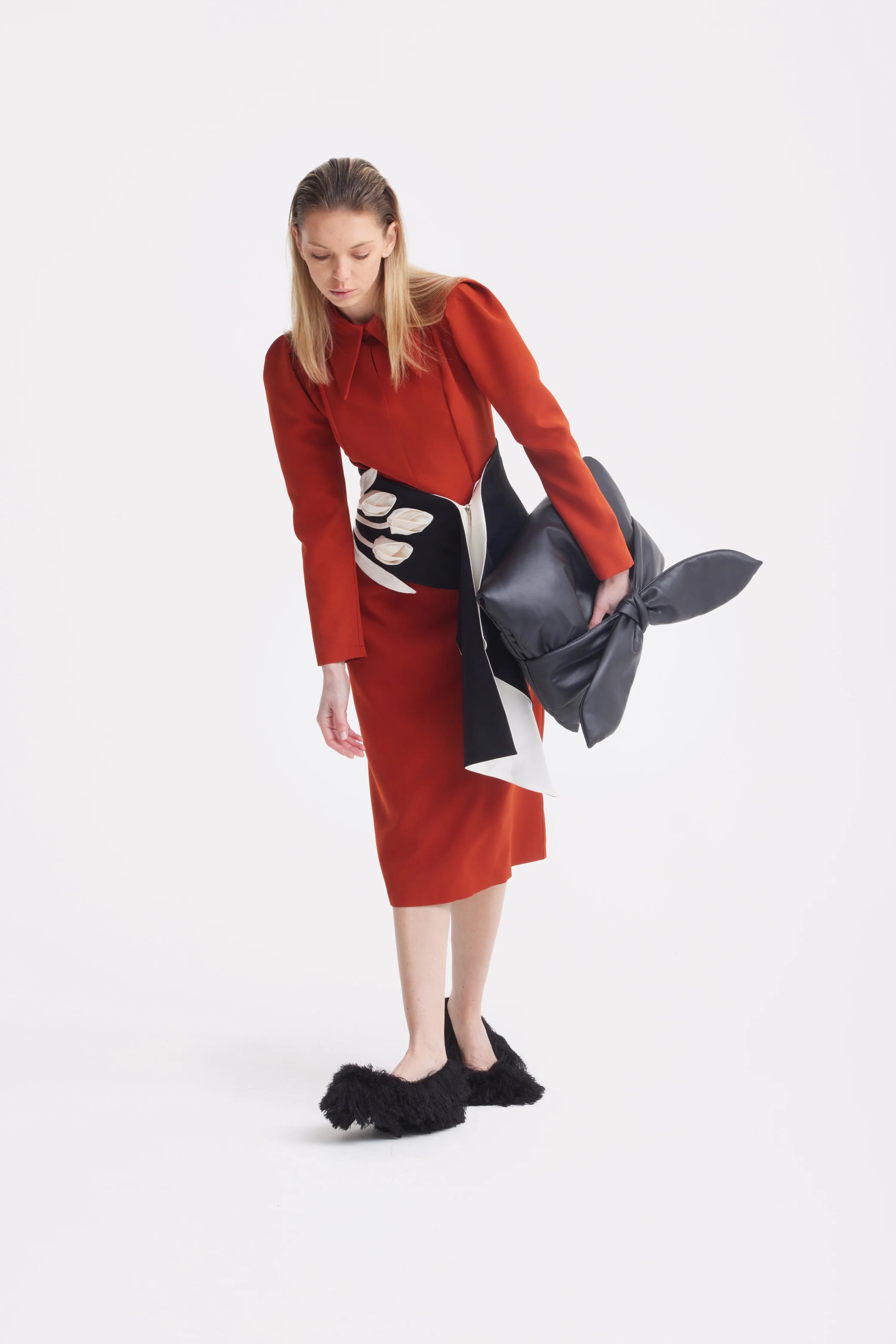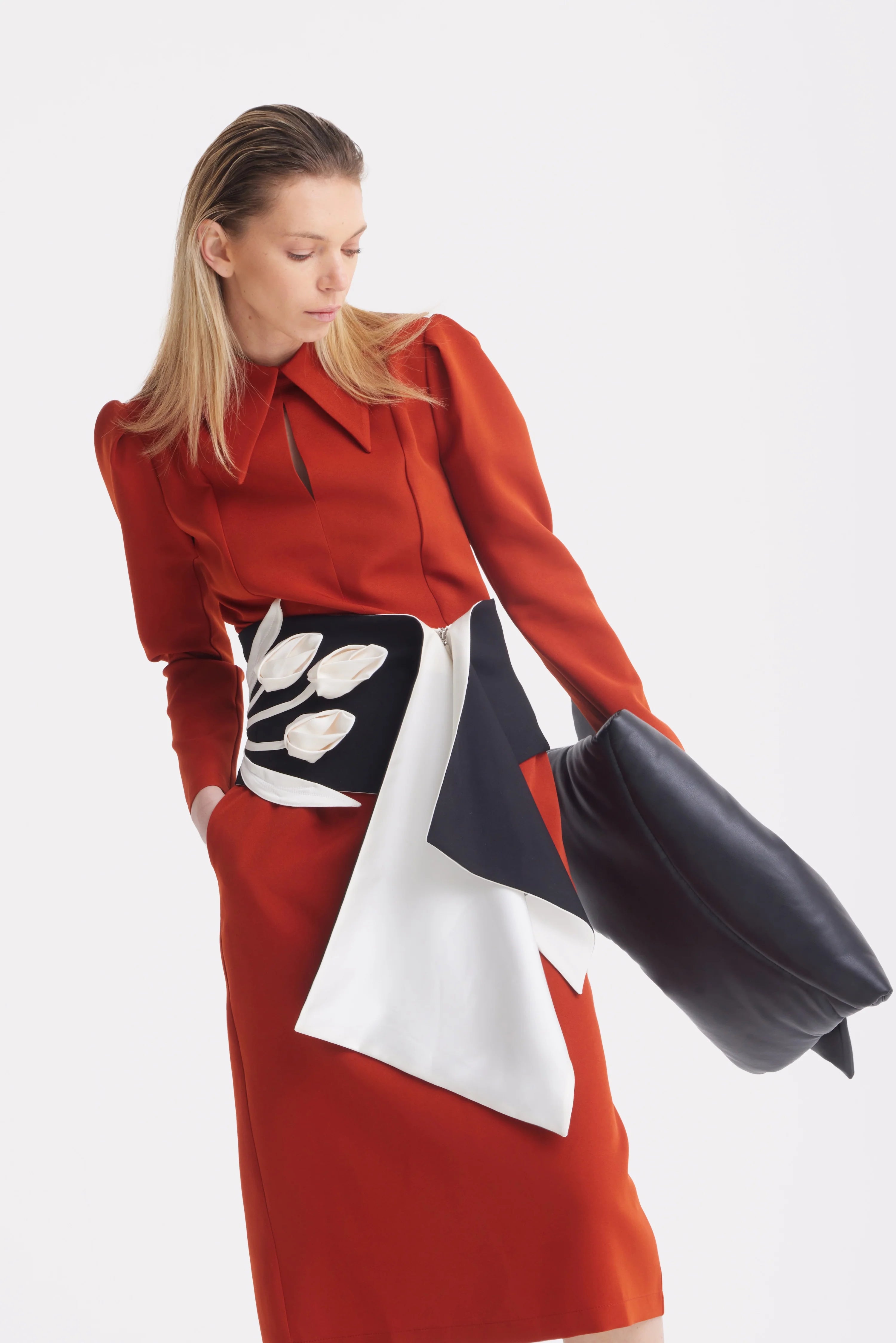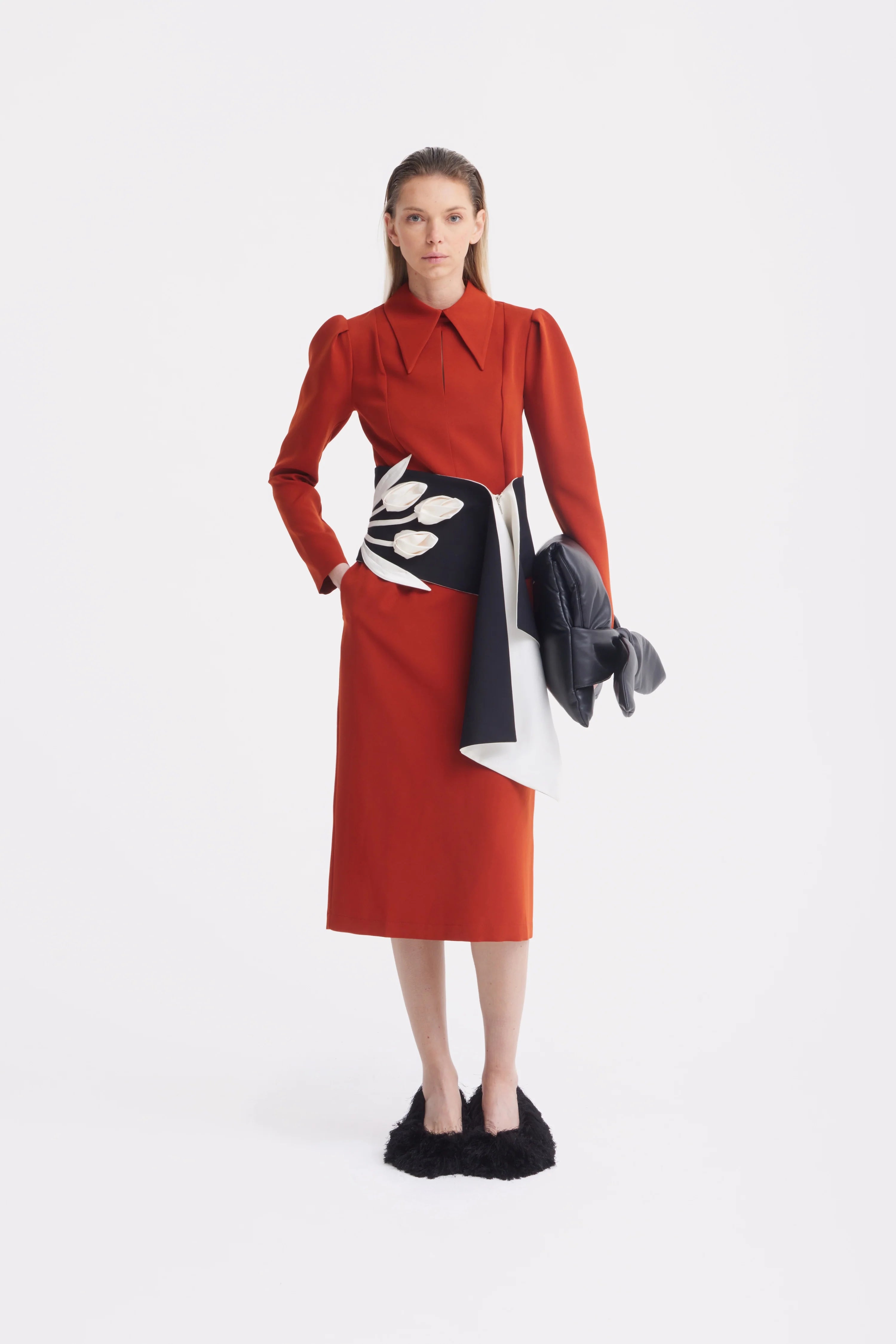 Această rochie midi în nuanță de teracotă exprimă eleganță rafinată cu un subtil accent arhitectural. Croiala evidențiază talia și se continuă armonios într-o fustă dreaptă de lungime midi, creând proporții feminine și echilibrate. Gulerul structurat și decupajul delicat tip lacrimă din față adaugă o notă sofisticată, iar umerii ușor conturați oferă volum discret și forță siluetei. Realizată dintr-un material neted și dens, cu o cădere impecabilă, rochia își păstrează forma pe tot parcursul zilei. Mânecile lungi și fermoarul ascuns la spate completează designul, făcând-o alegerea ideală pentru evenimente formale, întâlniri de afaceri sau seri elegante, unde încrederea se exprimă prin rafinament și măsură.