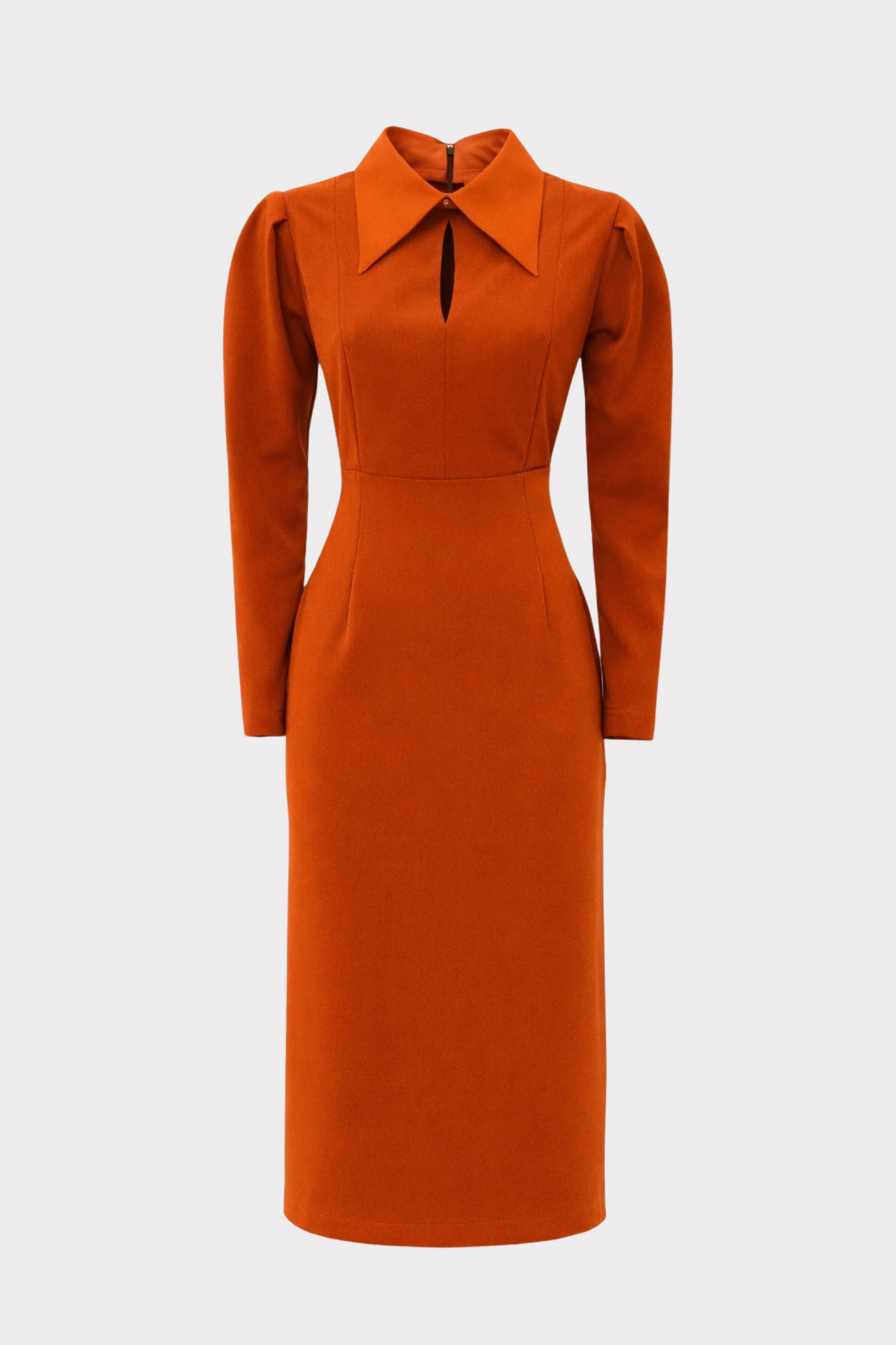 Это терракотовое платье миди воплощает утончённую элегантность с деликатным архитектурным акцентом. Крой подчёркивает талию и плавно переходит в прямую юбку миди-длины, создавая гармоничные и женственные пропорции. Структурированный воротник и изящный каплевидный вырез спереди добавляют образу изысканности, а мягко оформленные плечи придают силуэту сдержанный объём и характер. Платье выполнено из гладкой плотной ткани с безупречной драпировкой, благодаря чему сохраняет форму в течение всего дня. Длинные рукава и потайная застёжка-молния на спинке завершают образ, делая его идеальным выбором для официальных мероприятий, деловых встреч и элегантных вечерних выходов, где уверенность проявляется в сдержанности.