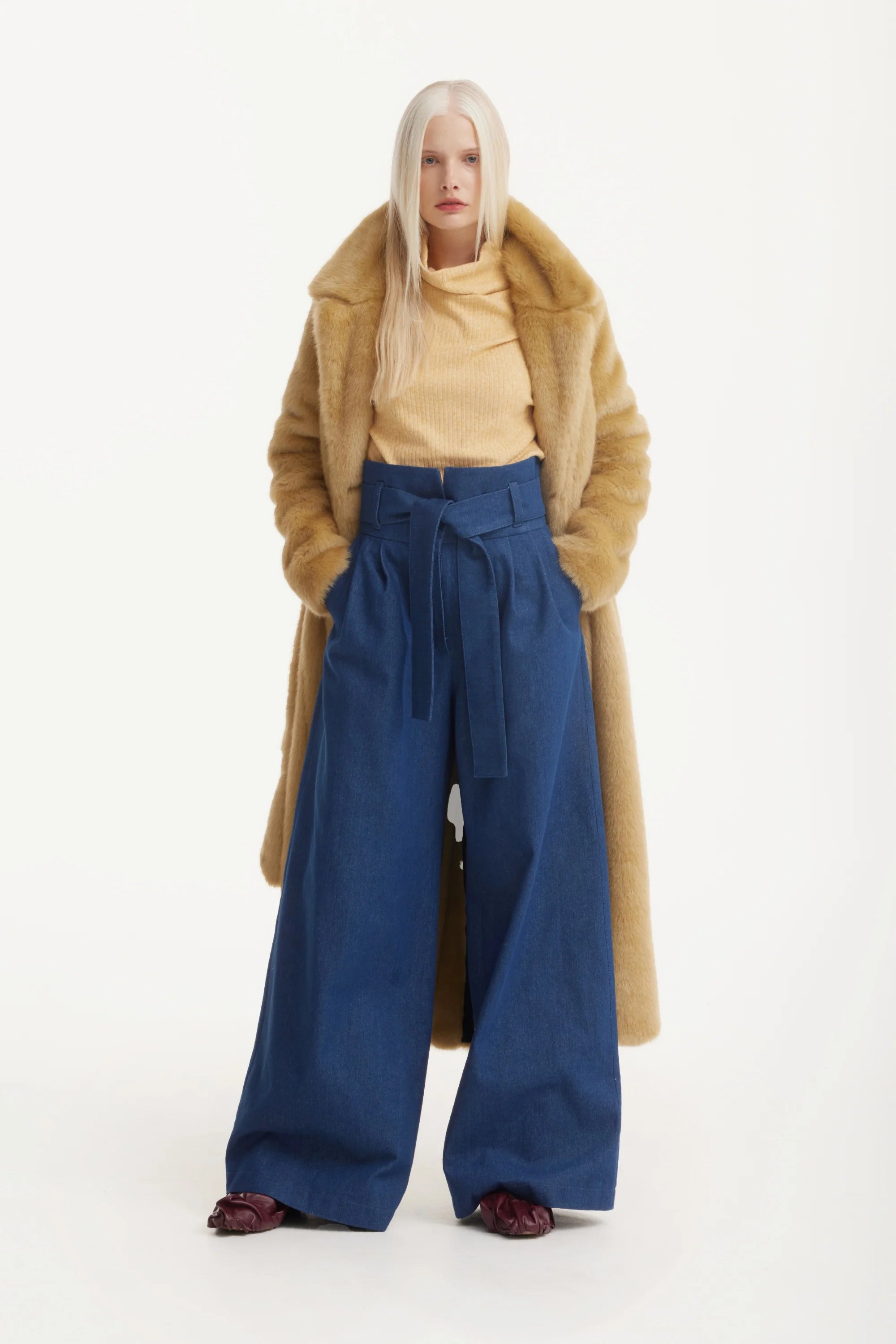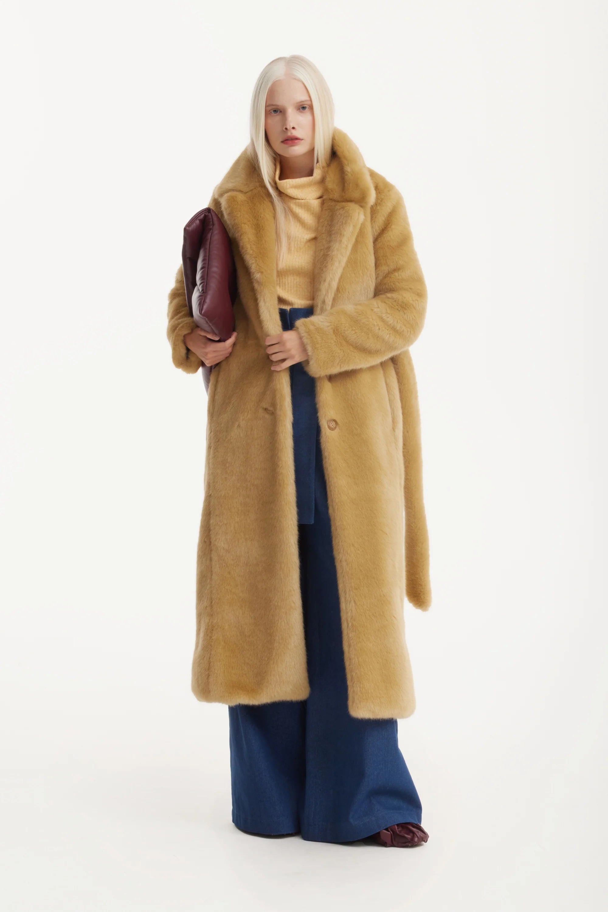 Окутайте себя комфортом и элегантностью с этим теплым бежевым демисезонным пальто из искусственного меха. Изготовленное из высококачественного, этичного меха, оно обладает мягкой, роскошной текстурой и дарит тепло без ущерба для природы. Длина ниже колена и пояс на талии создают утонченный и женственный силуэт, подходящий как для повседневных образов, так и для торжественных случаев.