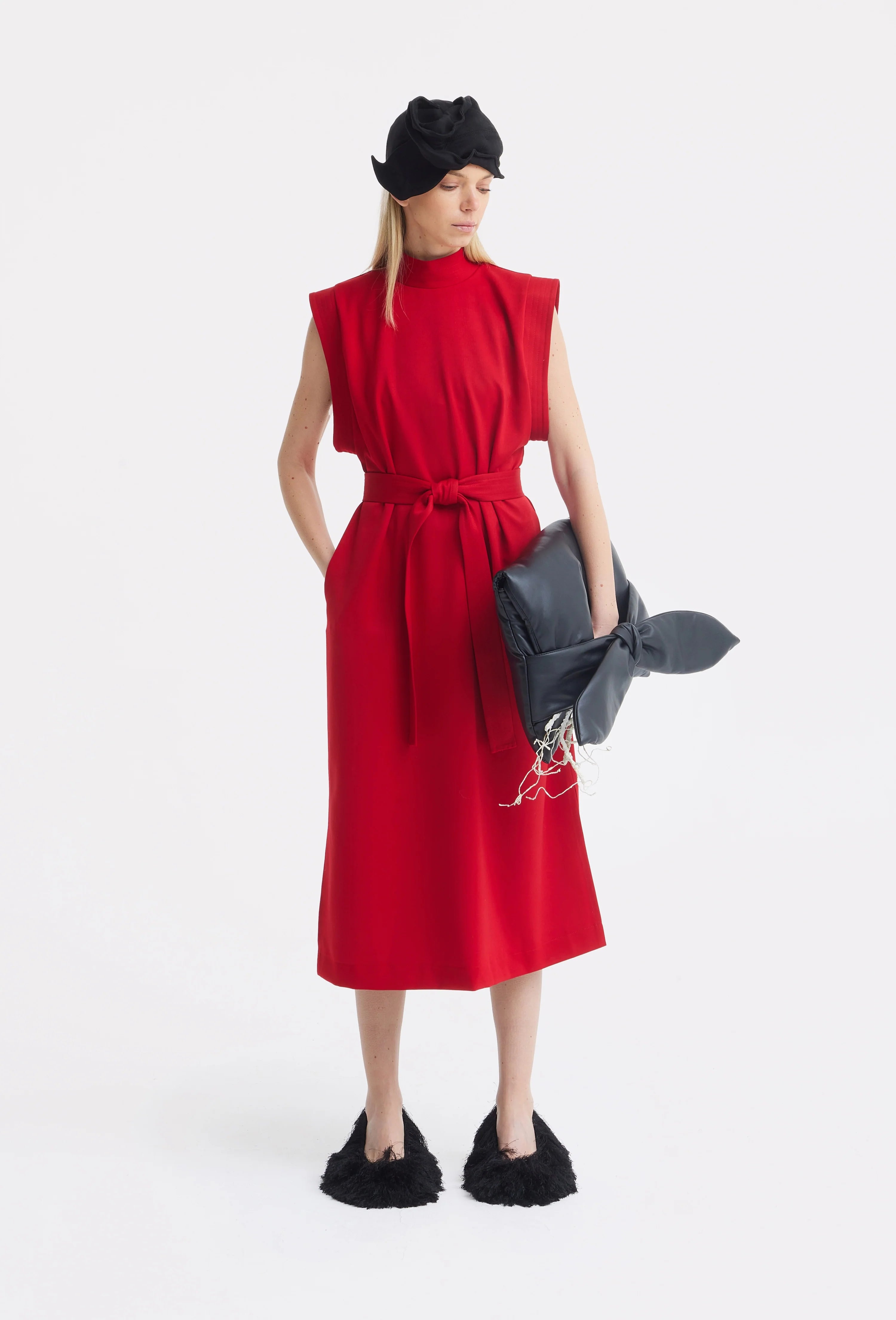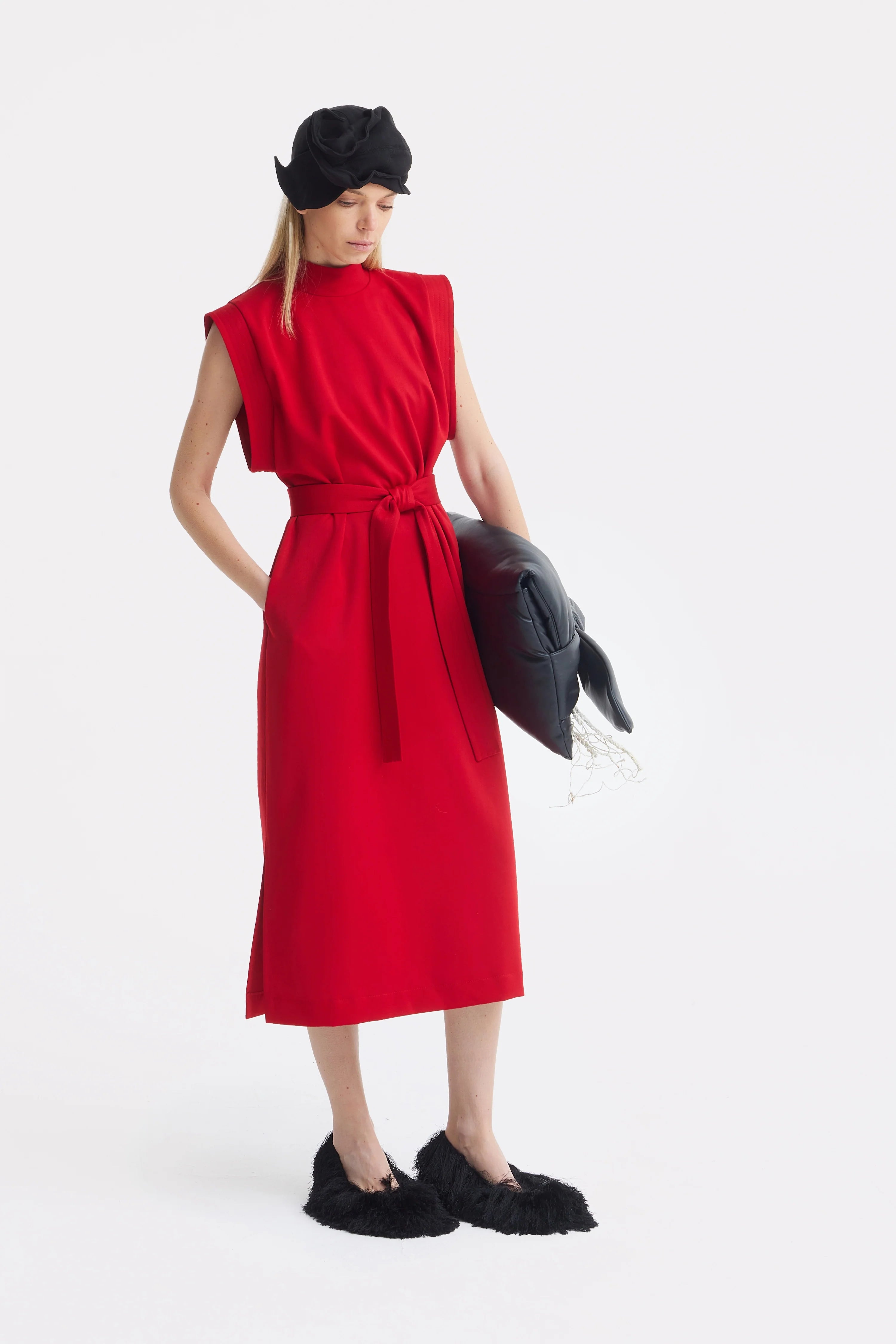 Выразительное в своей простоте, это красное миди-платье прямого кроя от Julia Allert воплощает структурированную элегантность и универсальность без усилий. Выполненное из костюмной вискозы с деликатным блеском, ткань обладает гладкой текстурой, лёгким сиянием и комфортом на весь день, сохраняя при этом чёткую архитектурную форму.