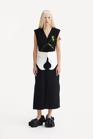 Платье без рукавов с V-образным вырезом и поясом – черно-белое