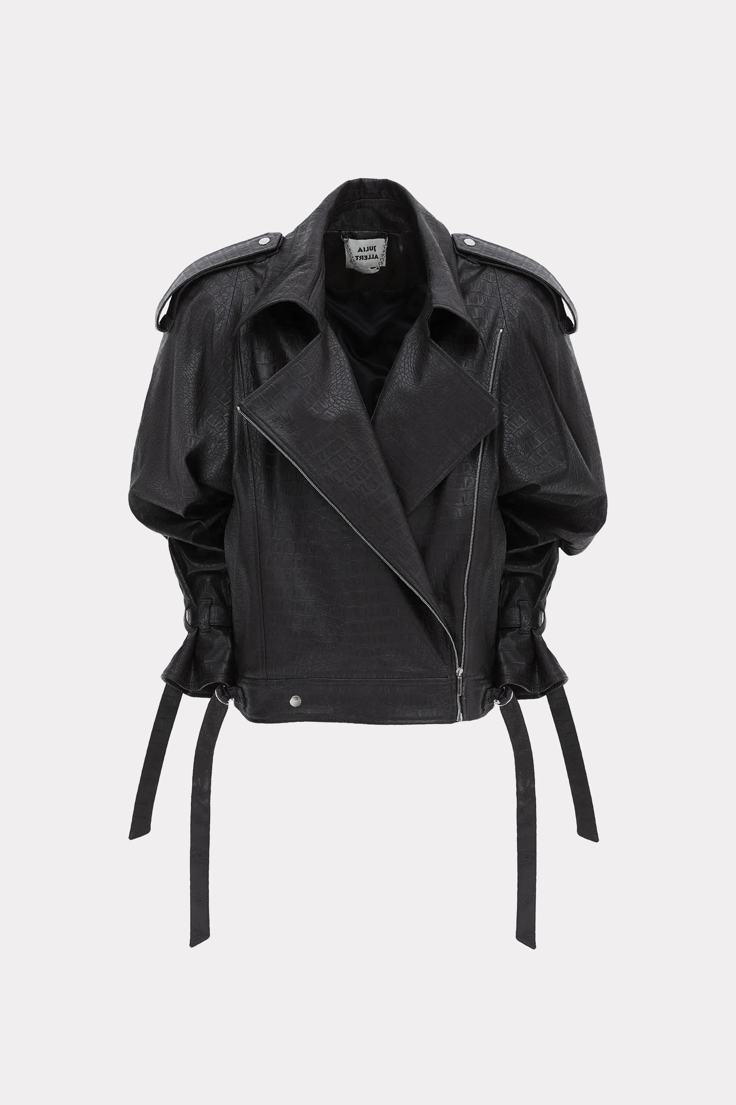 Смелая интерпретация классической верхней одежды. Эта чёрная куртка оверсайз выполнена из мягкой экокожи с утончённой фактурой под крокодила, сочетая структуру, комфорт и выразительность. Широкие лацканы, спущенная линия плеч и регулируемые ремни на манжетах и по бокам придают образу байкерское настроение в сочетании с архитектурным кроем Julia Allert. Асимметричная молния и кнопки подчеркивают скульптурный силуэт, а гладкая подкладка обеспечивает комфорт и лёгкость многослойных сочетаний. Универсальная эффектная вещь, которая легко адаптируется от дневного к вечернему стилю — идеально сочетается с платьями, брюками или костюмами, добавляя современную силу и характер.