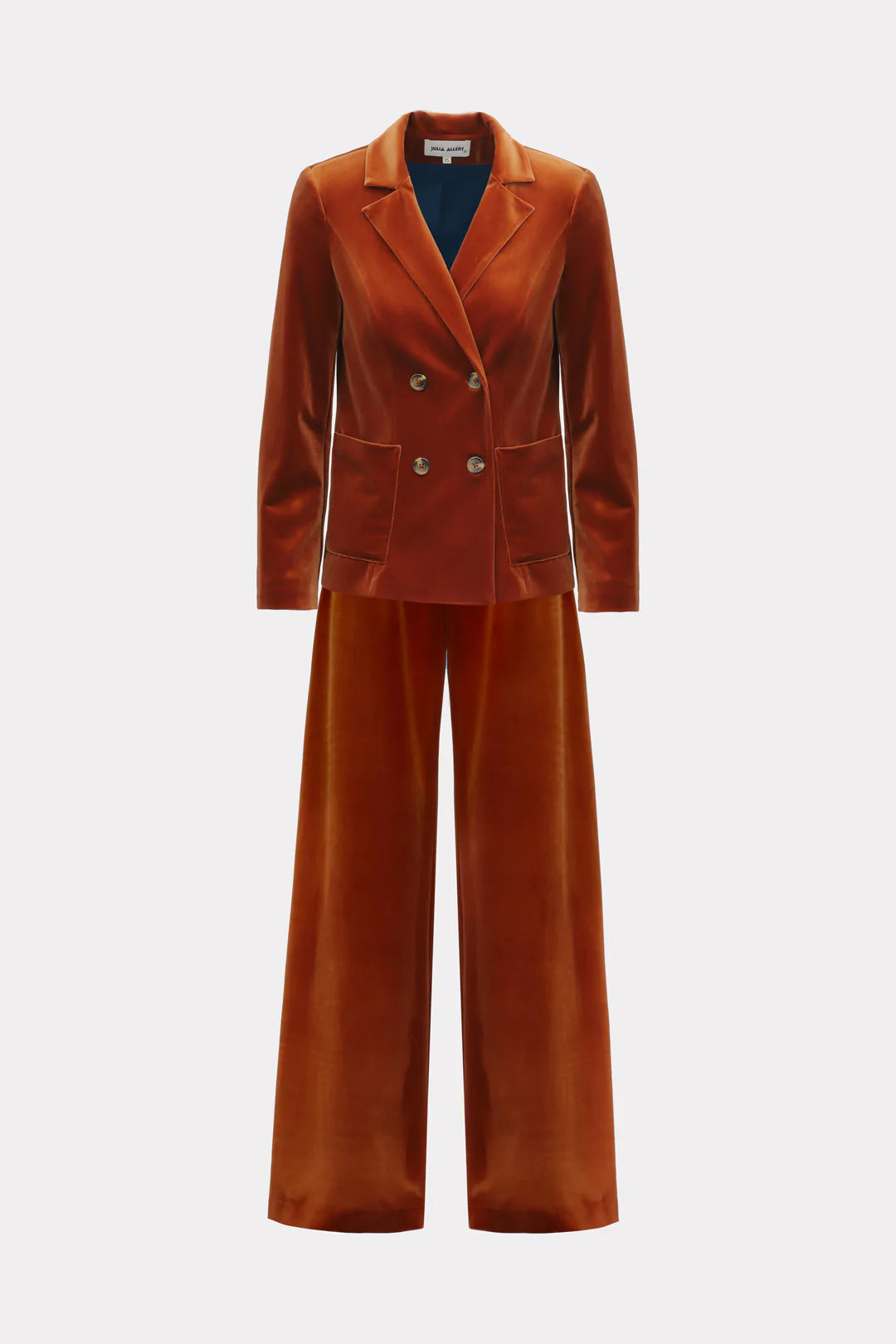 Confecționat din catifea moale în nuanța sienna arsă, acest sacou Julia Allert îmbină croiala precisă cu o căldură vintage. Croiul cu două rânduri de nasturi, umerii structurați și strălucirea discretă creează o siluetă elegantă și rafinată. Perfect purtat cu pantalonii asortați sau cu blugi pentru un look sofisticat și modern, este o piesă versatilă care unește rafinamentul cu individualitatea.