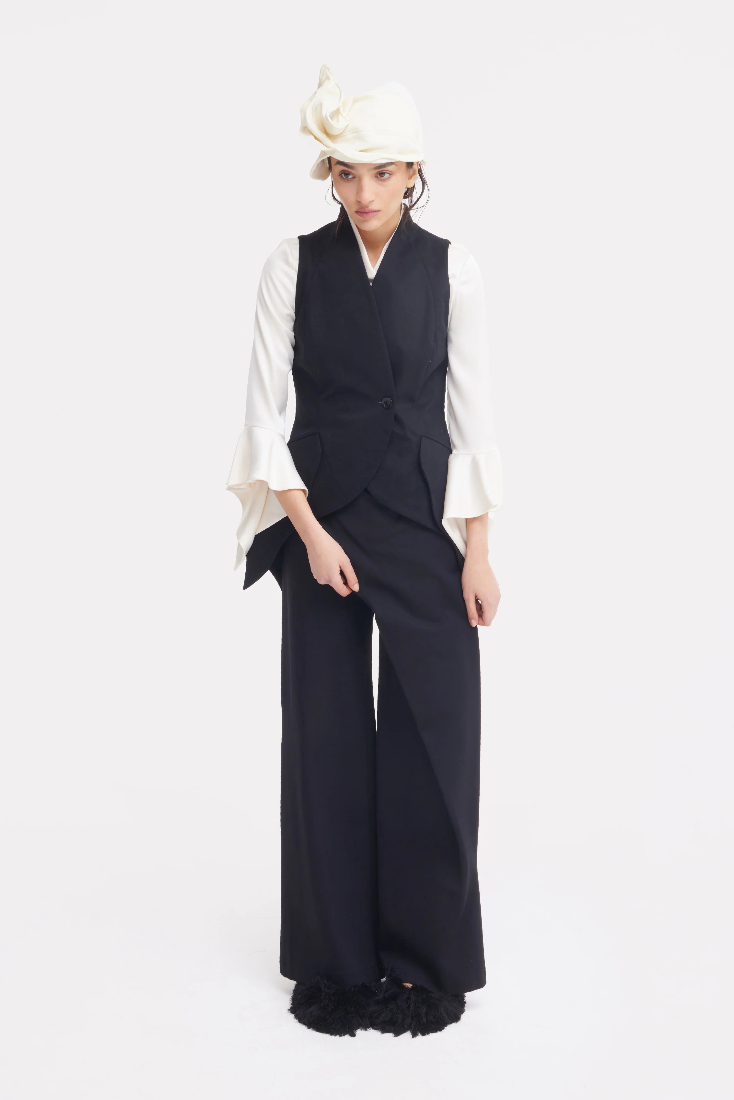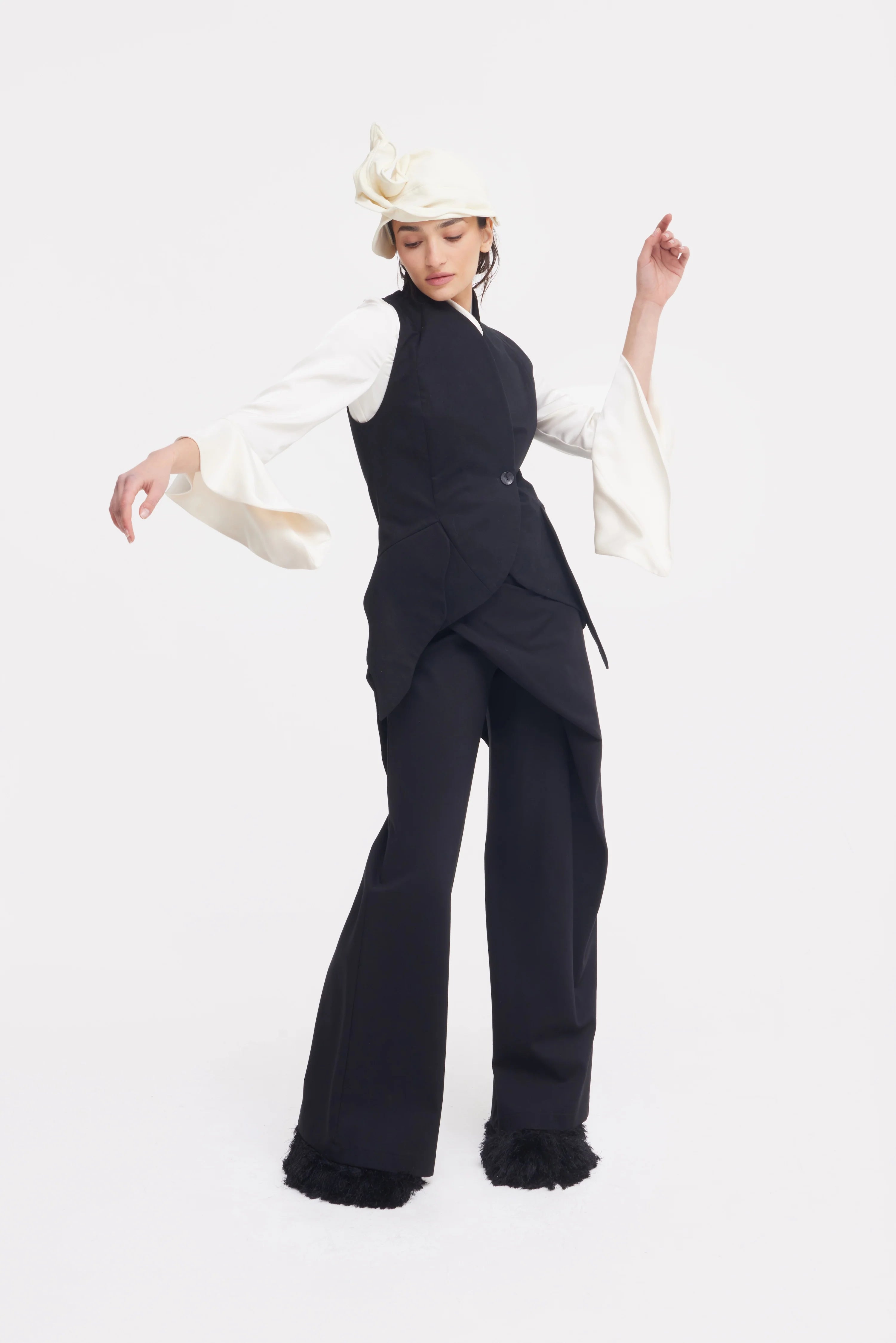 Вневременное воплощение современной элегантности. Выполненная из гладкого, струящегося атласа, эта блуза украшена скульптурным асимметричным воротником, который мягко обрамляет линию шеи, создавая изысканный акцент. Свободный силуэт уравновешен удлинёнными рукавами с расклешёнными манжетами, дополненными деликатными завязками, придающими образу движение и лёгкость.