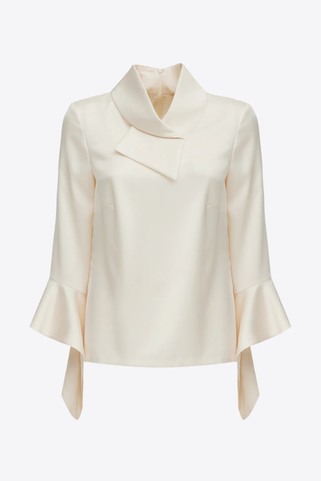 Свободный крой · Атласная ткань · Асимметричный воротник · Длинные рукава с расклешёнными манжетами · Мягкий блеск · Айвори