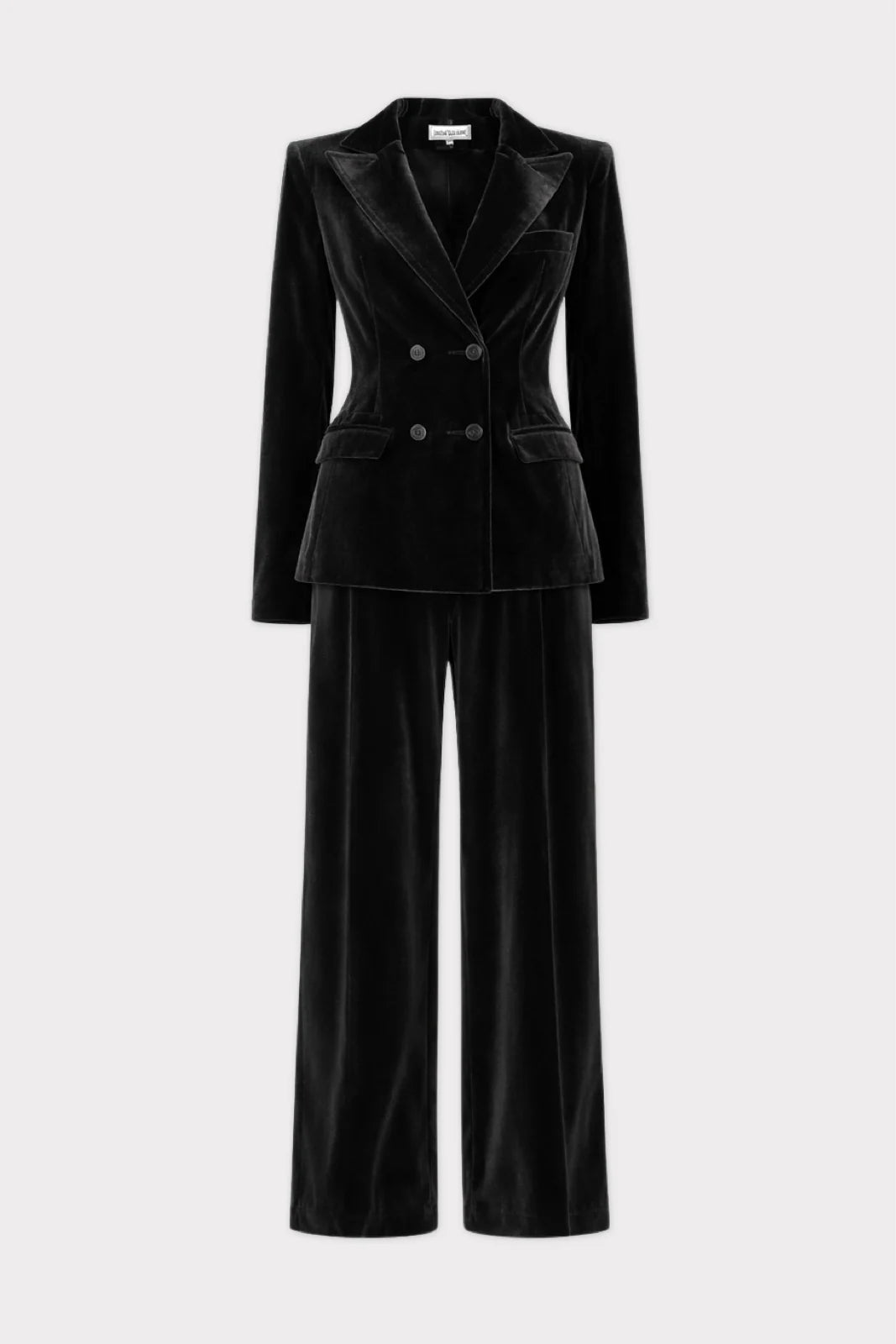 Двубортный жакет · Структурированные плечи · Скульптурная линия талии · Брюки с широкими штанинами · Плавная драпировка · Чёрный