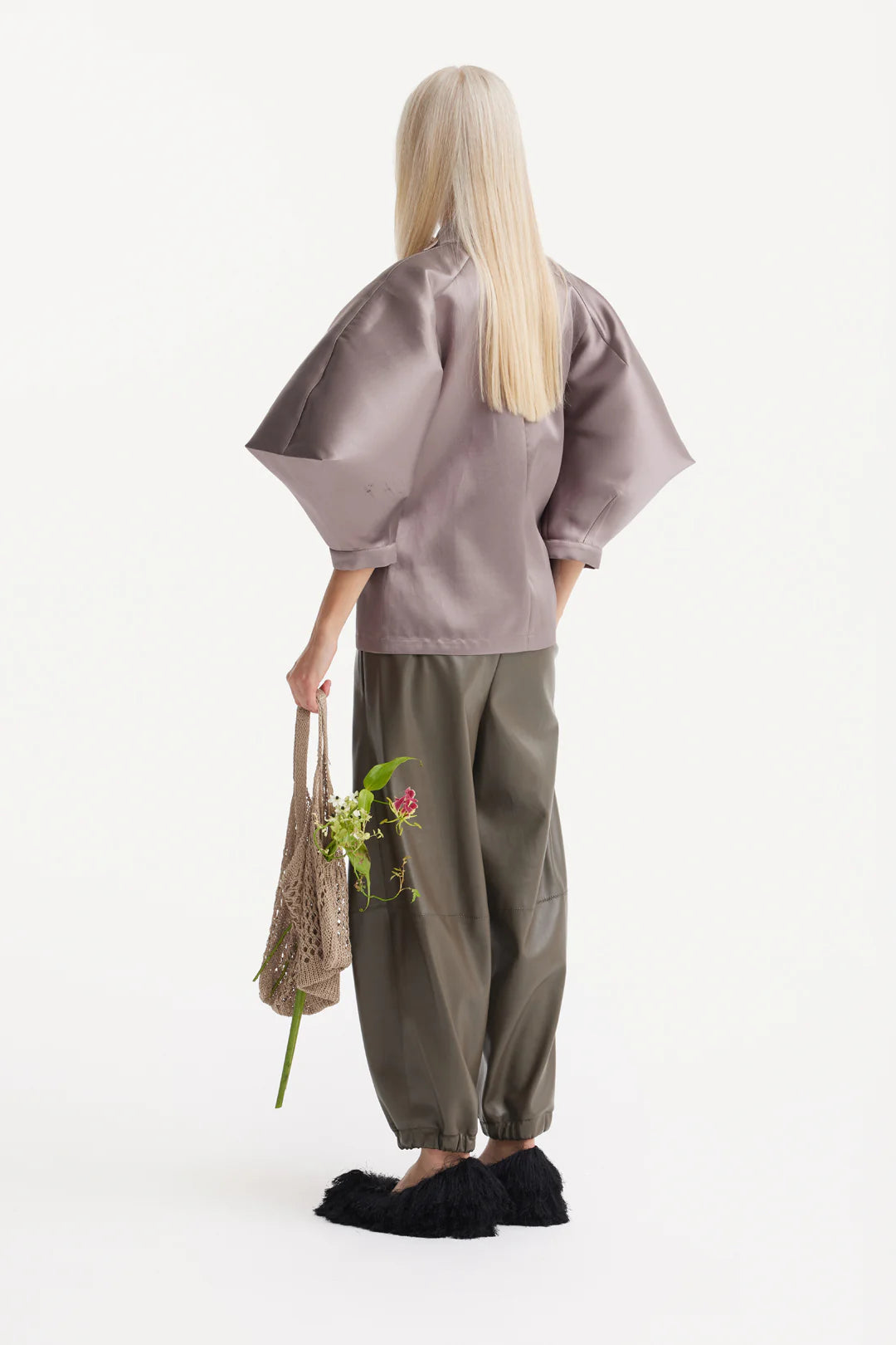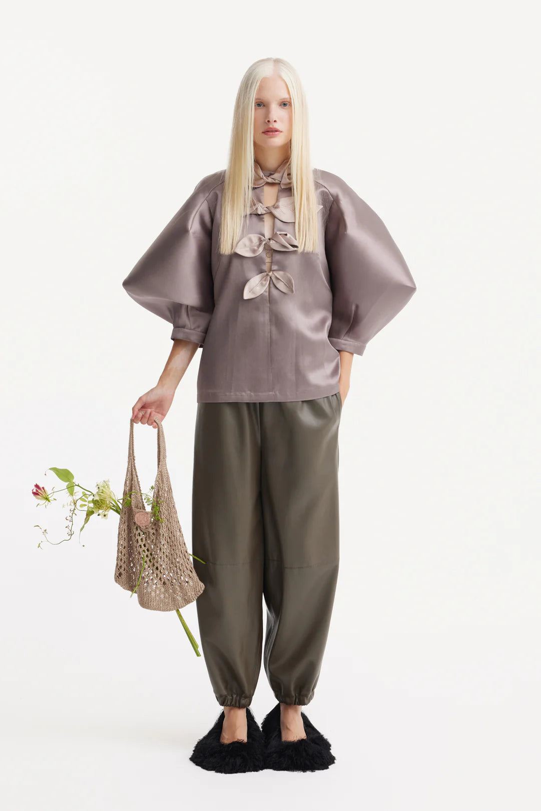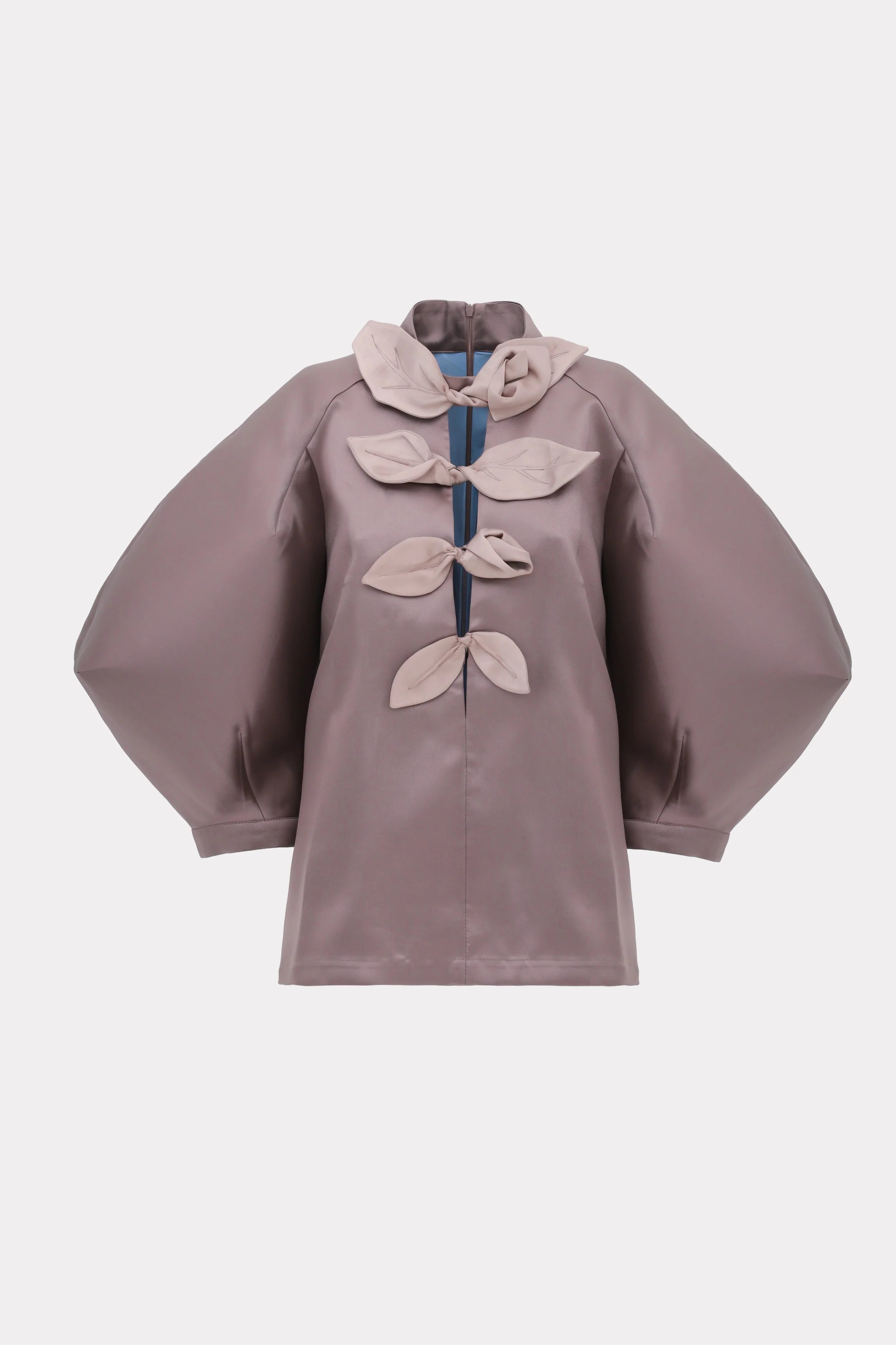 Выразительная акцентная вещь, сочетающая архитектурные формы и женственную утончённость. Изготовлена из ткани с атласным блеском, эта блуза в оттенке тауп отличается объёмными рукавами-баллонами и чётко структурированным силуэтом. Перед украшен скульптурными узлами контрастного бежевого цвета, расположенными вдоль центральной синей полосы, что создаёт утончённую игру текстур и геометрии. Высокий ворот и чистый край подчеркивают современный дизайн. Идеально подходит для вечерних выходов, креативного офисного образа или съёмок — эта блуза отражает фирменный баланс Julia Allert между структурой, мягкостью и индивидуальностью.