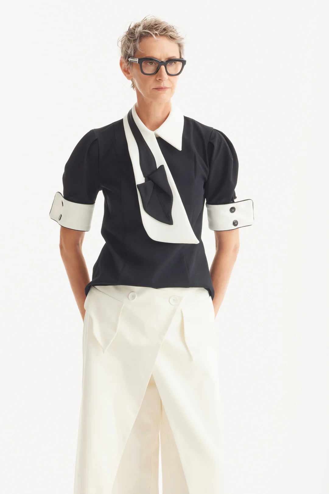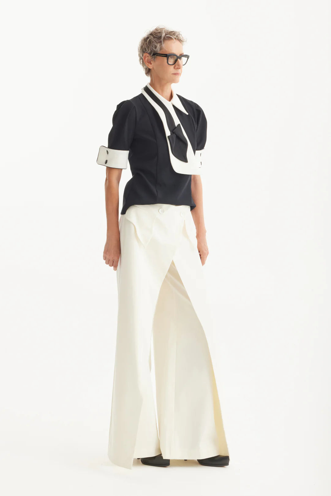 Эта скульптурная чёрная блуза переосмысливает современную классику с акцентом на выразительные детали. Контрастный белый воротник, объемные манжеты и галстук в стиле кутюр в двух тонах придают образу утончённость и креативность. Пышные рукава и приталенный силуэт добавляют структуру, а премиальная ткань обеспечивает комфорт и безупречную посадку. Идеальный выбор для официальных мероприятий, стильной офисной одежды или вечеров, когда хочется выделиться элегантно и смело.