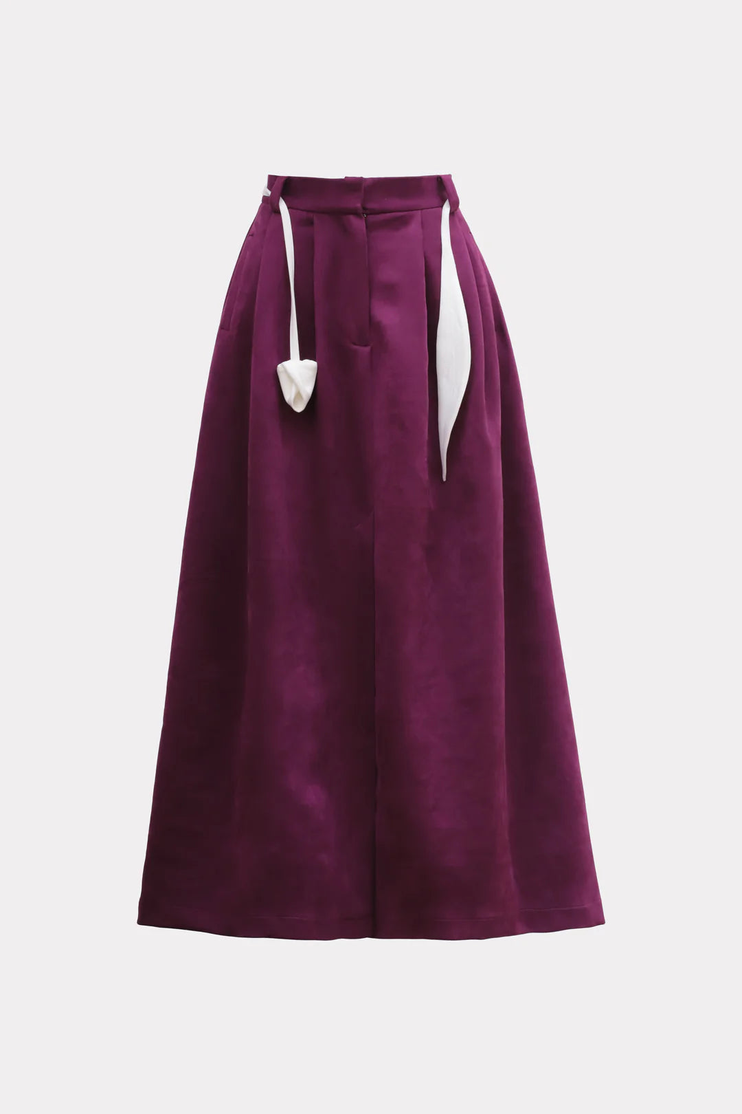 Выражение спокойной уверенности. Эта юбка миди А-силуэта выполнена из мягкой искусственной замши насыщенного фиолетового оттенка. Чистый разрез спереди придаёт лёгкость движению, сохраняя структурность силуэта. Минималистичный пояс акцентирован контрастными завязками из другой ткани, завершёнными скульптурными концами, что добавляет авангардный штрих. Посадка по естественной линии талии и длина до щиколотки визуально вытягивают фигуру, сочетая комфорт и универсальность. Сочетайте её с облегающим трикотажем или объёмными рубашками для современных переходов от дневного к вечернему образу.