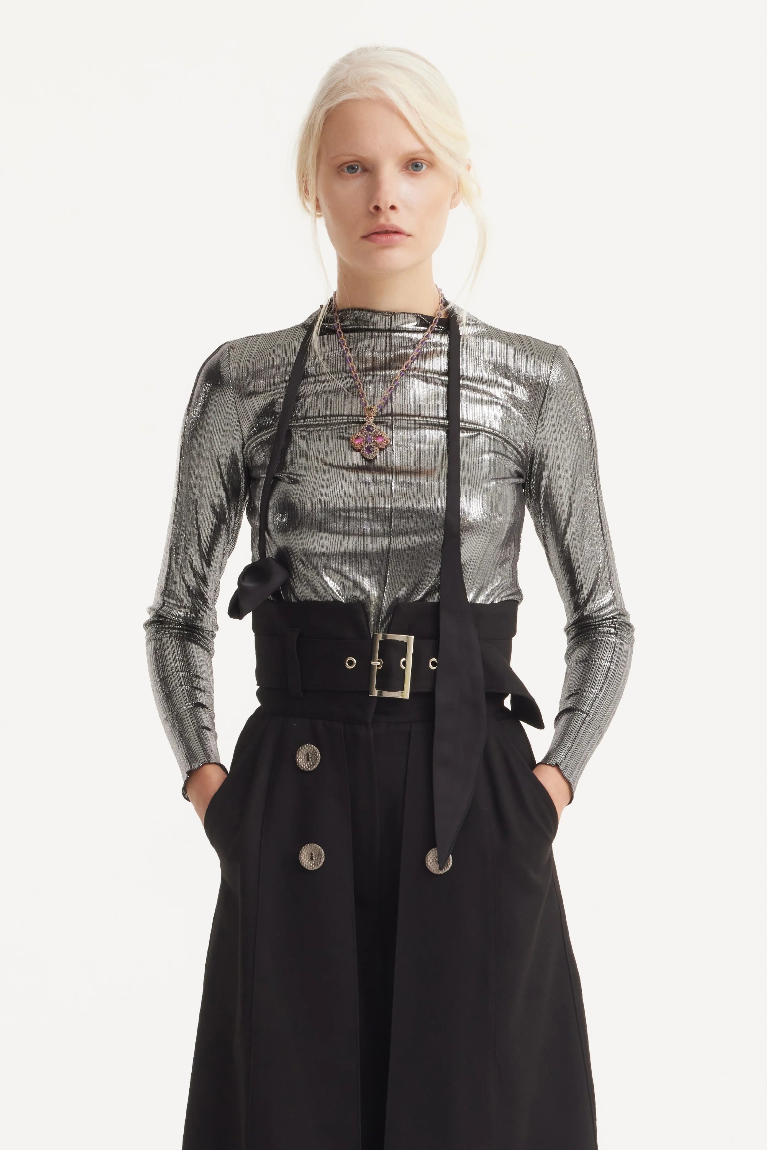 Уникальный эффект фольгирования на ткани придает блузе изысканный и гламурный вид. Он создает неповторимое сияние, благодаря которому вы будете звездой любого мероприятия.