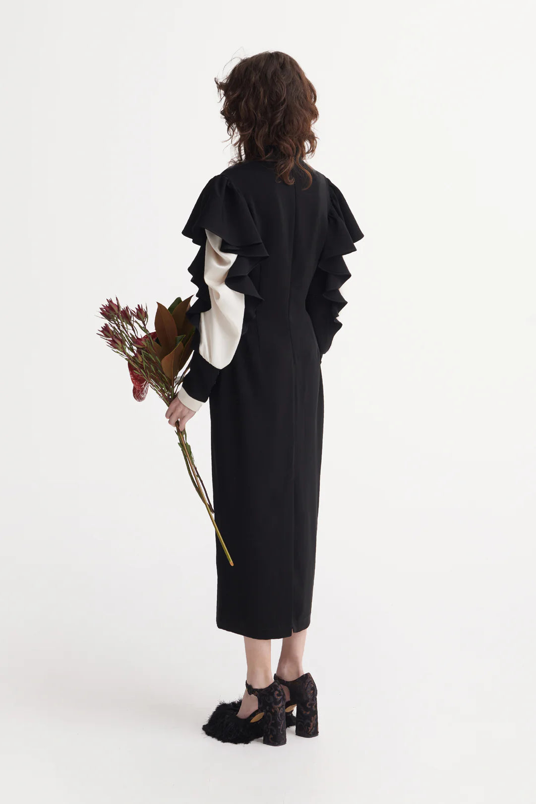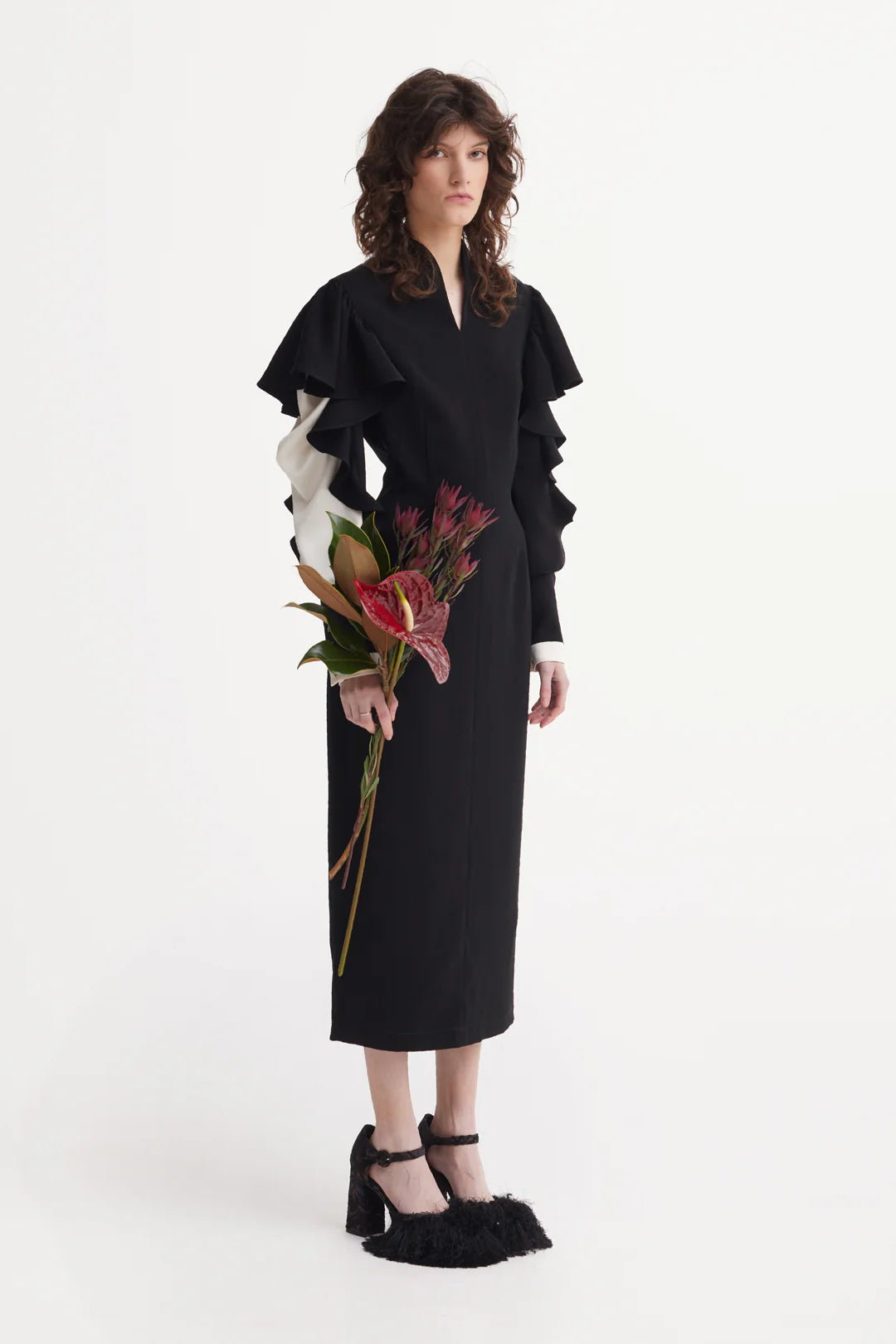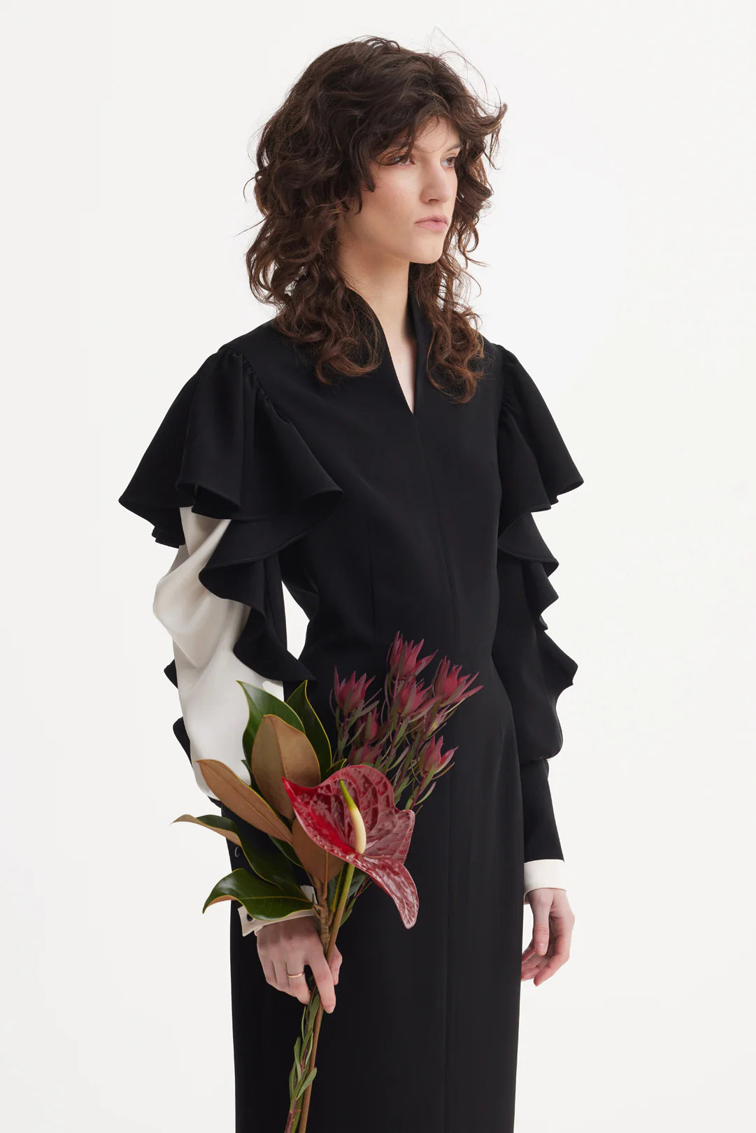 Скульптурное чёрное миди-платье, определяемое архитектурным объёмом и тихой изысканностью. Сшитое из плотной костюмной ткани с гладкой матовой фактурой, оно дополнено выразительными многослойными рюшами, которые спускаются от плеч до середины рукава, создавая динамичную игру формы и движения. Контрастные молочные внутренние рукава добавляют глубину и графичную точность — фирменный диалог Julia Allert между структурностью и мягкостью.