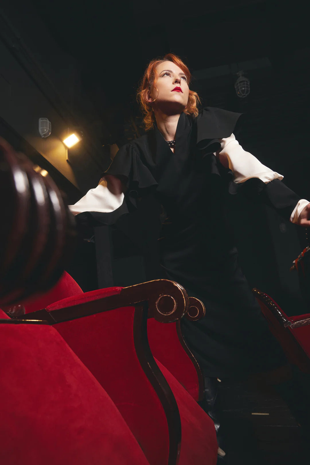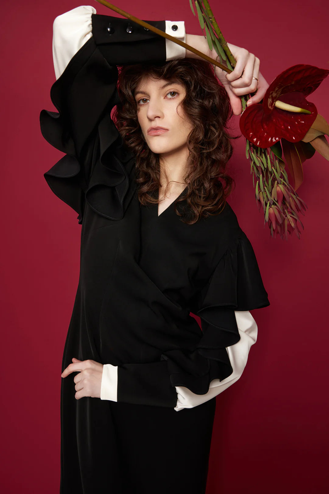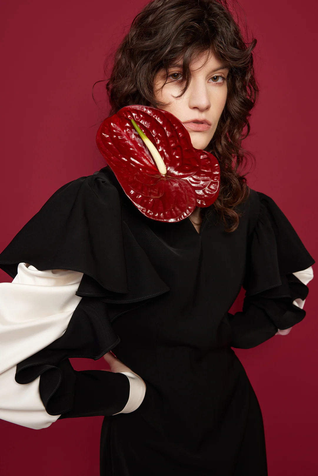 Скульптурное чёрное миди-платье, определяемое архитектурным объёмом и тихой изысканностью. Сшитое из плотной костюмной ткани с гладкой матовой фактурой, оно дополнено выразительными многослойными рюшами, которые спускаются от плеч до середины рукава, создавая динамичную игру формы и движения. Контрастные молочные внутренние рукава добавляют глубину и графичную точность — фирменный диалог Julia Allert между структурностью и мягкостью.