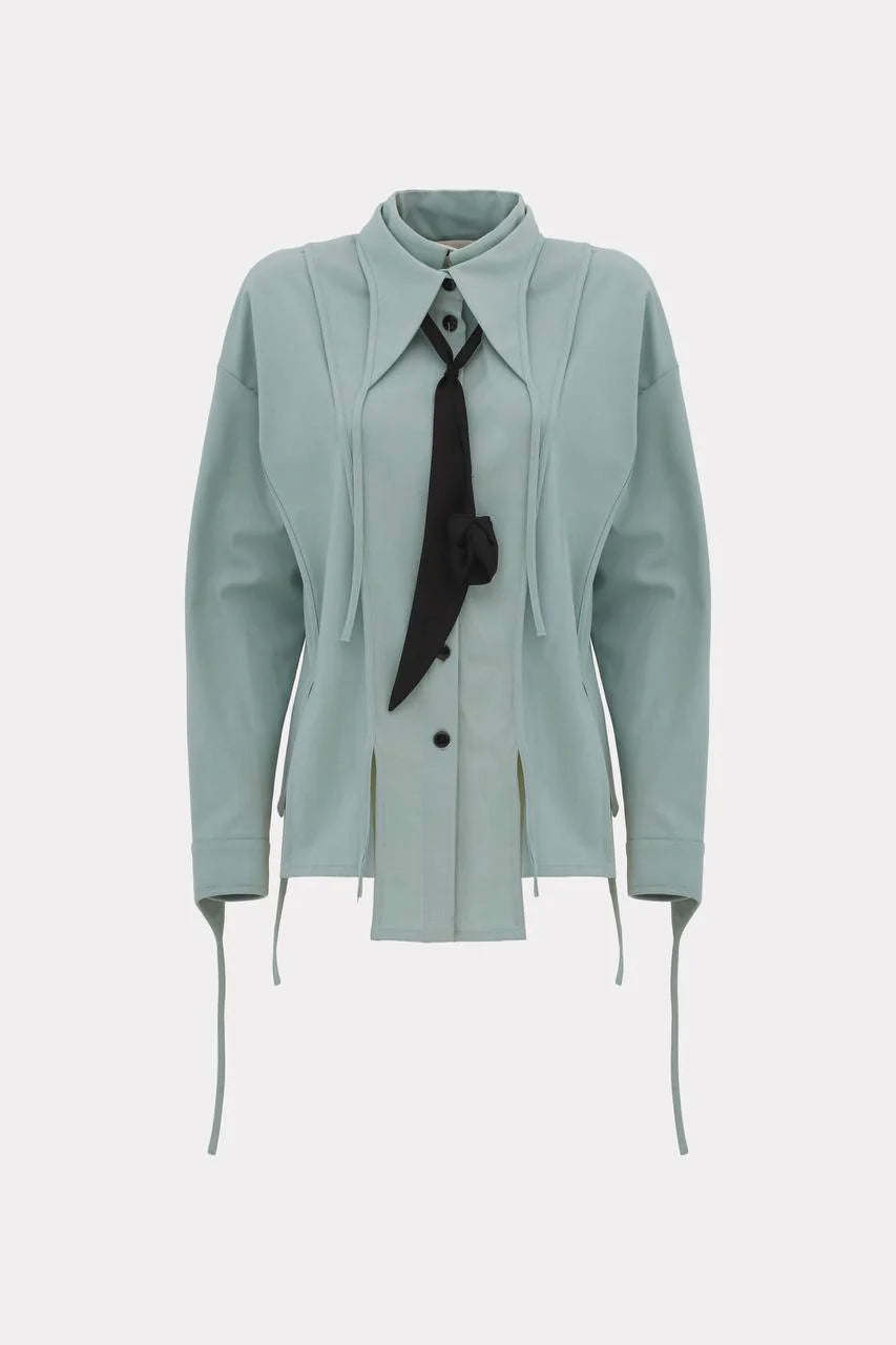 Современная структура встречается с текучим кроем в этой мятно-зелёной блузе. Выполнена из мягкой костюмной ткани, она оснащена удлинёнными шнуровками, которые формируют силуэт и создают скульптурный объём. Застёжка на пуговицы спереди и чёткий воротник уравновешивают женственность и точность. Нежные контрастные детали и пришитый чёрный галстук добавляют современный акцент. Идеально подходит для делового гардероба или эффектных многослойных образов, легко переходя от дневного к вечернему стилю.